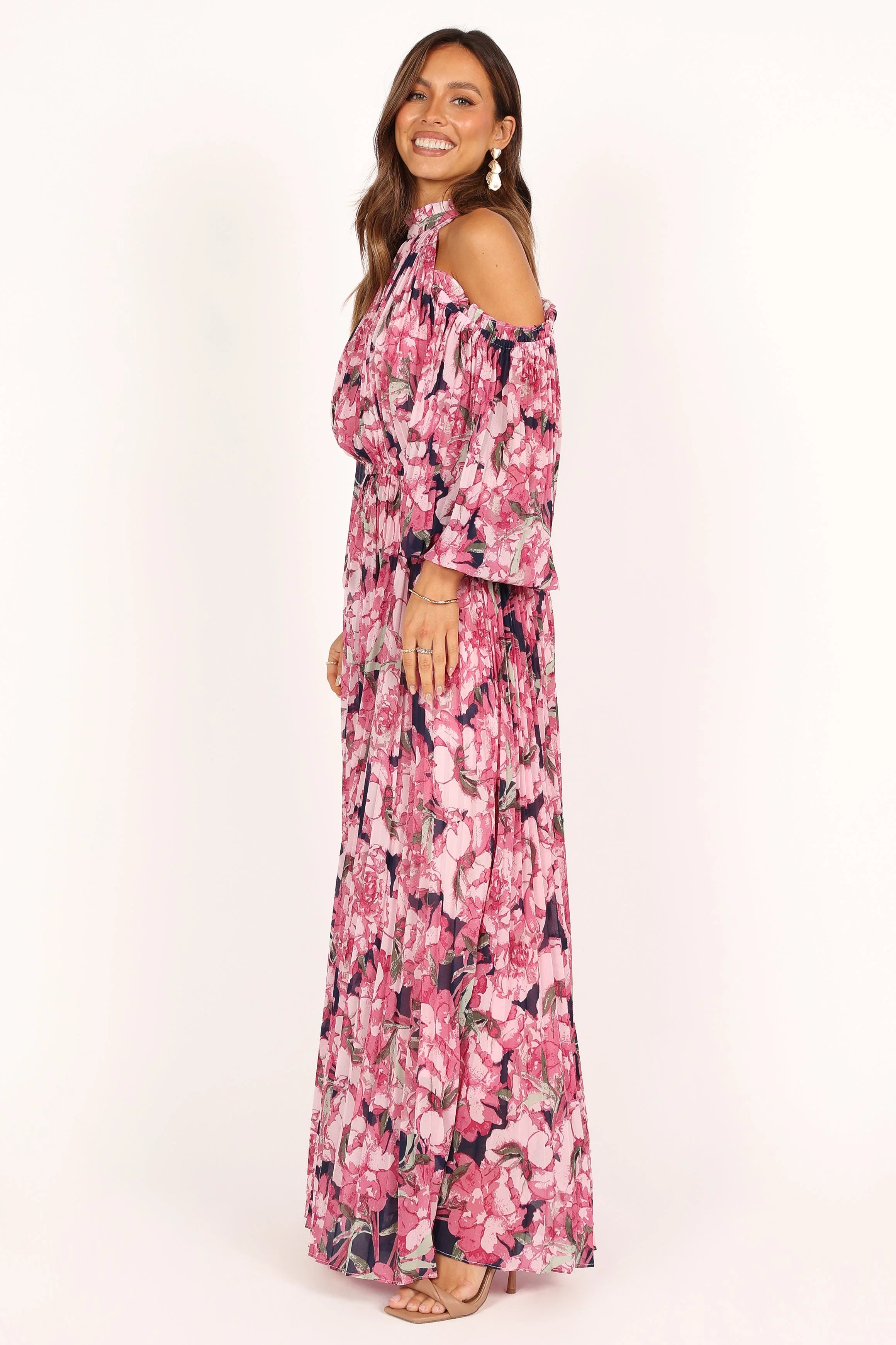 DETAILS Show your style in this maxi length dress! This beautiful piece features a high neckline, long sleeves with elasticised cuff and an exposed off shoulder design. The elasticised waistband creates the perfect fit and provides you with extra comfort.
