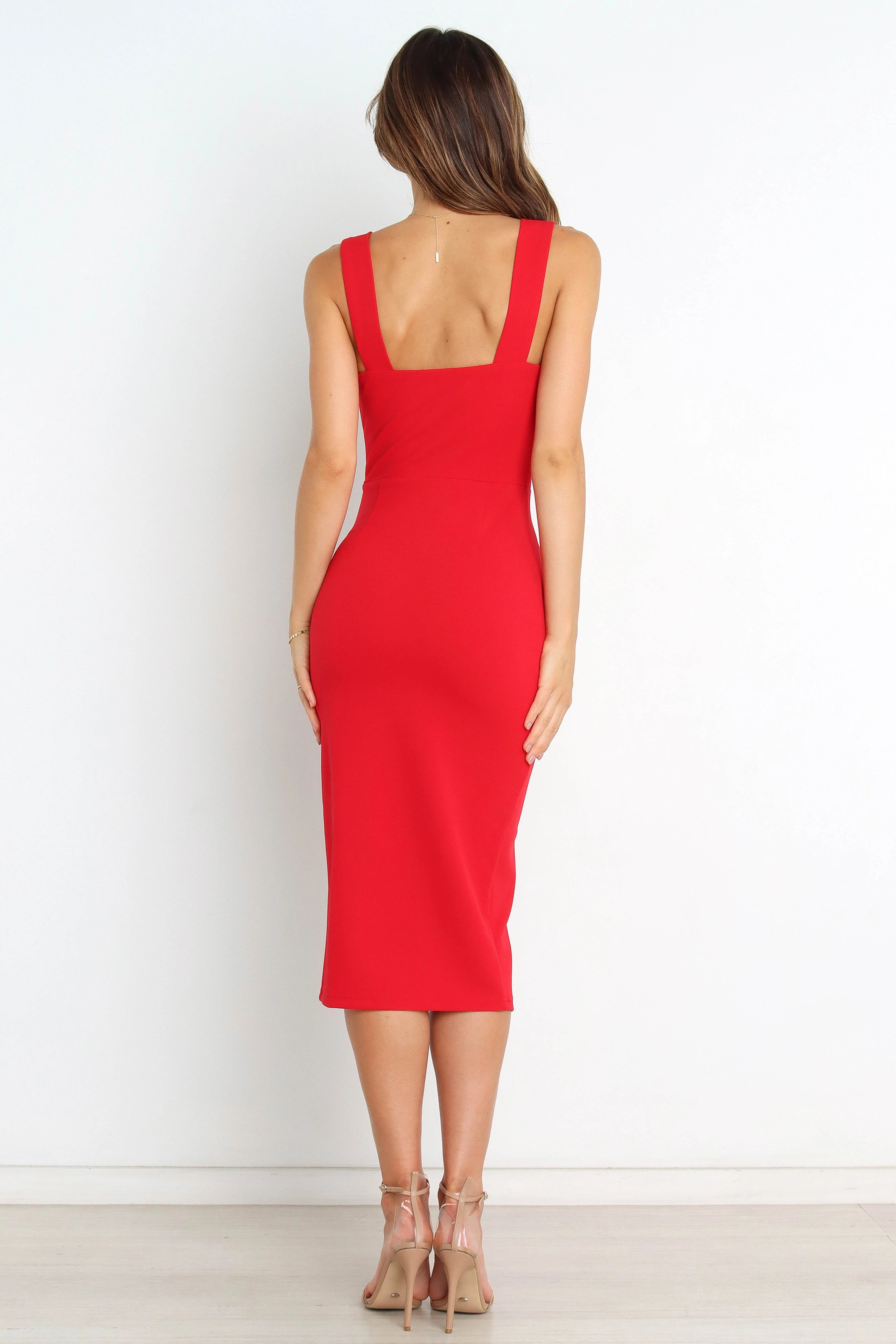 DETAILS The Hyatt Dress is perfect for any special occasion. The style falls to a midi length with a front slit, creating a stunning silhouette that is sure to turn heads. Pair it with your favorite heels and purse!