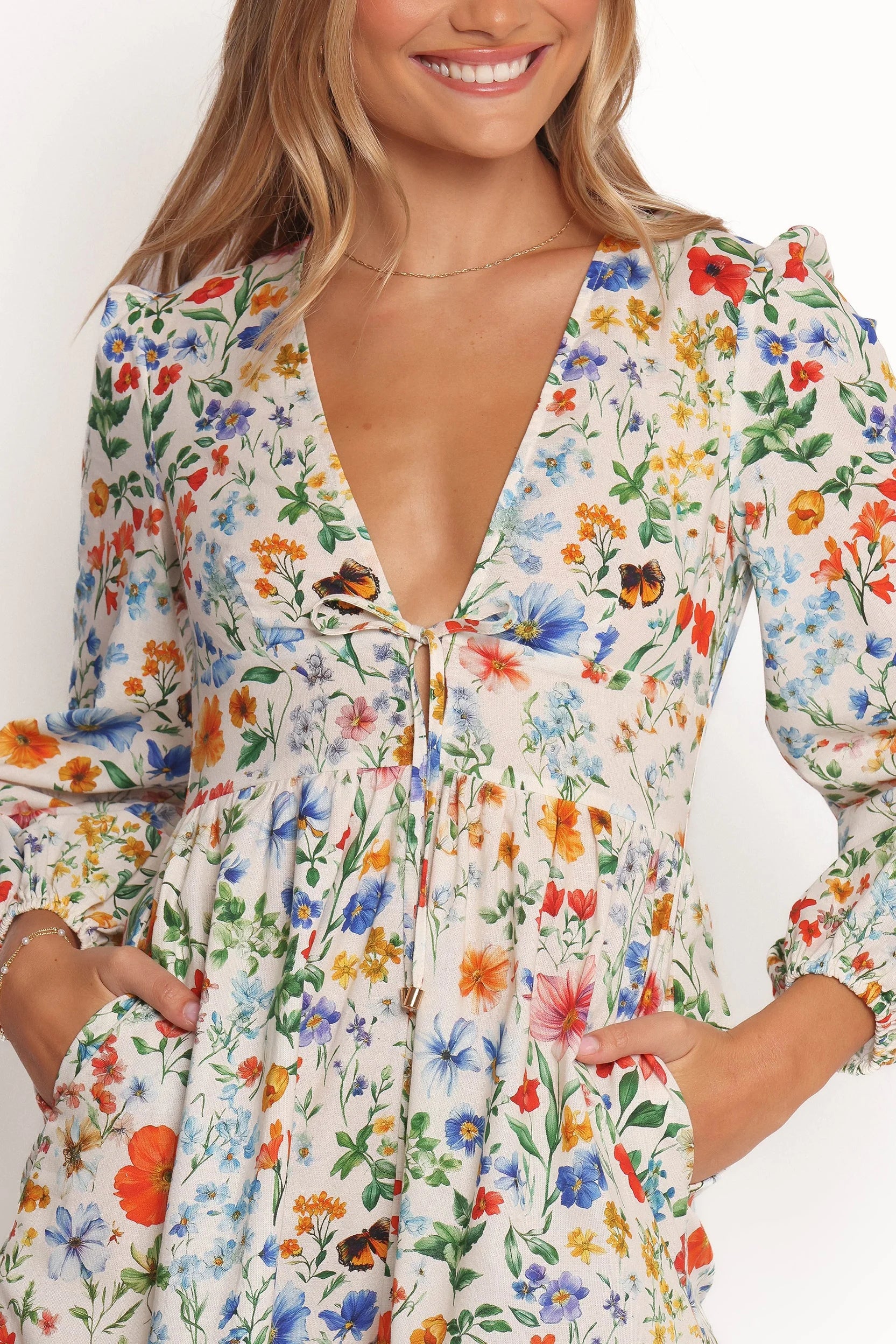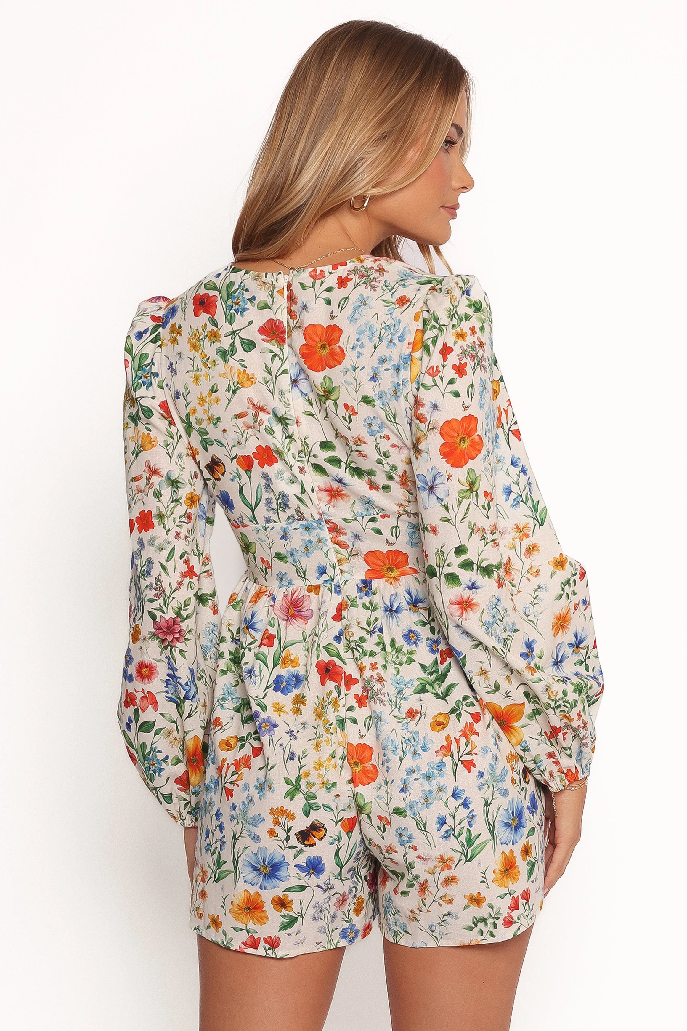 DETAILS Elevate your style game with the Irisa Long Sleeve Romper in Garden Floral. Featuring a flattering above-knee length, a chic V-neckline, and long sleeves with elasticized cuffs, it's effortlessly versatile. Dress it up with heels or keep it casual with sneakers the choice is yours!