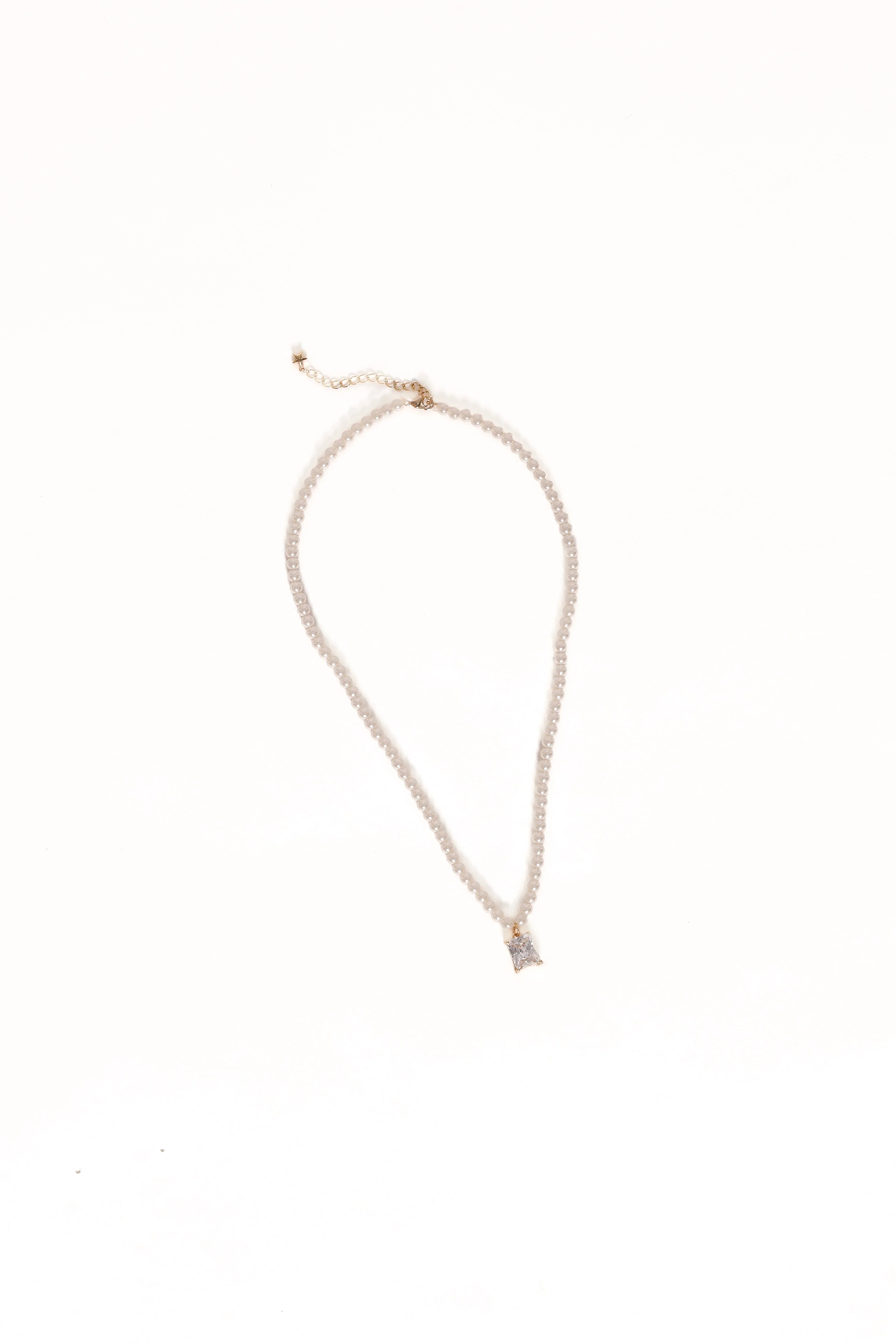 DETAILS This faux pearl necklace showcases an eye-catching emerald cut pendant, perfectly framed by sleek gold hardware that adds a touch of luxury to any outfit. The thoughtful clasp closure ensures a secure fit, while the extension chain allows you to customise the length to suit your neckline or layer with other favourites.