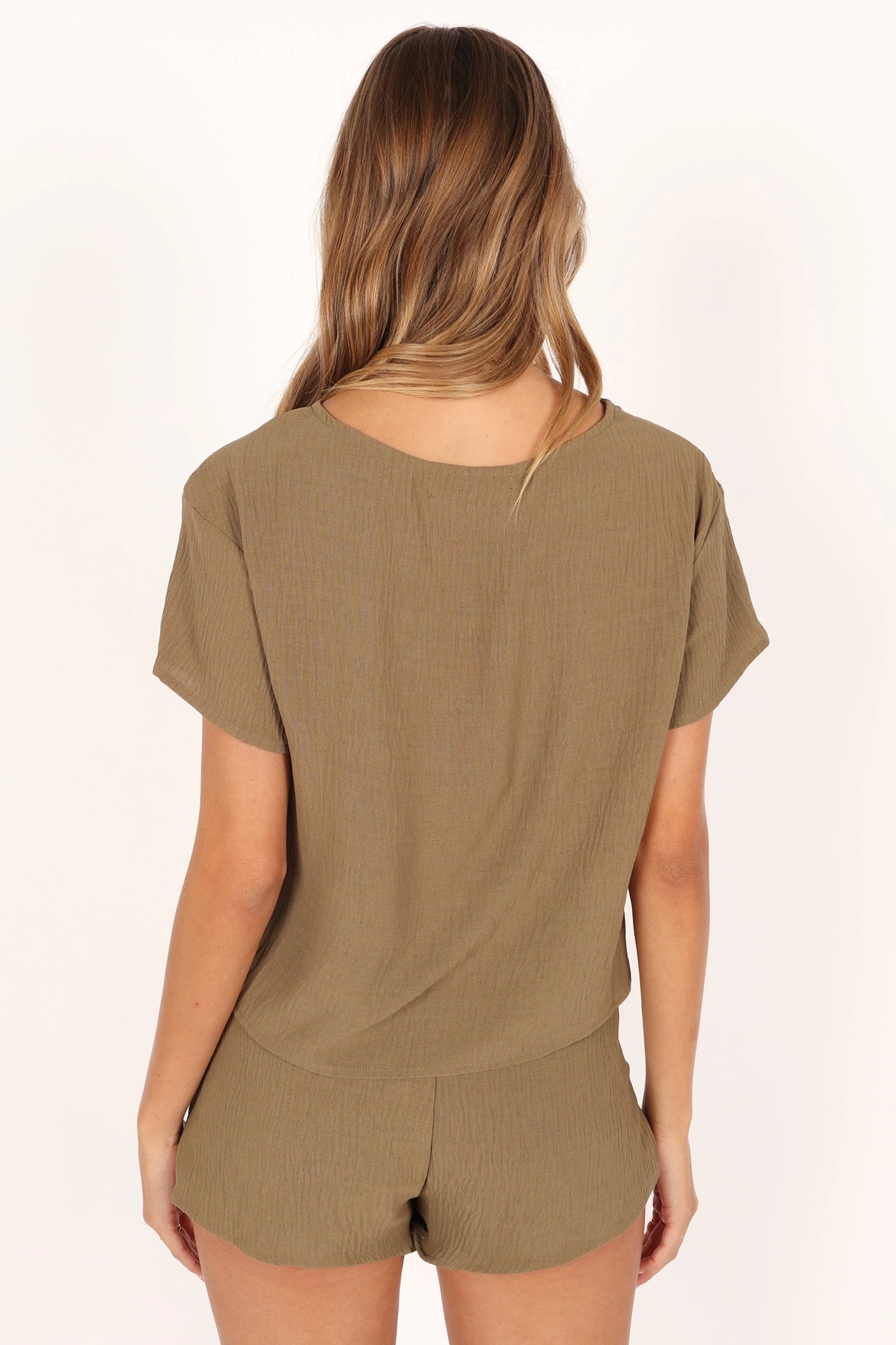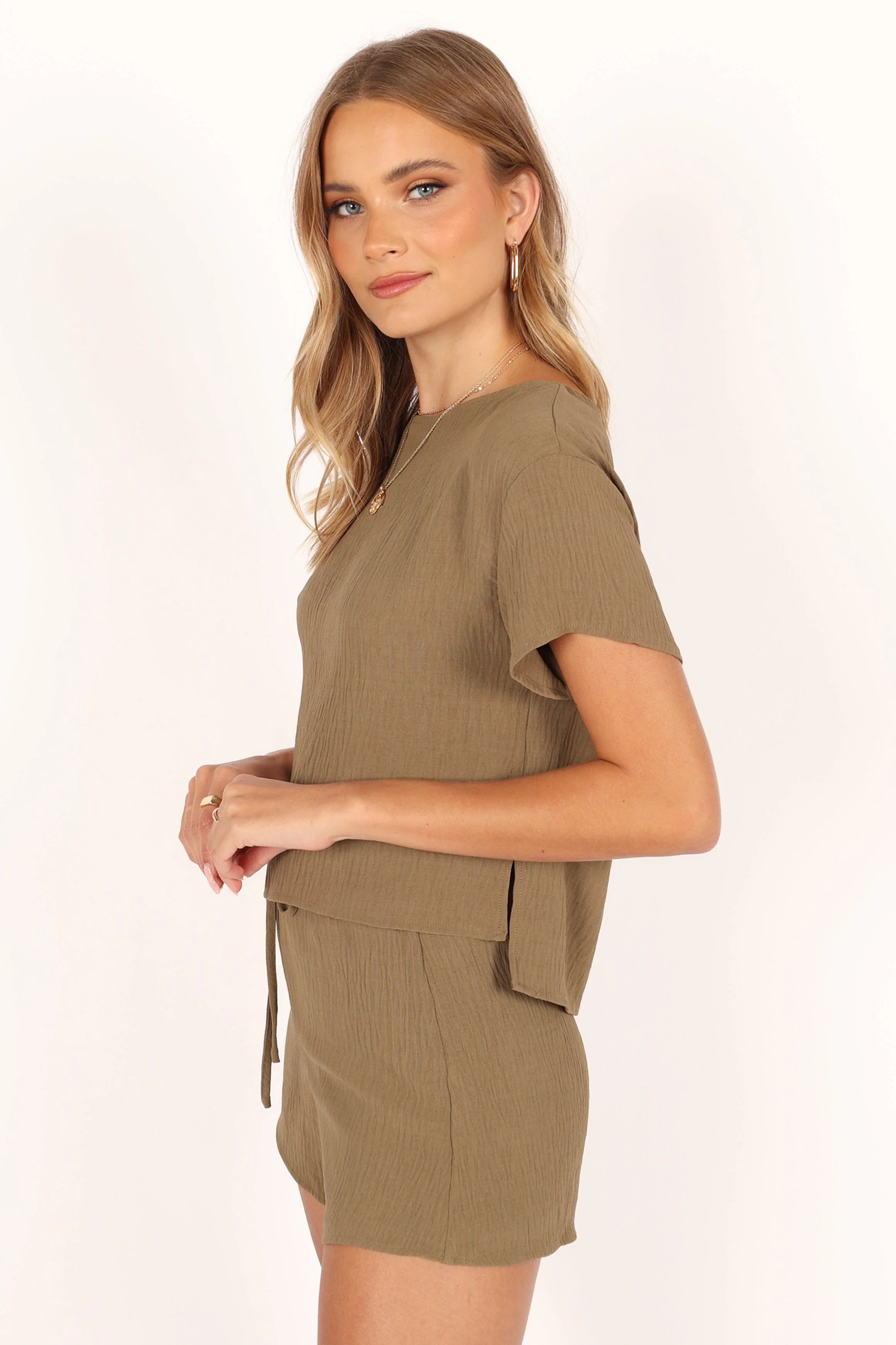 DETAILS This top and shorts set is sure to make you stand out! Perfect for a day of lounging in the sun, this two-piece features a round neckline, short sleeves and side splits. It has a relaxed fit for a casual, comfortable look.