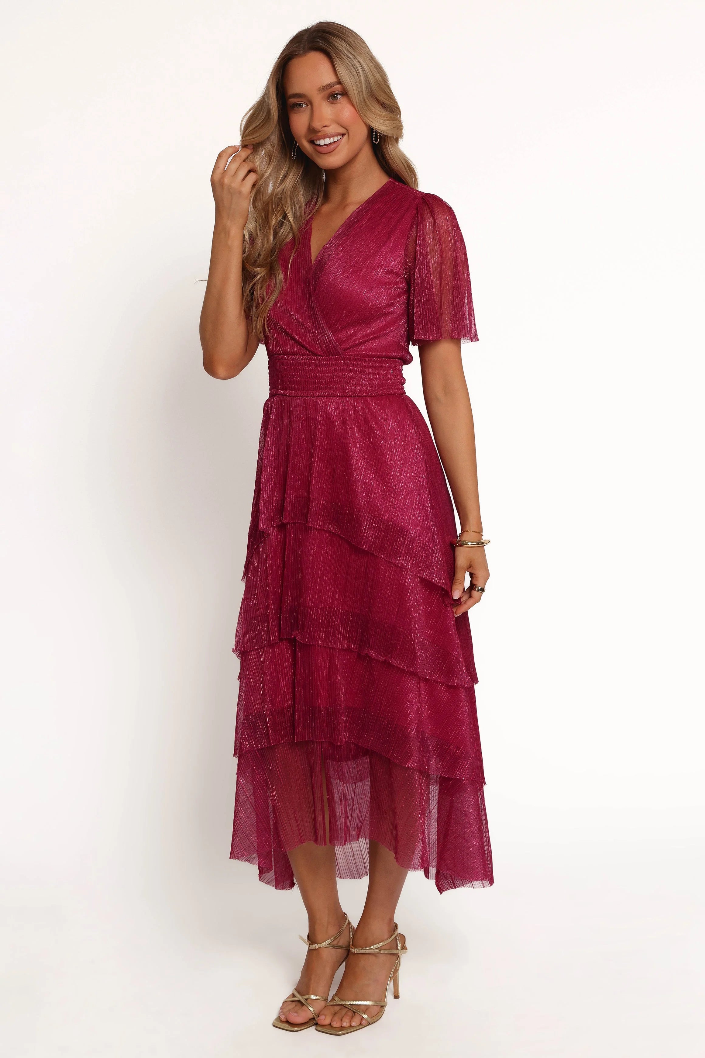 DETAILS Slip into something effortlessly chic with the Jasmin Midi Dress in Pink. This stunning piece features a plisse midi dress style that exudes elegance and movement. The v-neckline with a faux wrap bust adds a touch of sophistication, while the sheer short sleeves provide a delicate, airy feel that's perfect for any season.