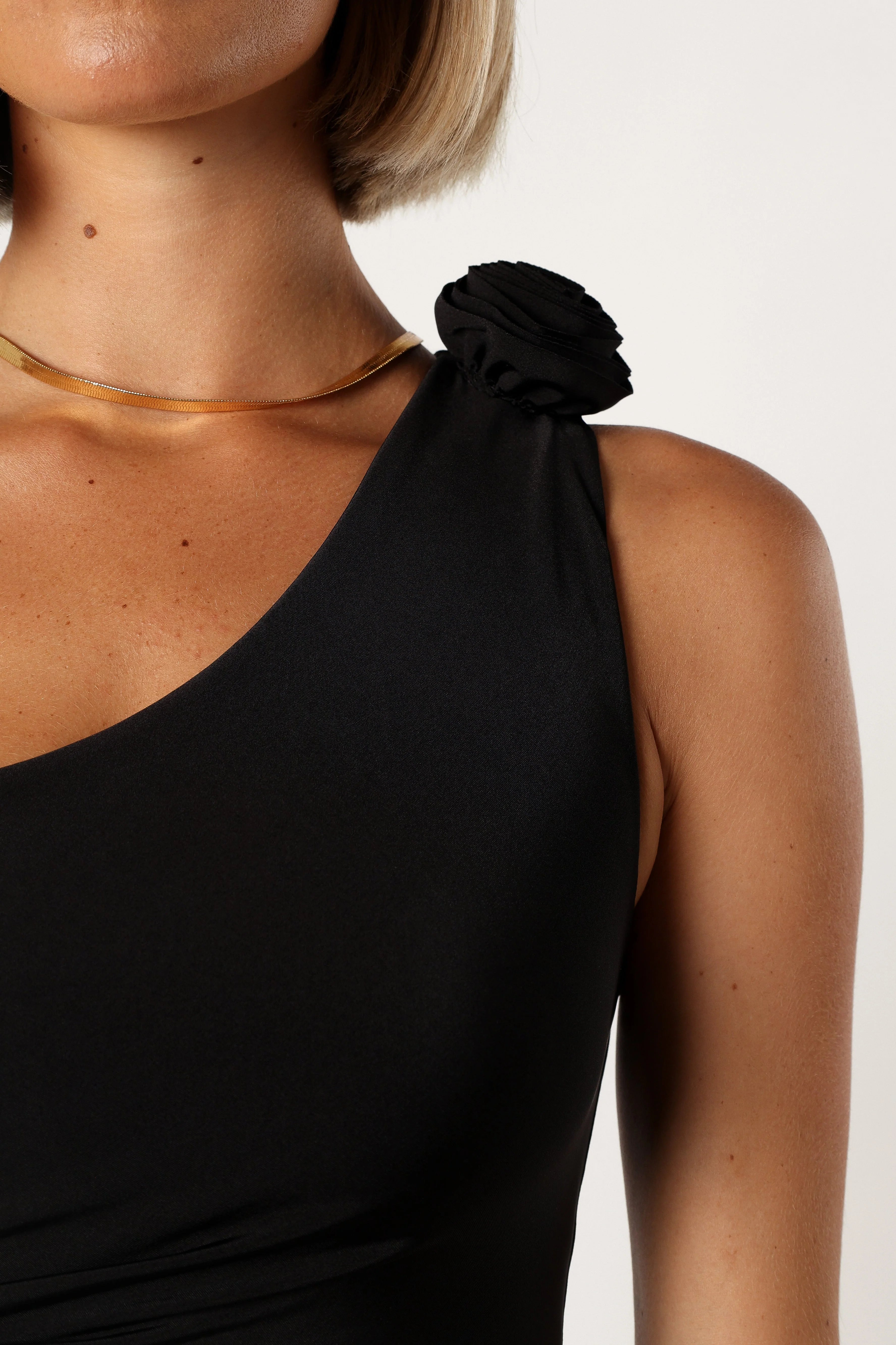 DETAILS Dance the night away in our one shoulder Javier midi dress! Featuring a sleeveless, ruched side detail, and stretchy material in black This playful yet sophisticated dress also features non detachable flowers, perfect for any party or special occasion.