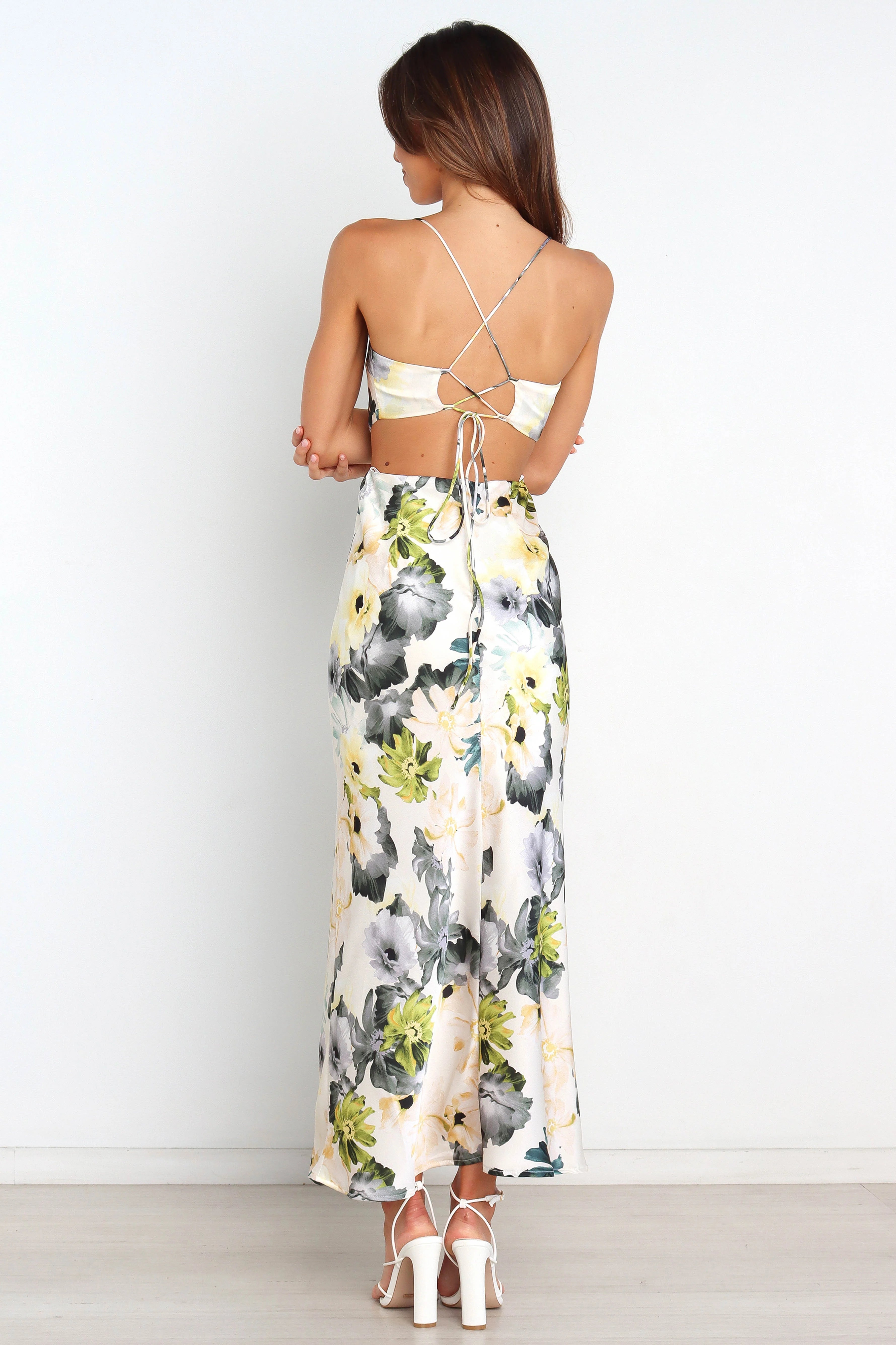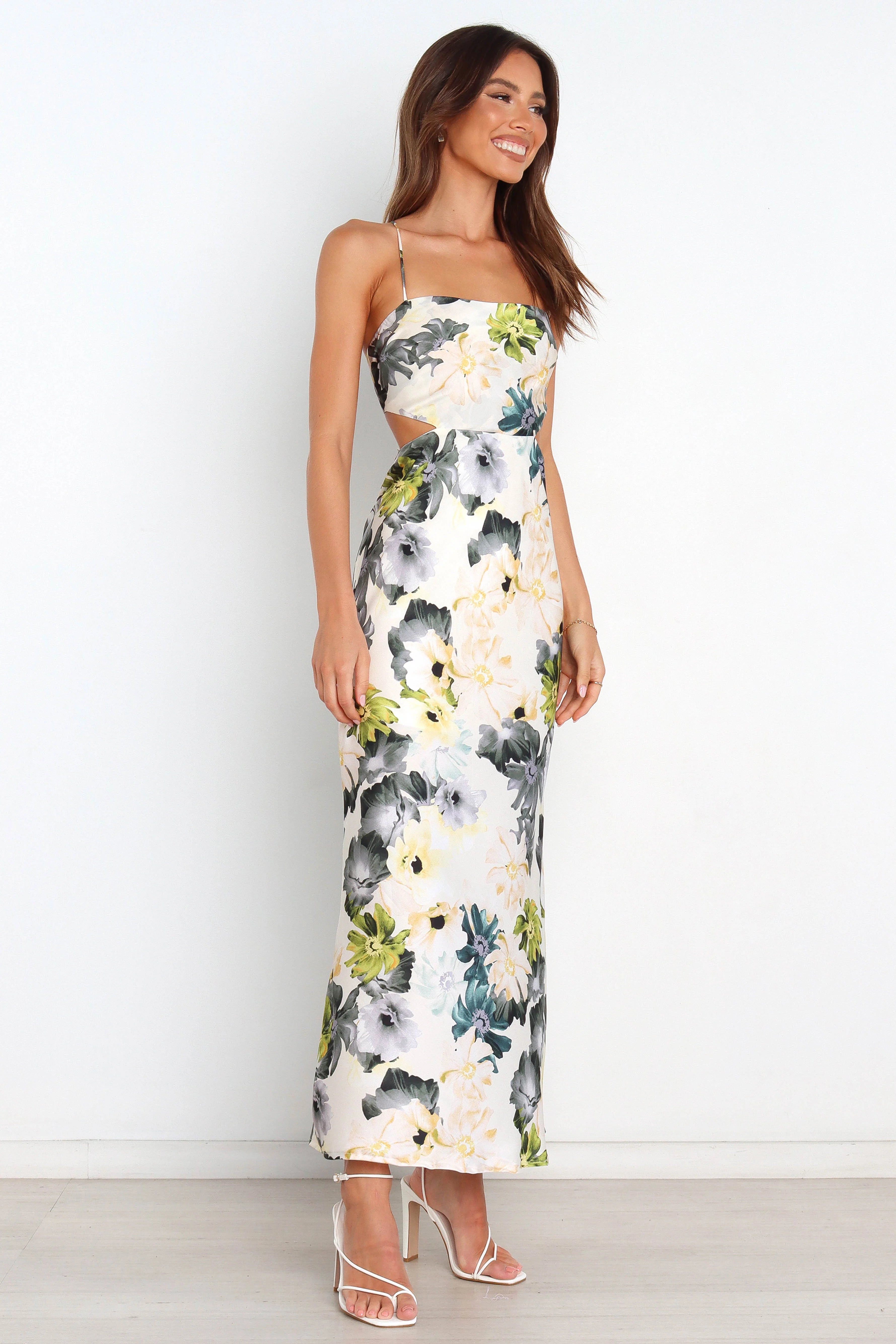 DETAILS Party season calls for the perfect dress and we've got you covered! This stunning maxi length dress is sure to turn heads. The halter neckline features a flattering tie close and backs onto an eye-catching cross over feature that will wow your friends.