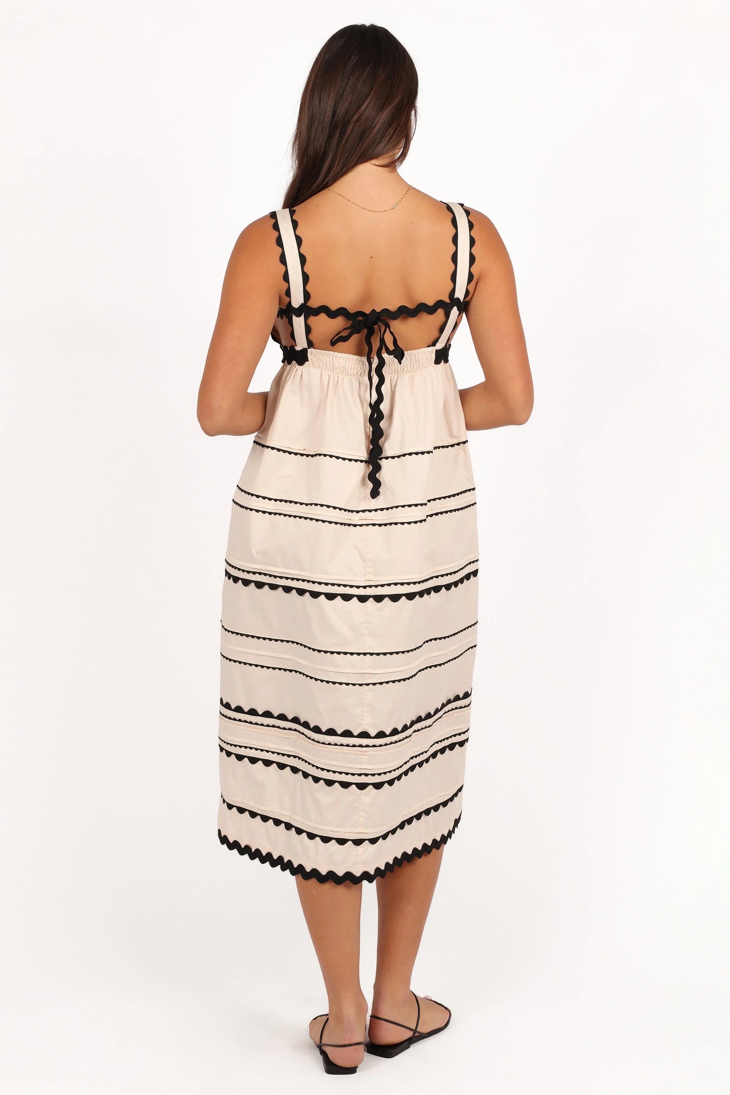 | DETAILS The Jeanie Midi Dress in Natural is a delightful addition to any wardrobe, effortlessly combining style and comfort. This dress features a midi length, making it versatile for both casual and more formal occasions. The flattering v-shaped neckline is complemented by non-adjustable straps adorned with charming ric rac trim.