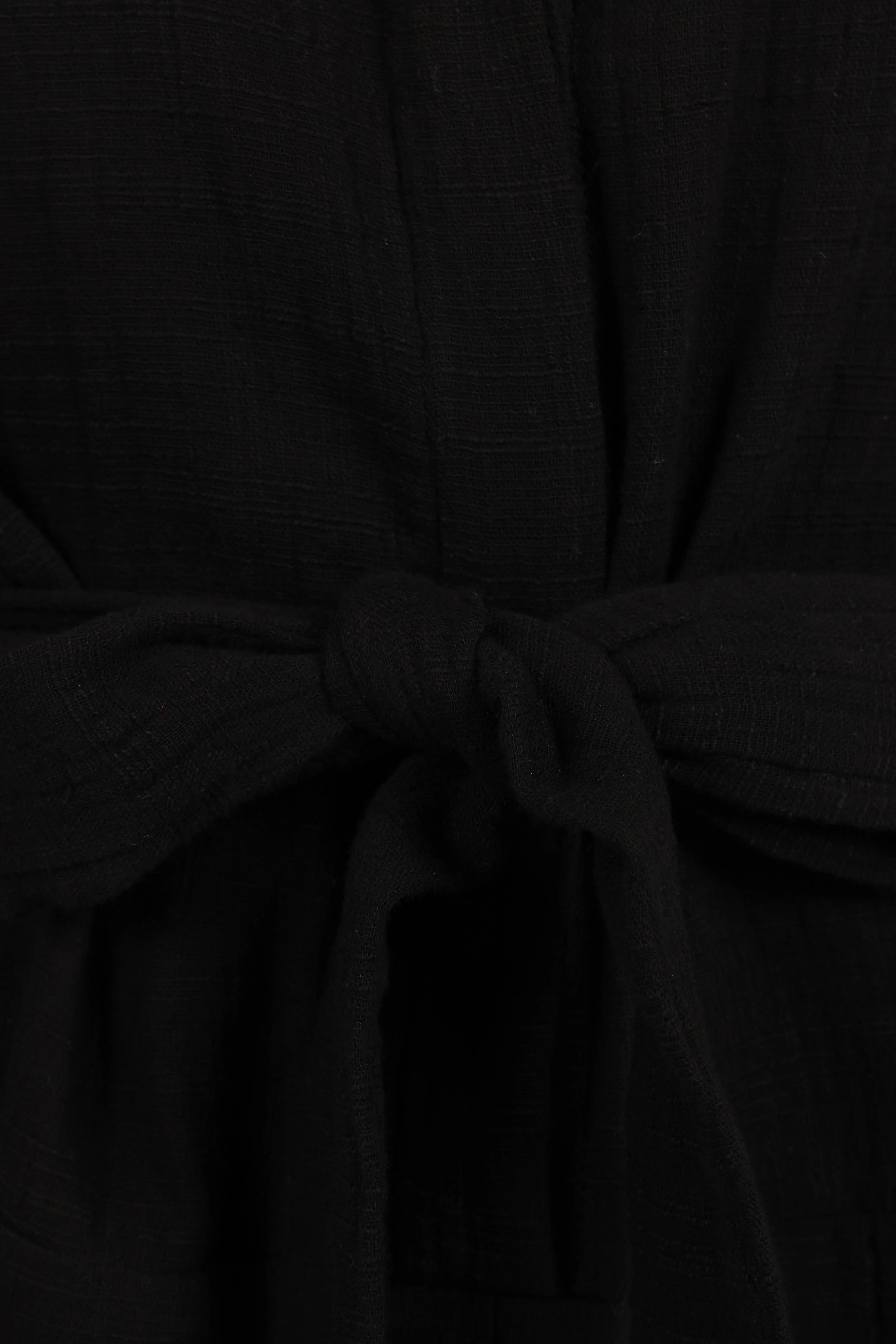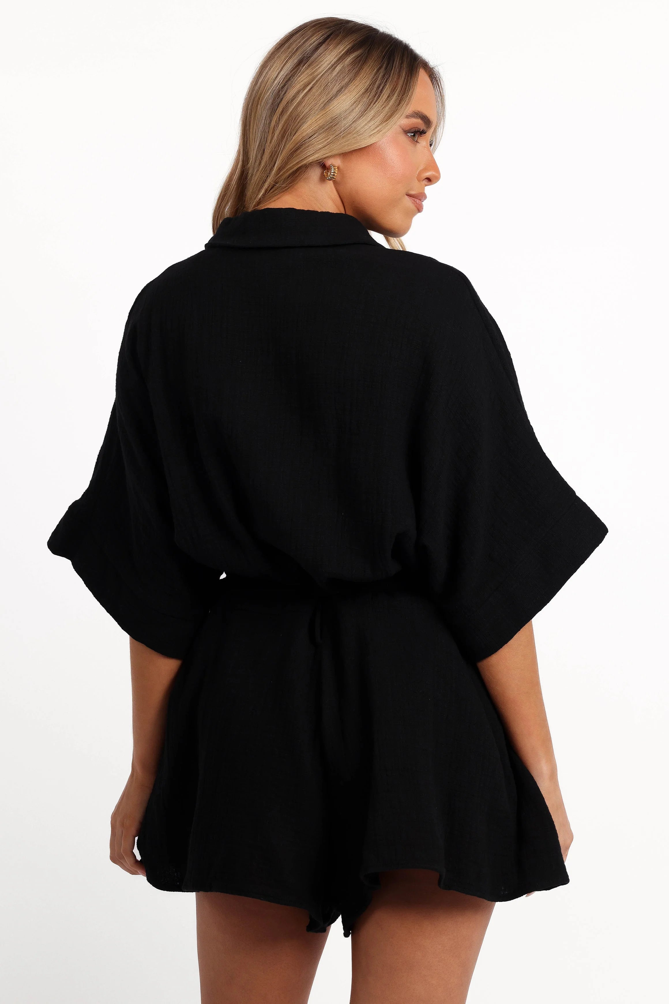 | DETAILS Introducing the Jemmy Romper in Black - a delightful mix of comfort and style. The playful spread collar effortlessly complements the flattering v neckline. Featuring short sleeves, detachable waist tie, and functional buttons down the front.