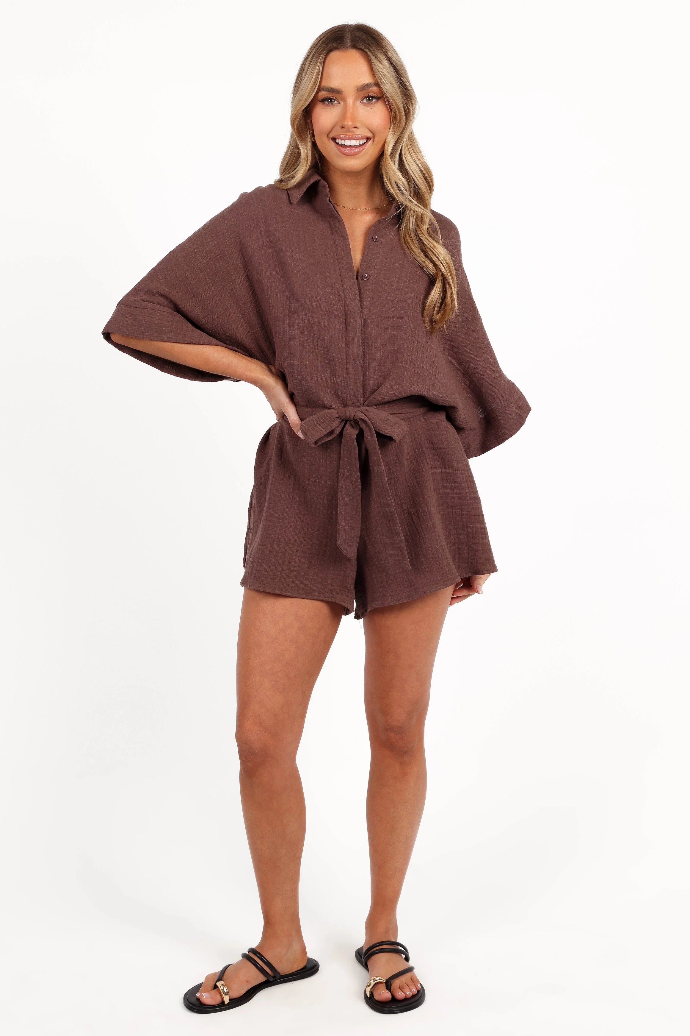 | DETAILS Introducing the Jemmy Romper in Chocolate Brown - a delightful mix of comfort and style. The playful spread collar effortlessly complements the flattering v neckline. Featuring short sleeves, detachable waist tie, and functional buttons down the front.