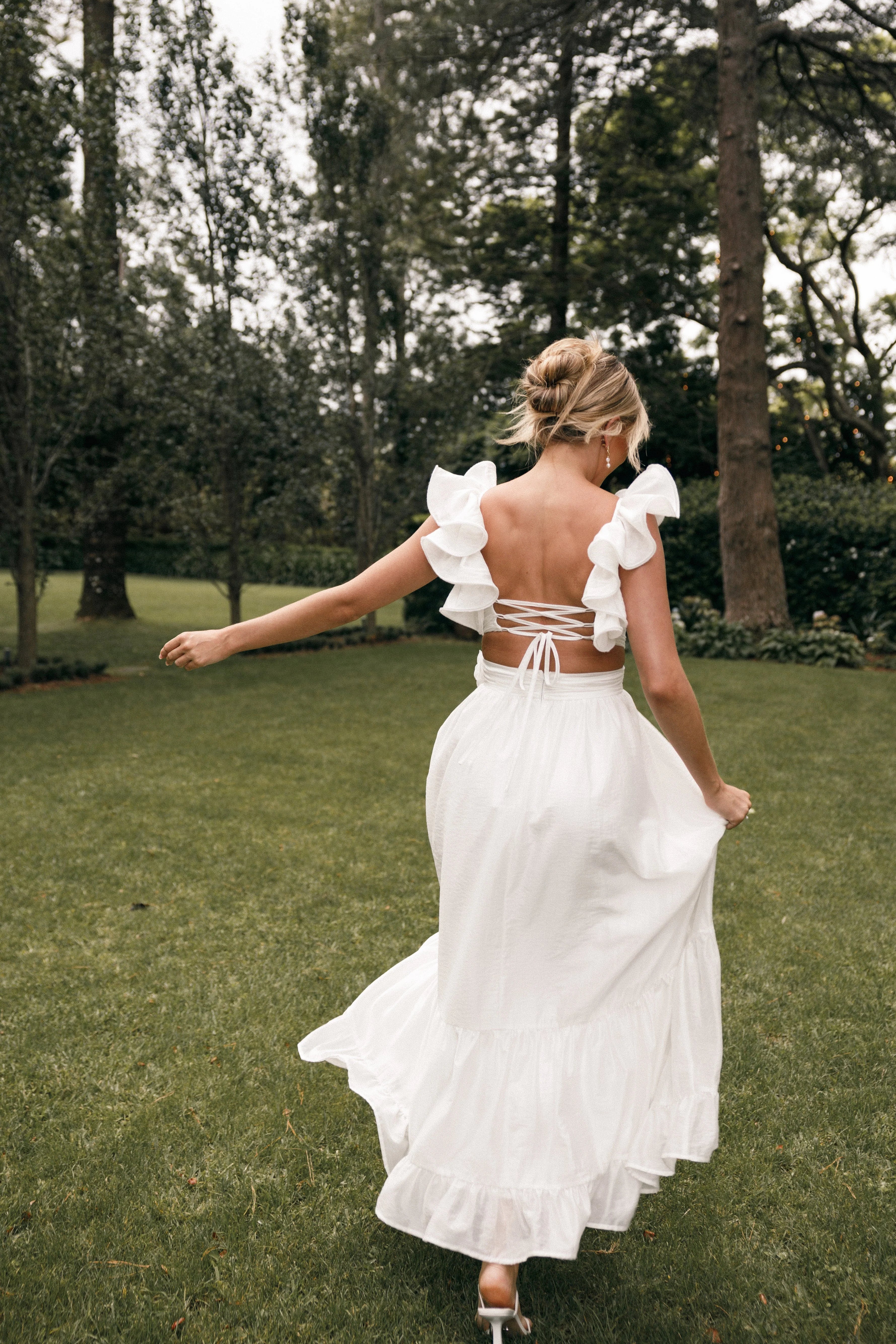 DETAILS Embrace elegance with our Josey midi dress, featuring a stunning deep V neckline, chic non-adjustable straps, and beautiful ruffle detailing. Perfect for any occasion, this dress boasts an exquisite crossover back tie closure and a seamless invisible zip.