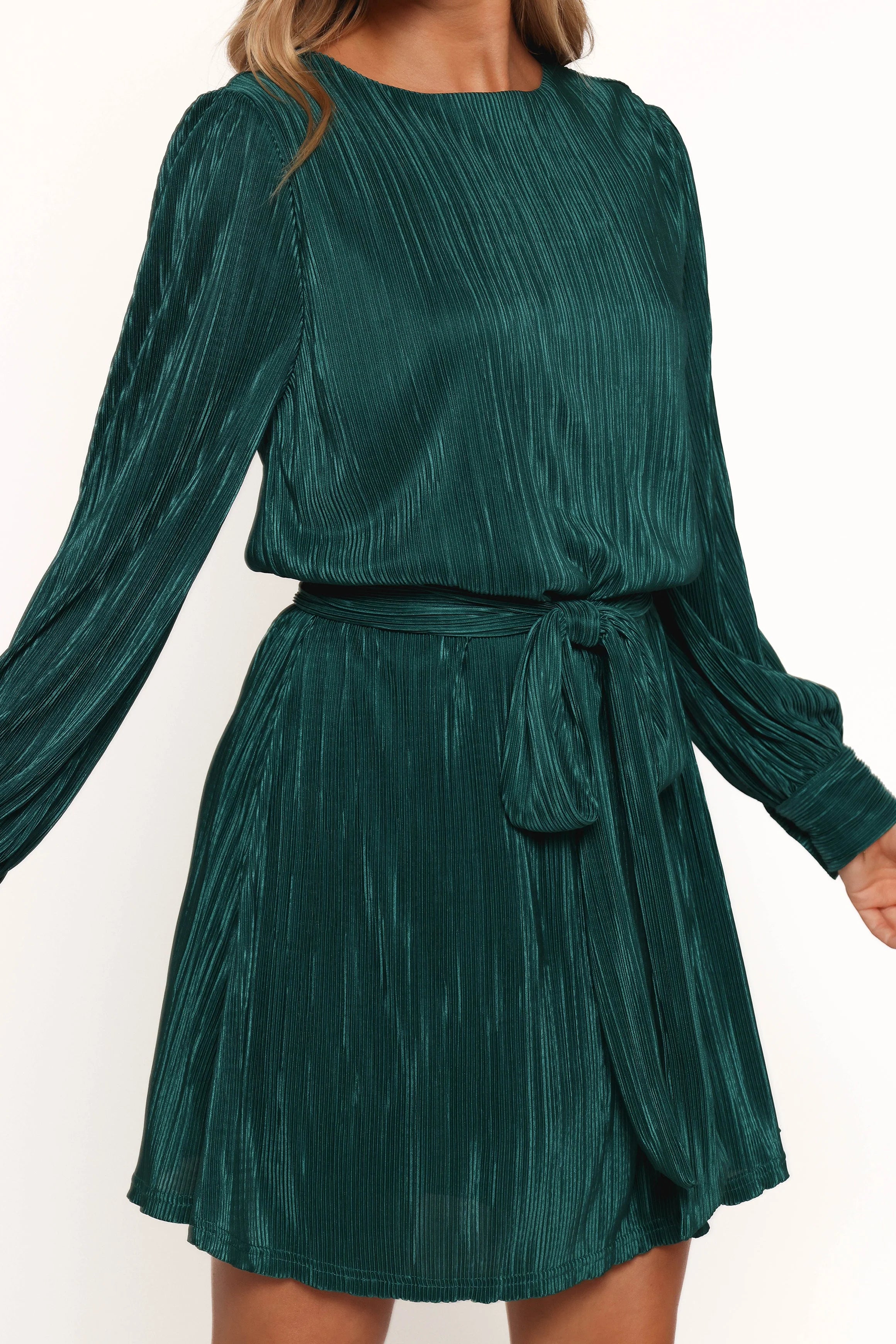 | DETAILS Crafted from lush plisse material, this dress offers a textured elegance that dances with every move you make. The mini length adds a touch of modernity, perfectly complemented by the round neckline and long sleeves with chic button-close cuffs.