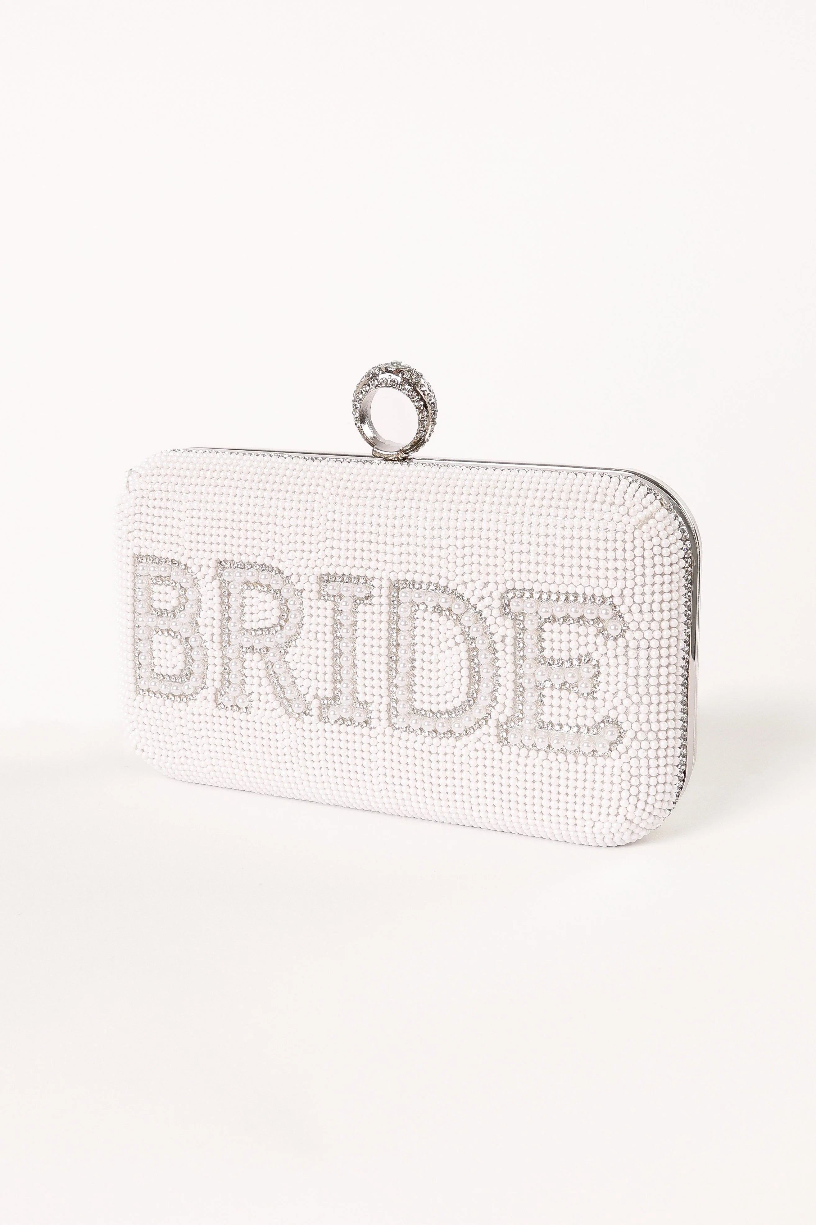 | DETAILS This bridal essential boasts a refined clutch design, tastefully embellished for that touch of glitz. Its silver hardware complements the pristine white, while the secure push lock clasp keeps your essentials intact. The bag comes with a detachable shoulder strap, offering versatility to match your ever-changing bridal moods.