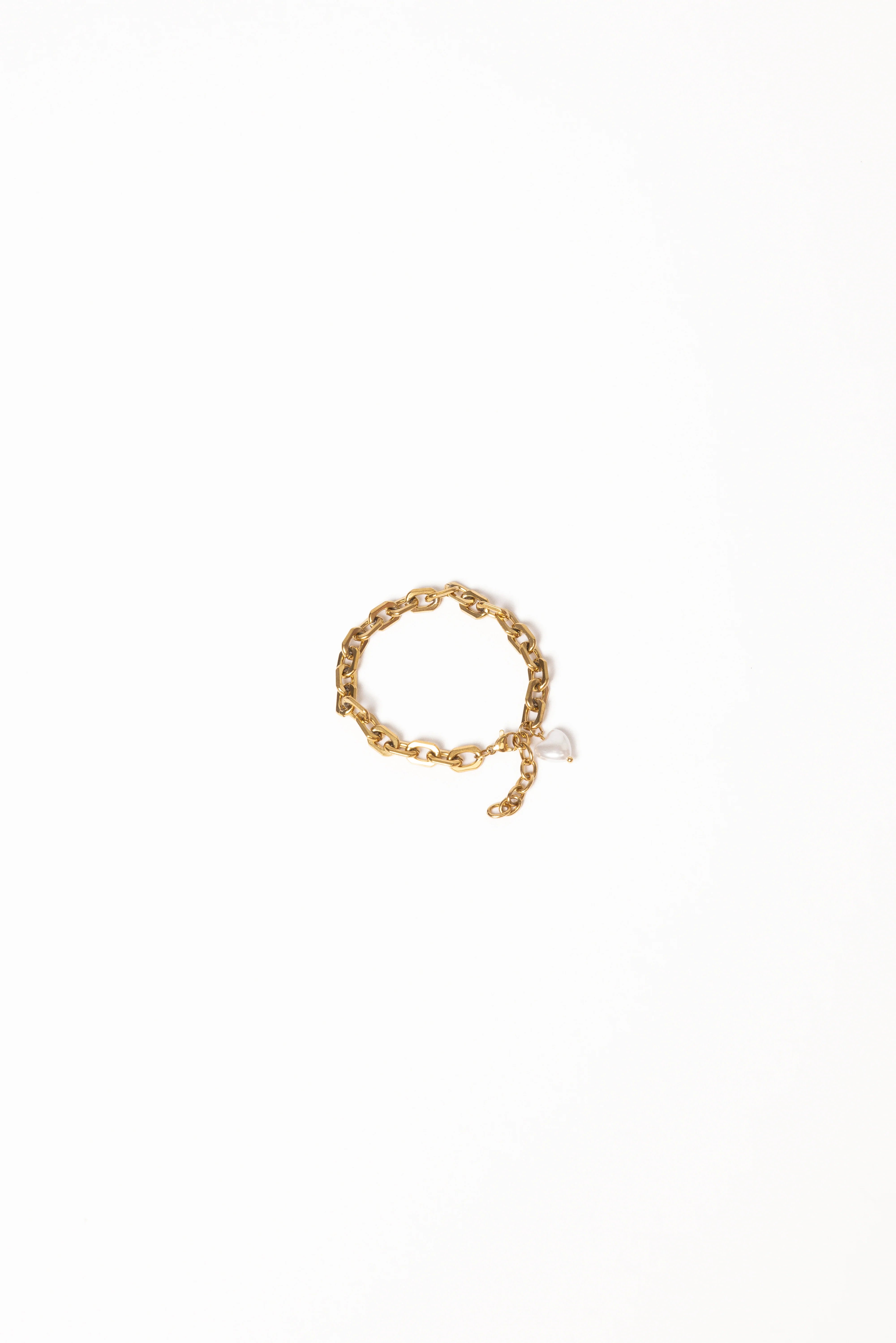 DETAILS Add a touch of timeless elegance to your look with the Kaelani Bracelet in Gold Pearl. Featuring a chic gold link chain paired with a dainty faux pearl heart charm, this bracelet is the perfect blend of classic and modern design.