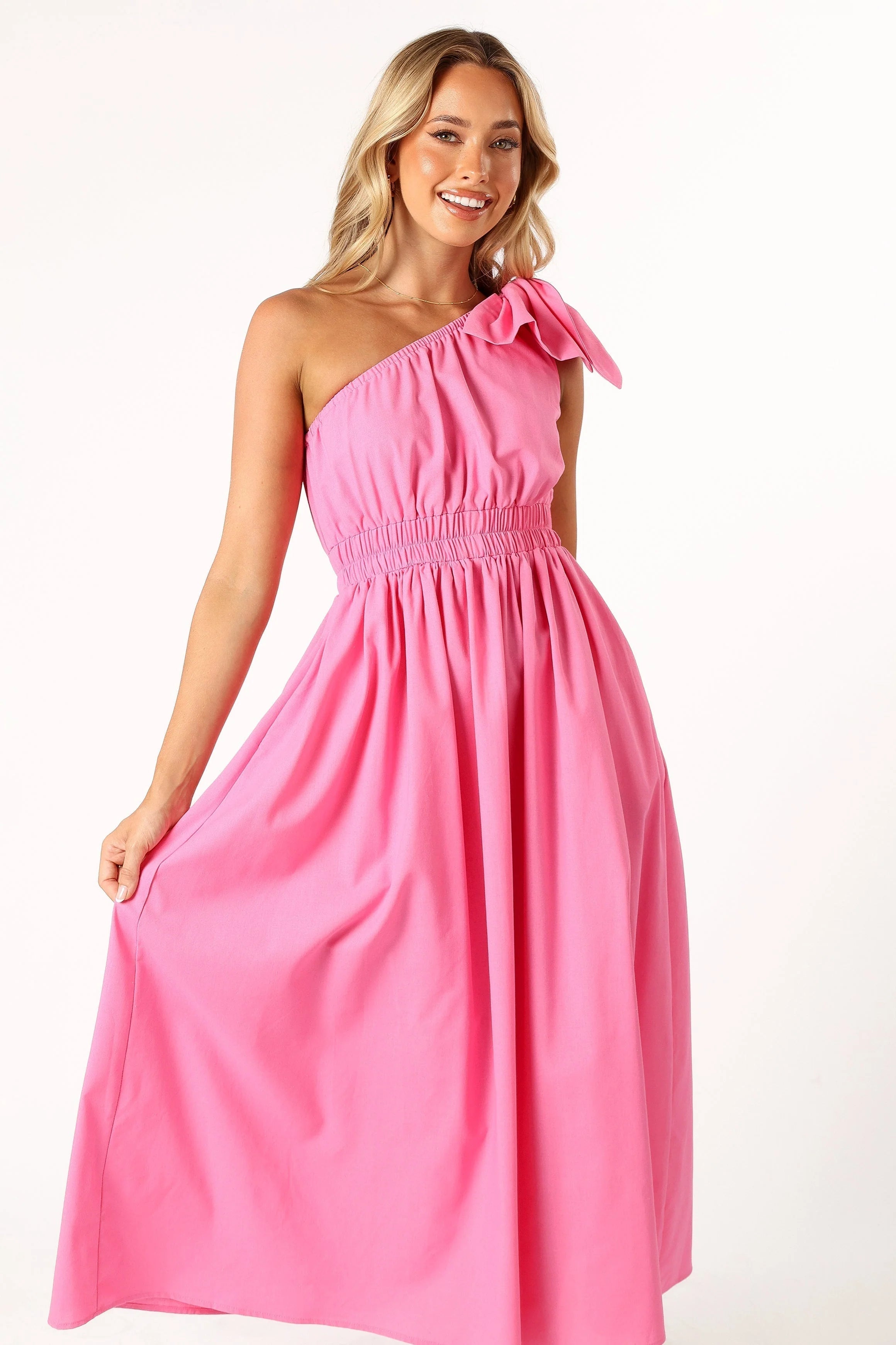 DETAILS This dress encapsulates timeless beauty through its asymmetrical one-shoulder design complemented by a bow detail that adds a touch of subtle sophistication. The A-line skirt style provides a flattering silhouette for all body types, gracefully flowing from an elasticised waistband that cinches just right for a comfortable fit.