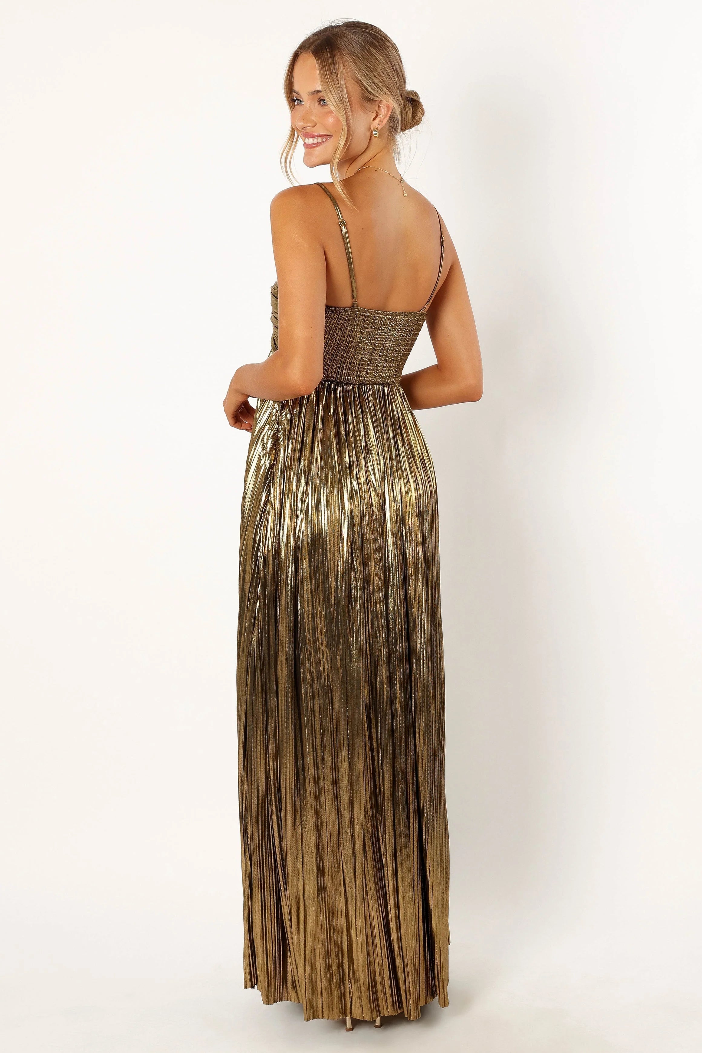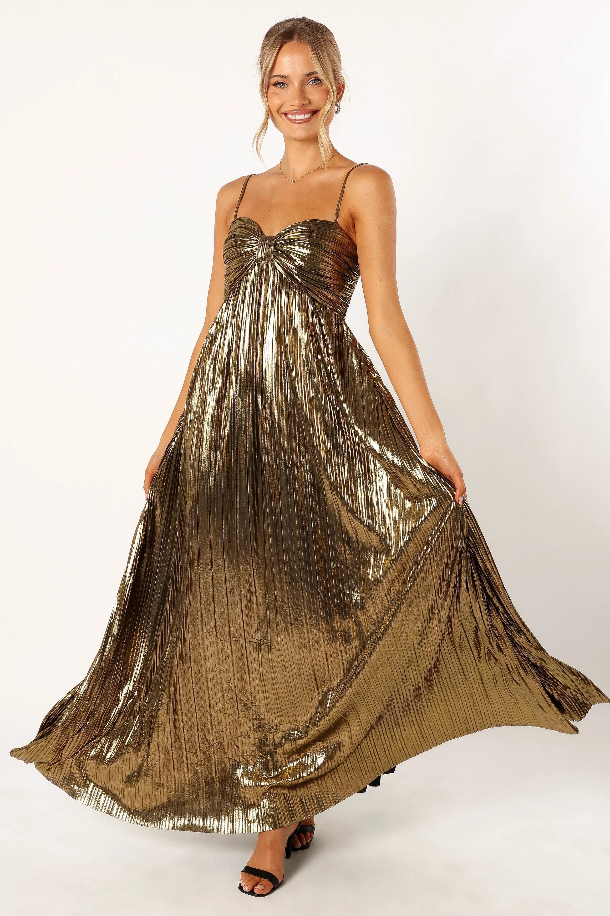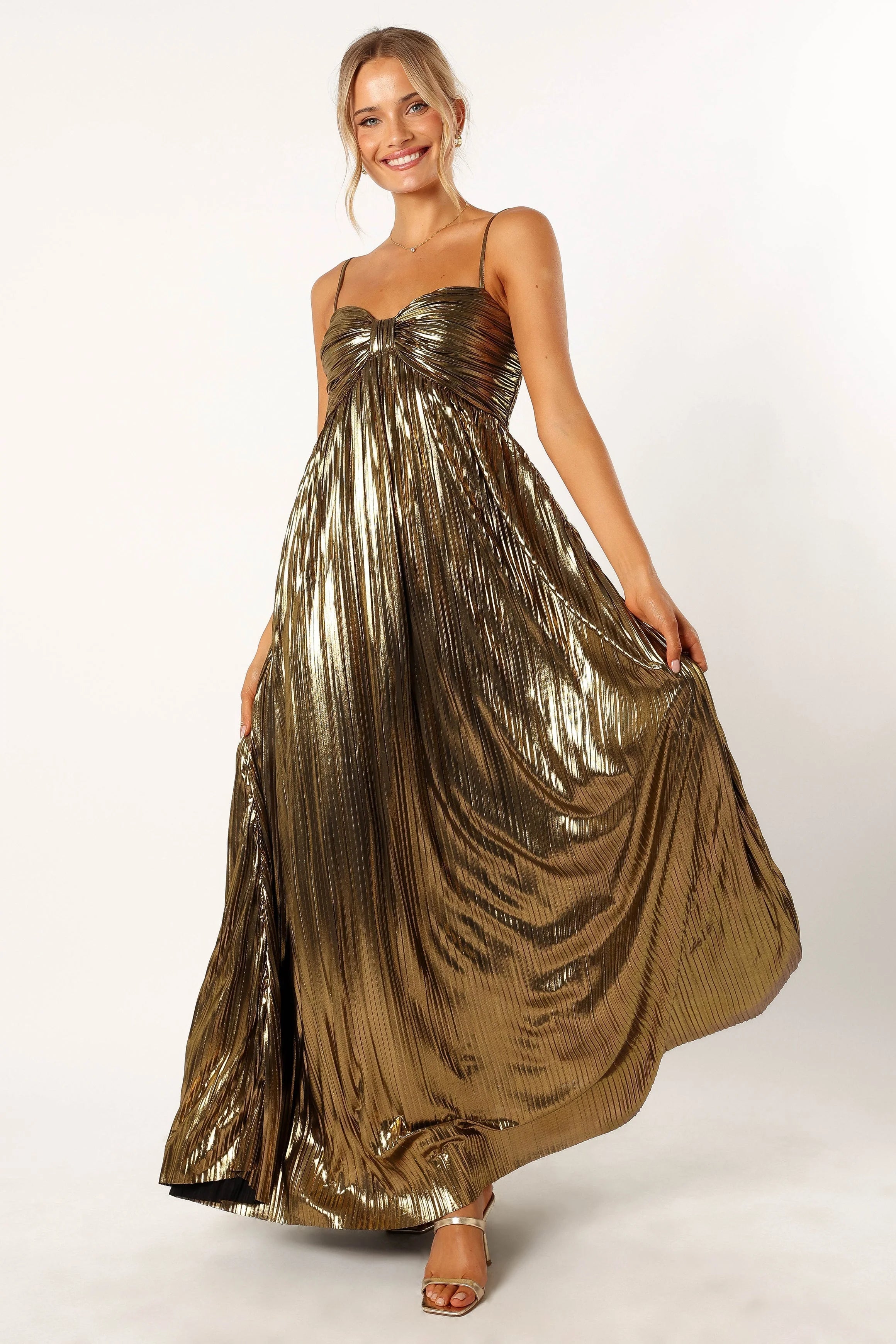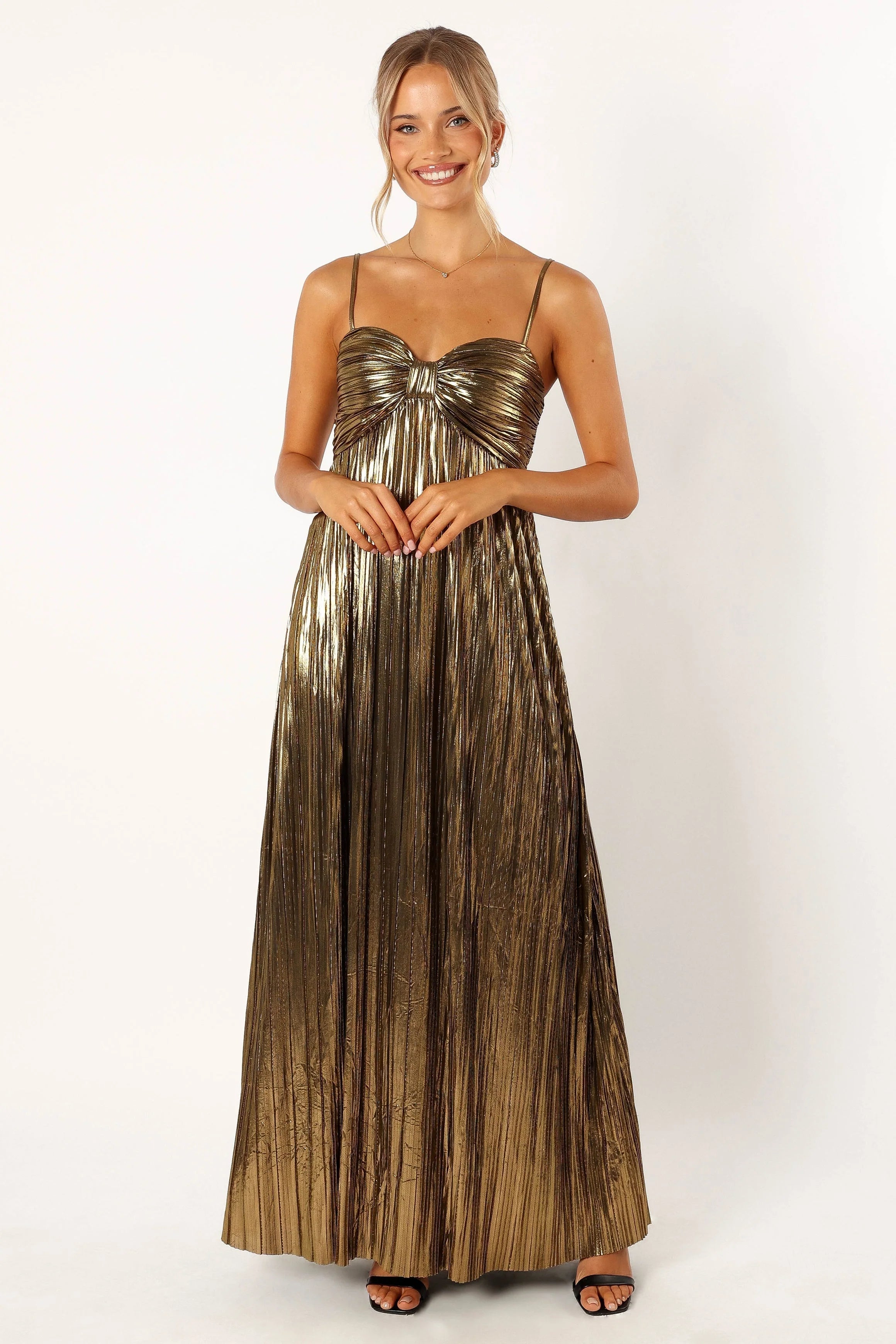 DETAILS This elegant maxi dress is the perfect choice for any special occasion. It features a sweeet heart neckline, thin adjustable straps. The pleated satin metallic fabric has a soft feel that will make you look and feel fabulous all night long. Make a statement at your next party in this stunning maxi dress!