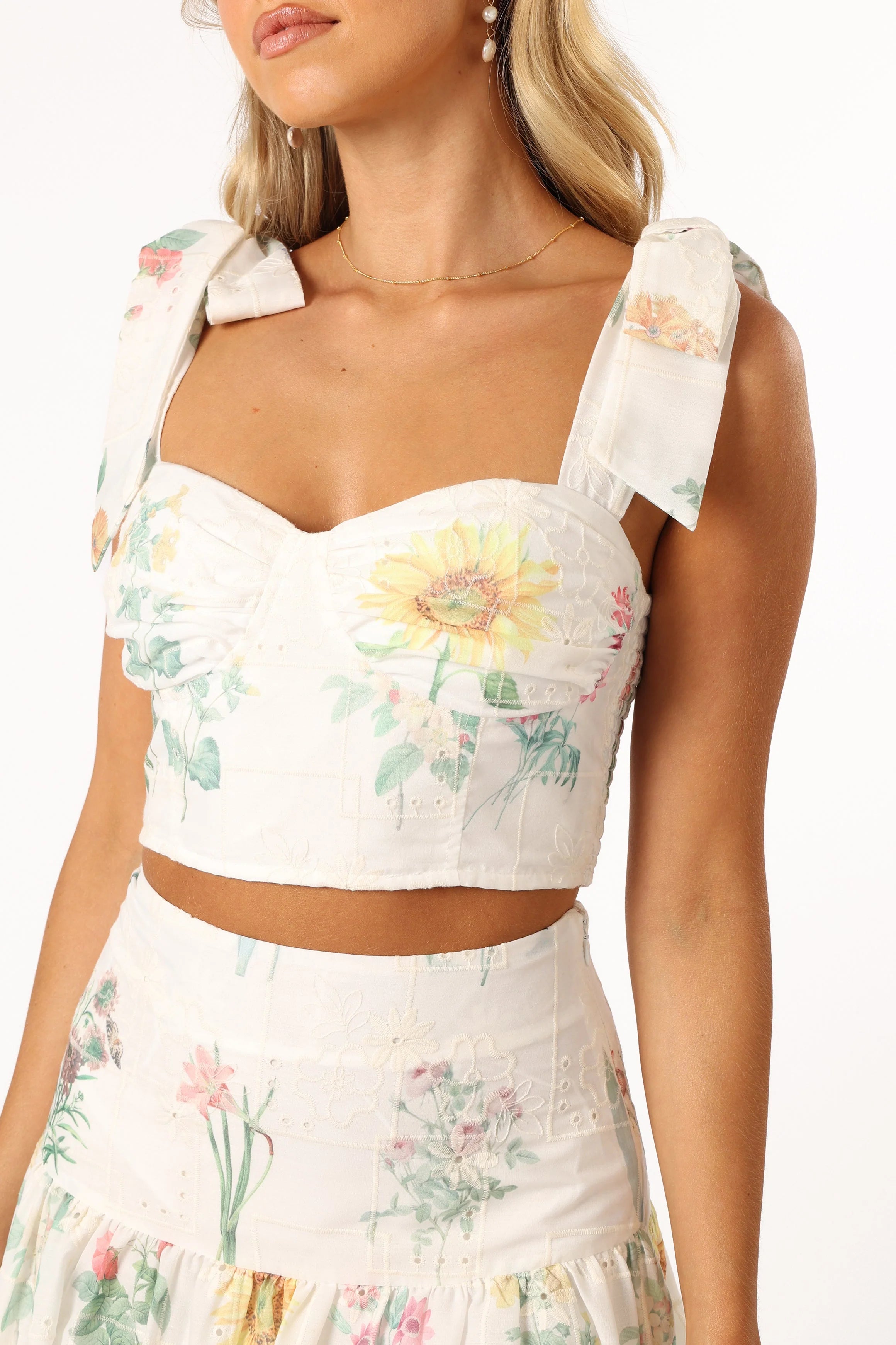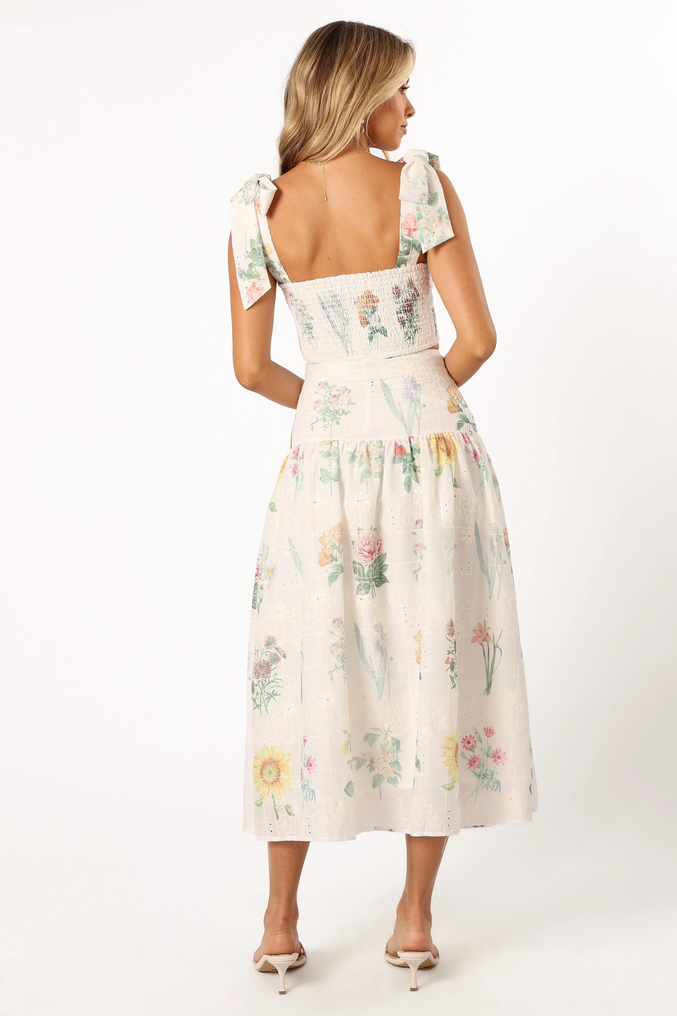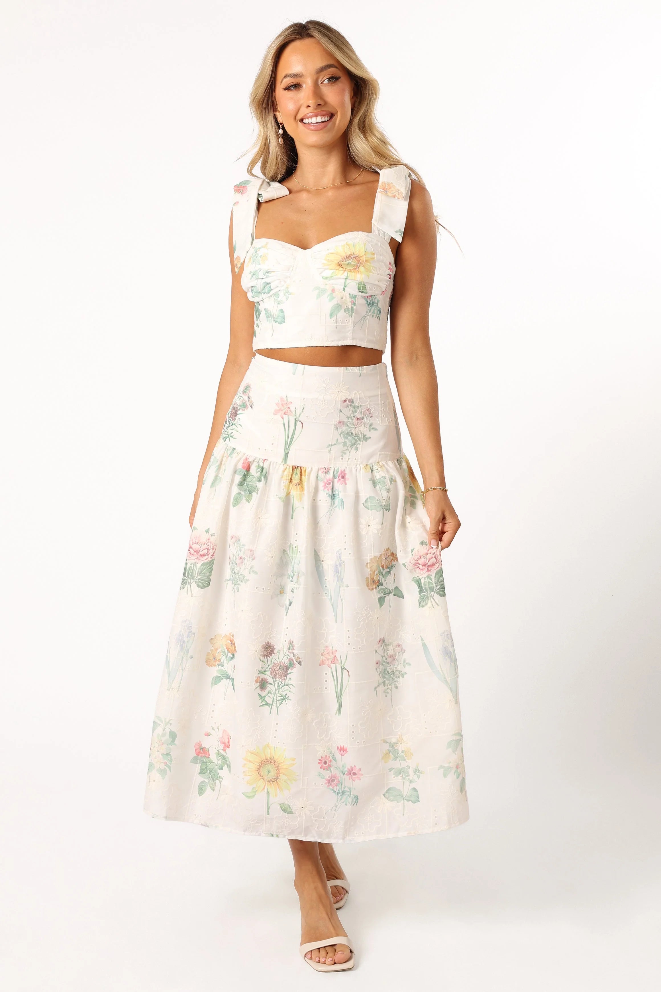 | DETAILS Turn heads with our playful and trendy top and skirt set! The cropped top features adjustable tie shoulder straps that let you decide your fit and a sweetheart neckline that flatters everyone. The high-waisted midi skirt cinches your waist and flows beautifully with every step you take.