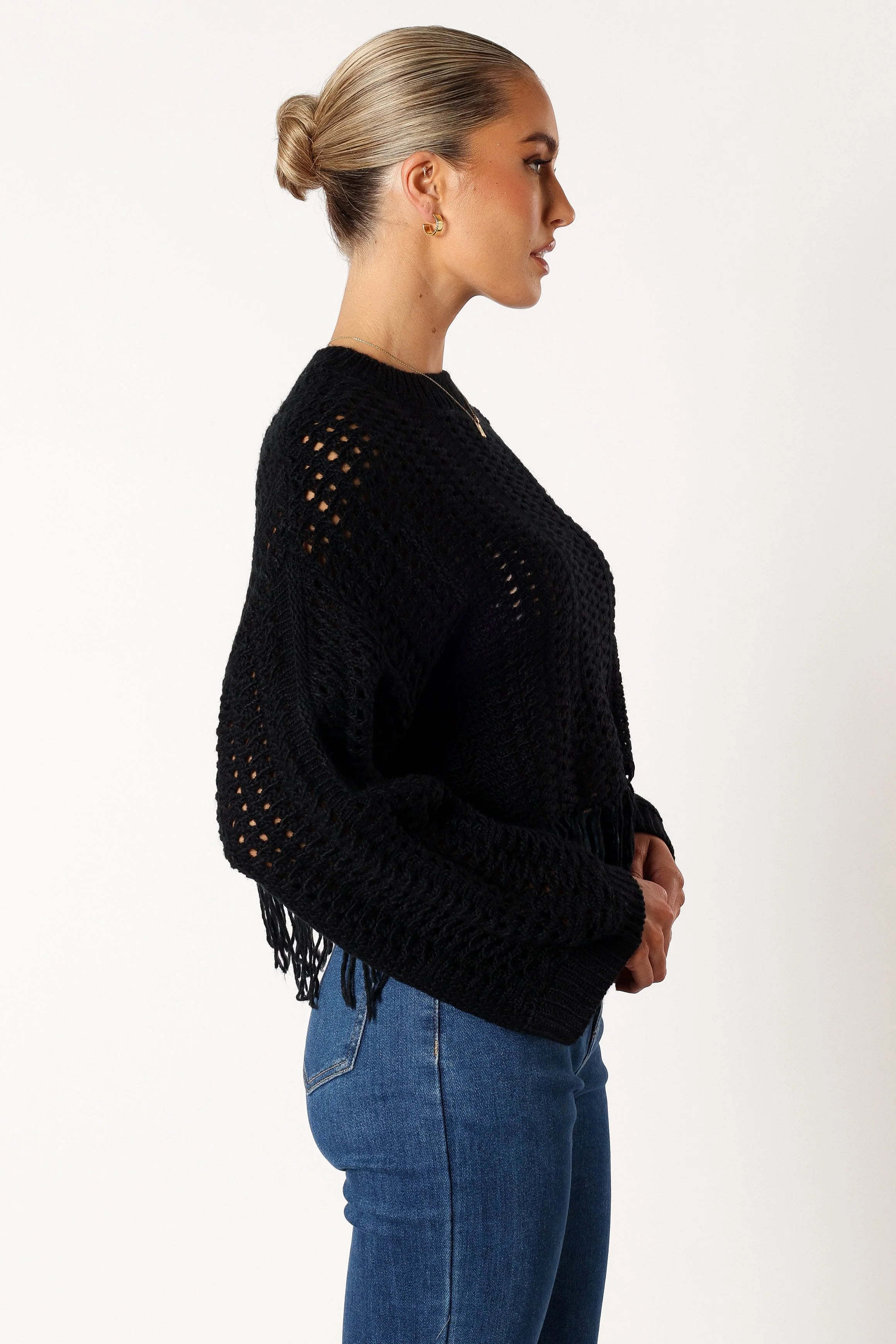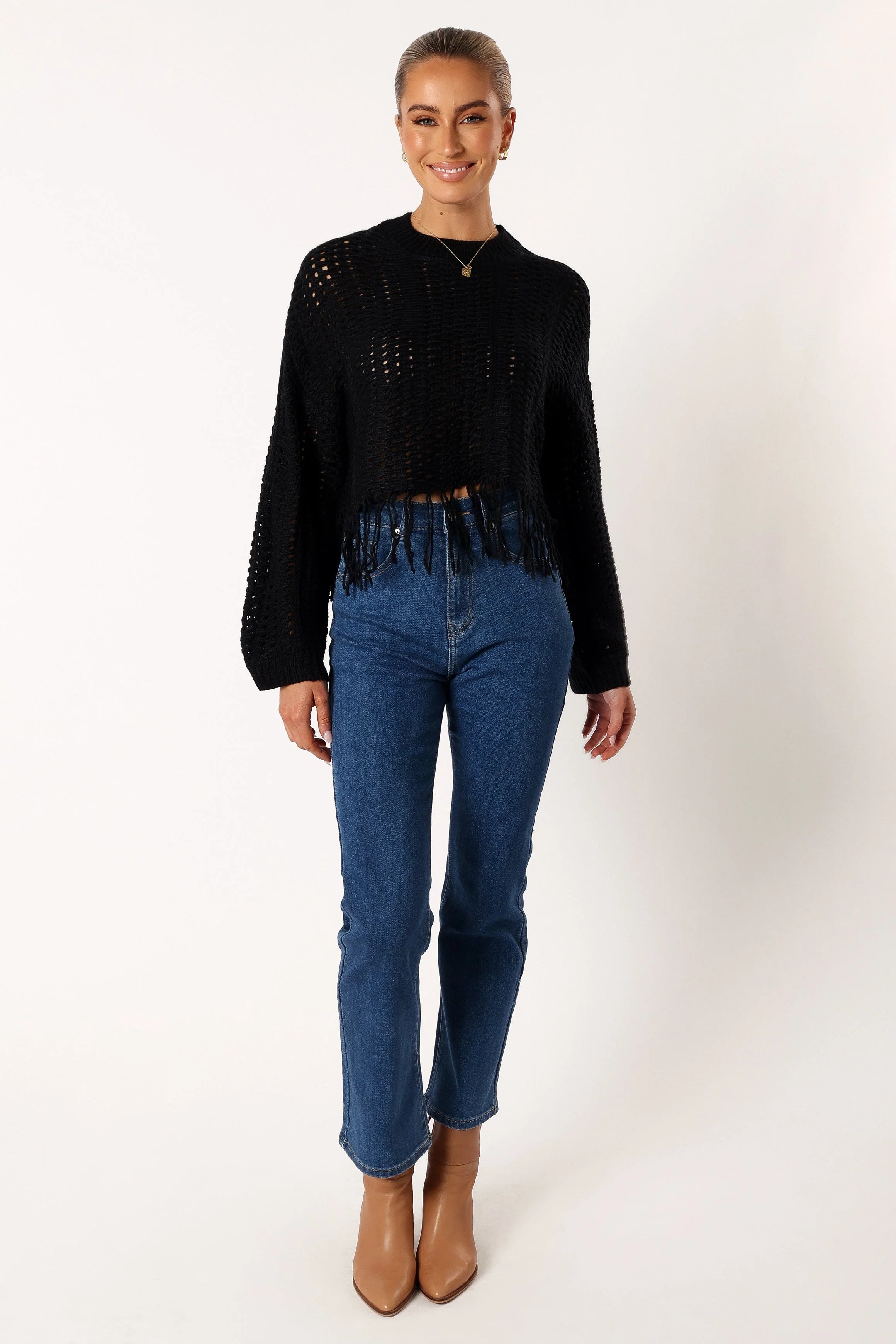 DETAILS Make a fashion statement in the Katalina Fringe Crop Knit Sweater! This sweater features a cropped length, high round neckline, and long sleeves with ribbed cuffs. The crochet style knit is sure to turn heads while the fringe tassel hemline provides a playful touch that will keep you feeling both stylish and comfortable.