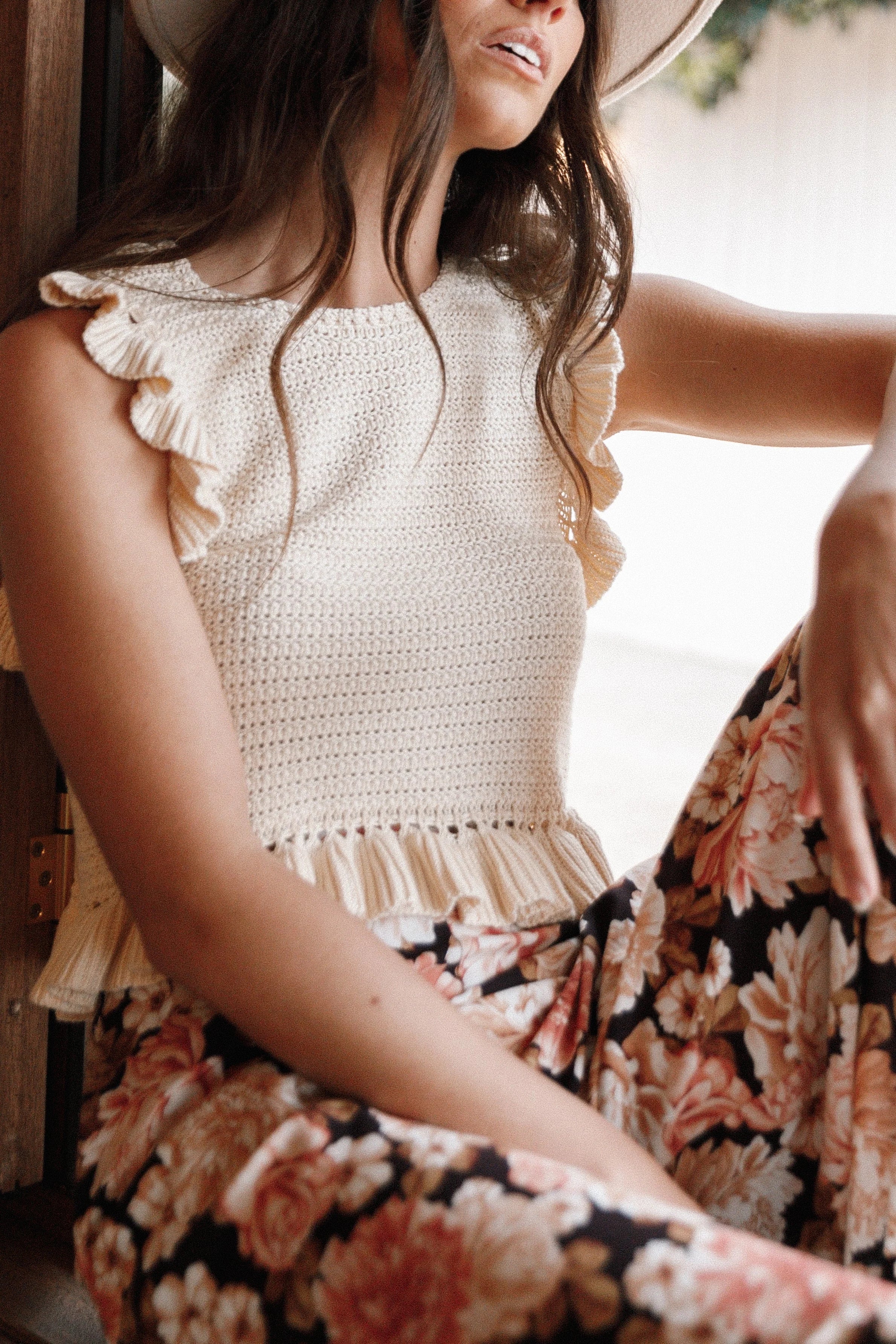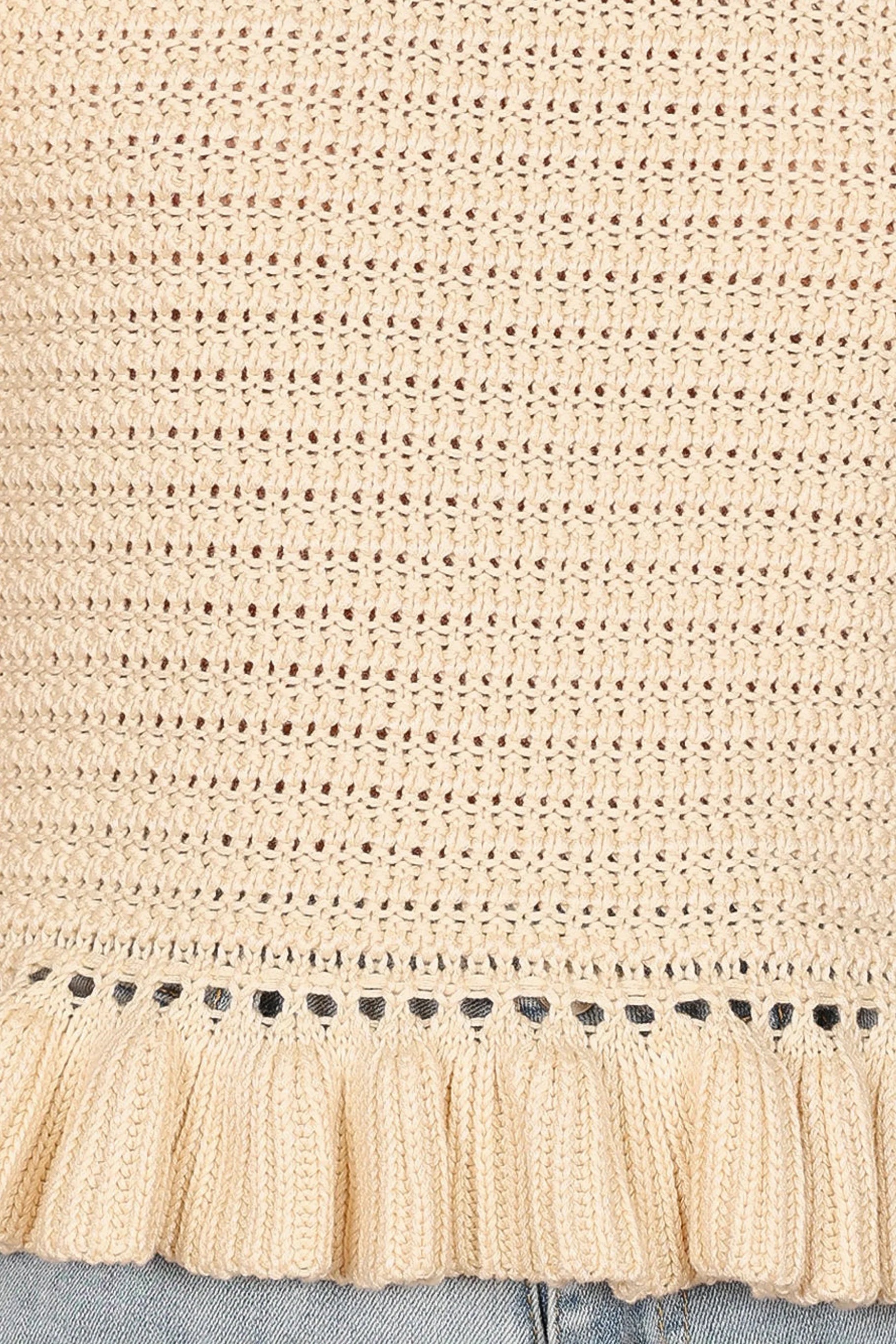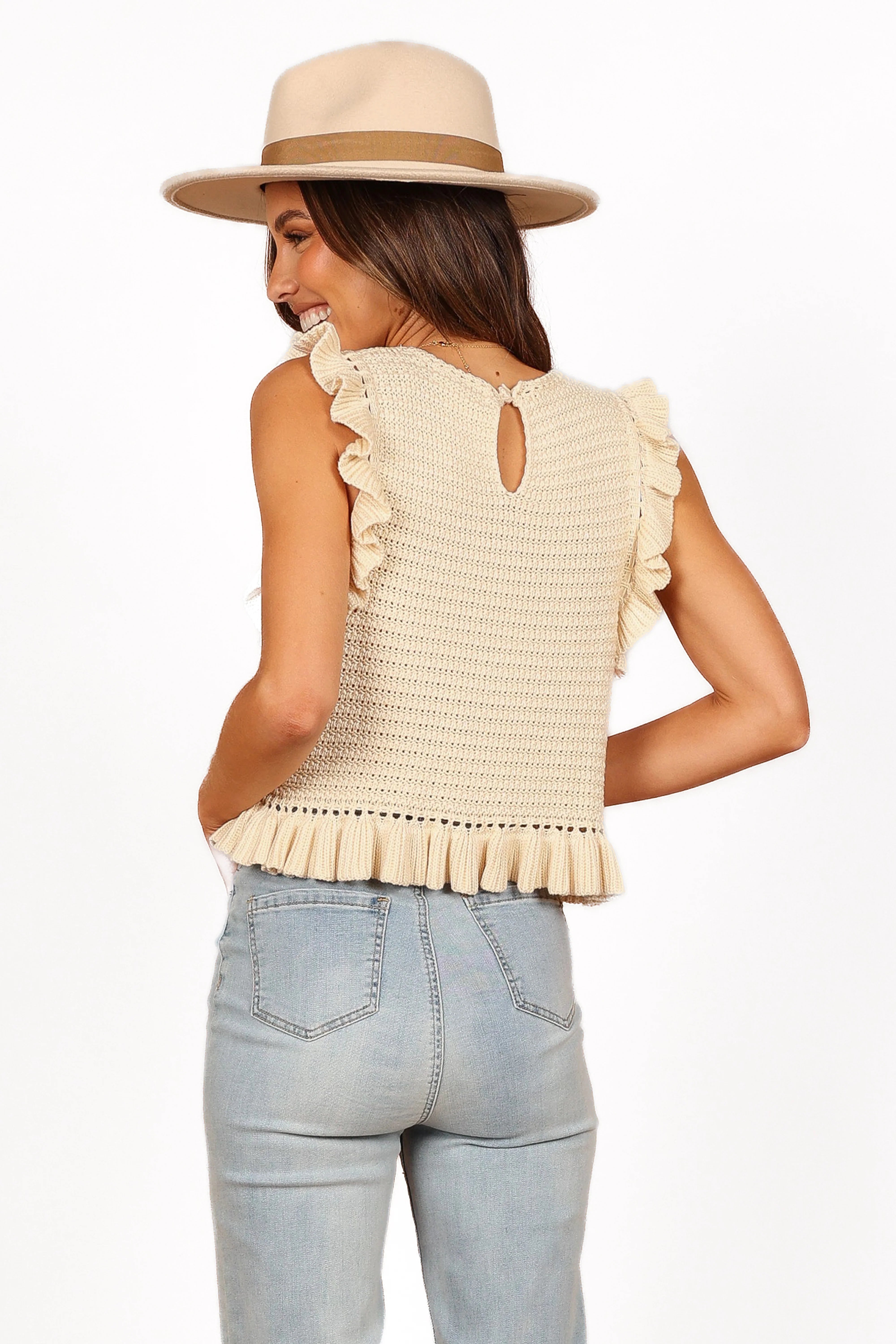 DETAILS Have you been looking for the perfect knitted top to give your look a little extra flair? Look no further than this super chic knitted vest with its flattering round neckline and OH-so-trendy ruffle detail. The sleeveless style creates an effortlessly stylish silhouette, while the relaxed fit will keep you comfortable all day long.
