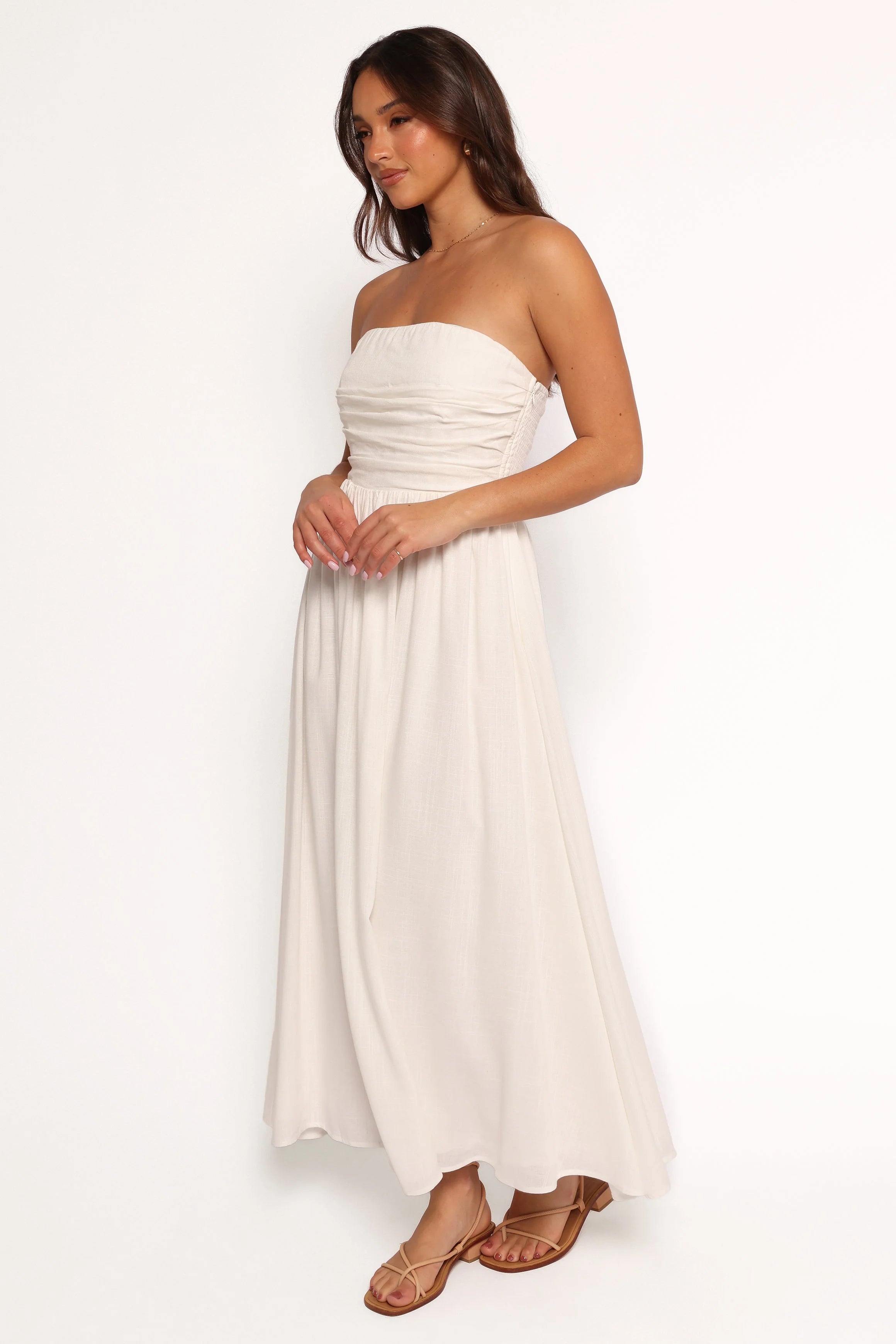 DETAILS This strapless maxi dress is a must-have for any wardrobe. The straight neckline with pleated bodice feature makes it stand out. Plus its shirred back panel and side invisible zip provides a secure and comfortable fit, allowing you to dance the night away without any worries.