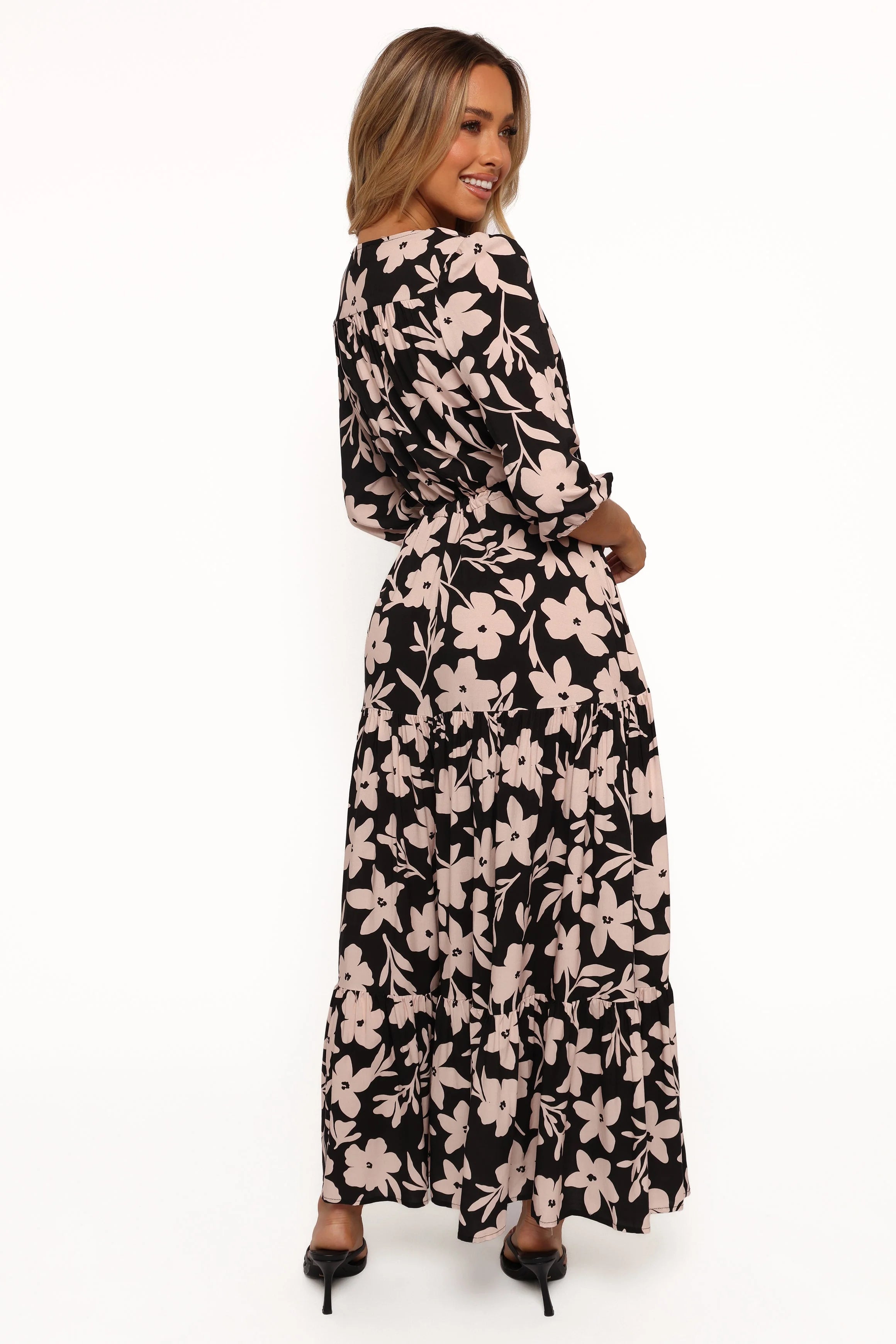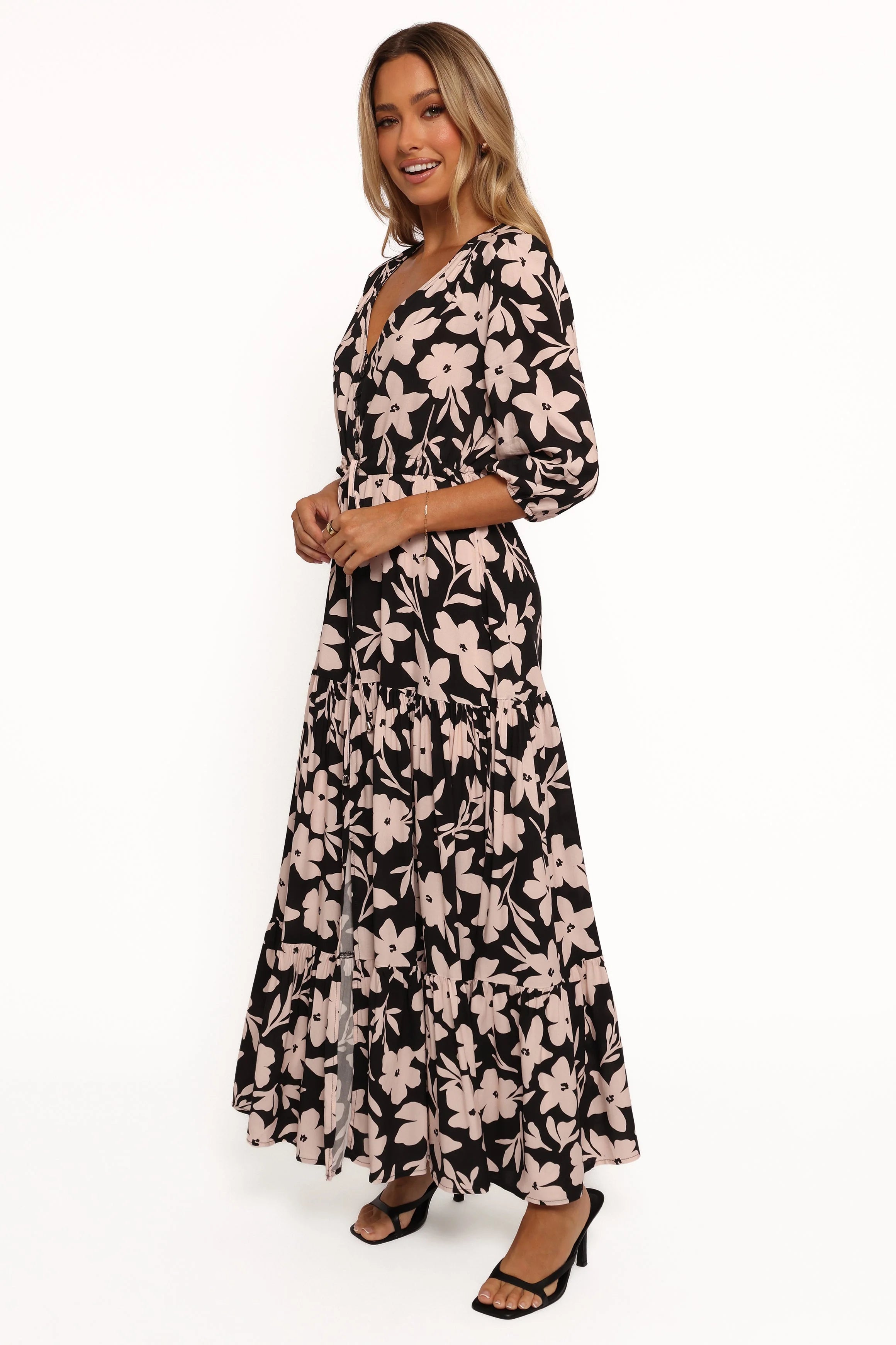 DETAILS Step out in style wearing this maxi length dress! Featuring a v neckline and mid length sleeves with elasticised cuffs, it's sure to flatter your figure. Functional buttons adorn the bodice, whilst being gathered at the waist with a tie detail for a fun take on femininity.pu