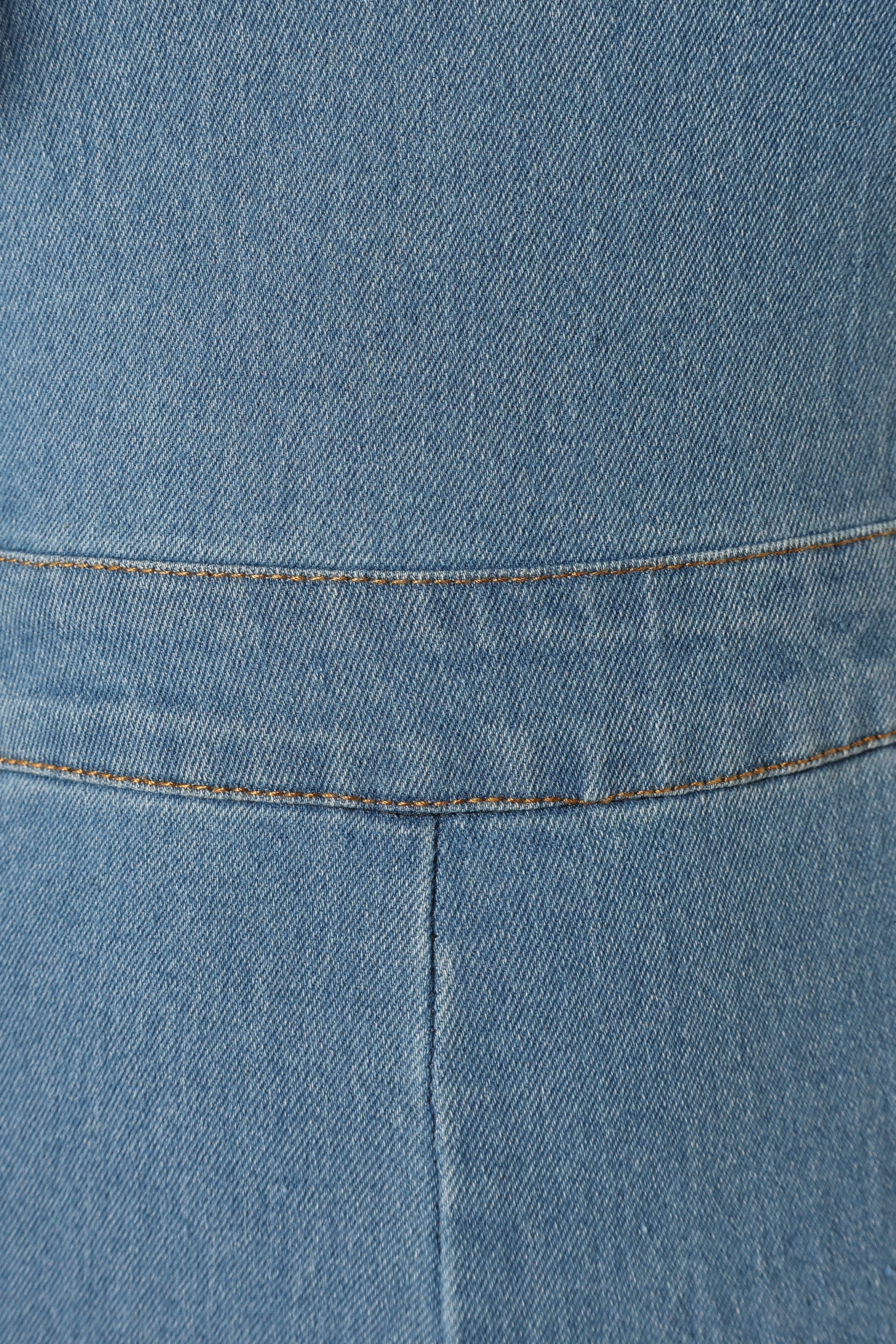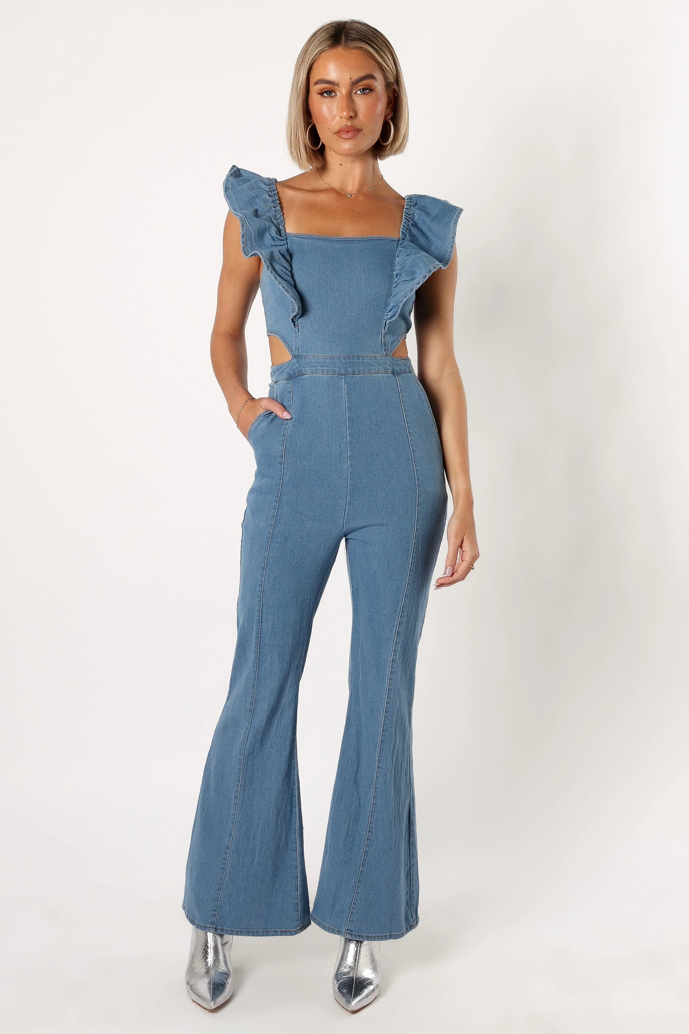 DETAILS Are you the life of the party? Ready to turn heads this fall? Then a denim style jumpsuit is your perfect pick! Featuring a modern square neckline with frill details and an eye-catching side cut out feature, this jumpsuit is sure to make a statement.