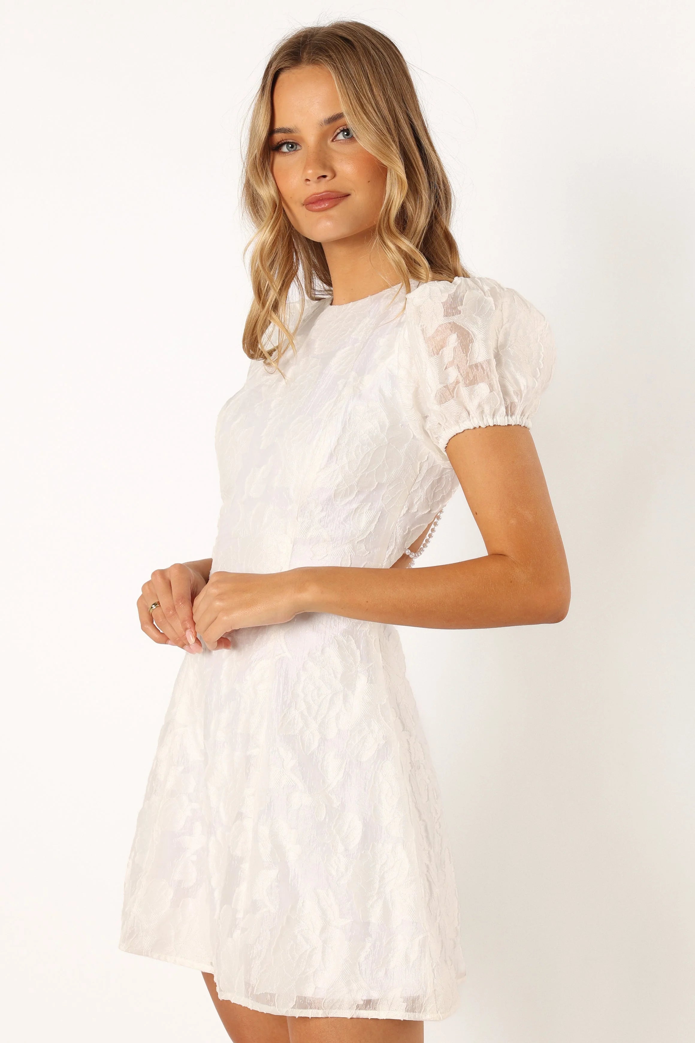 DETAILS his mini length dress features a high round neckline with button close, creating a classic look that's perfect for any occasion. The short sleeves with elasticised cuffs add a touch of femininity, while the open back with pearl design adds a bold and unique twist.