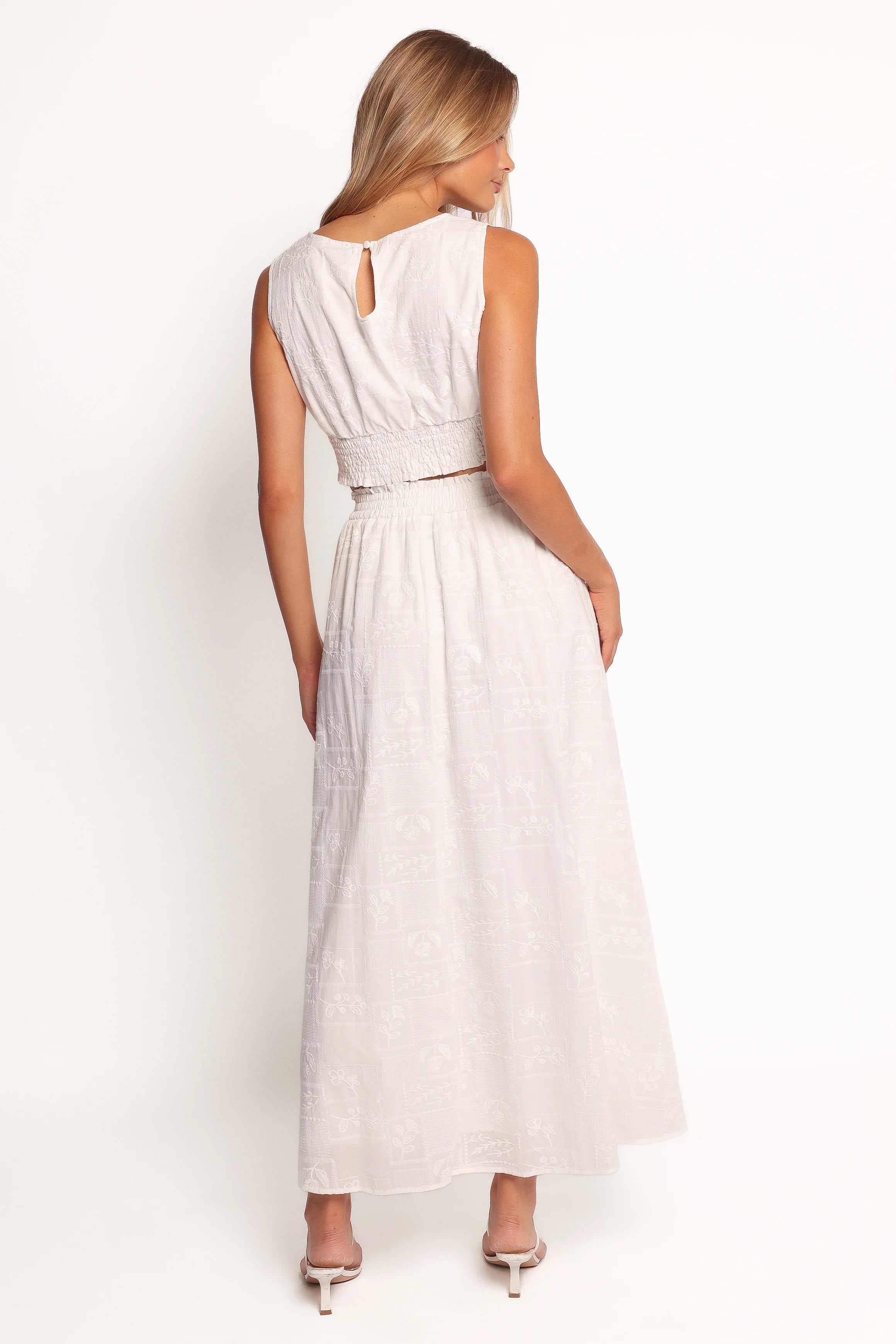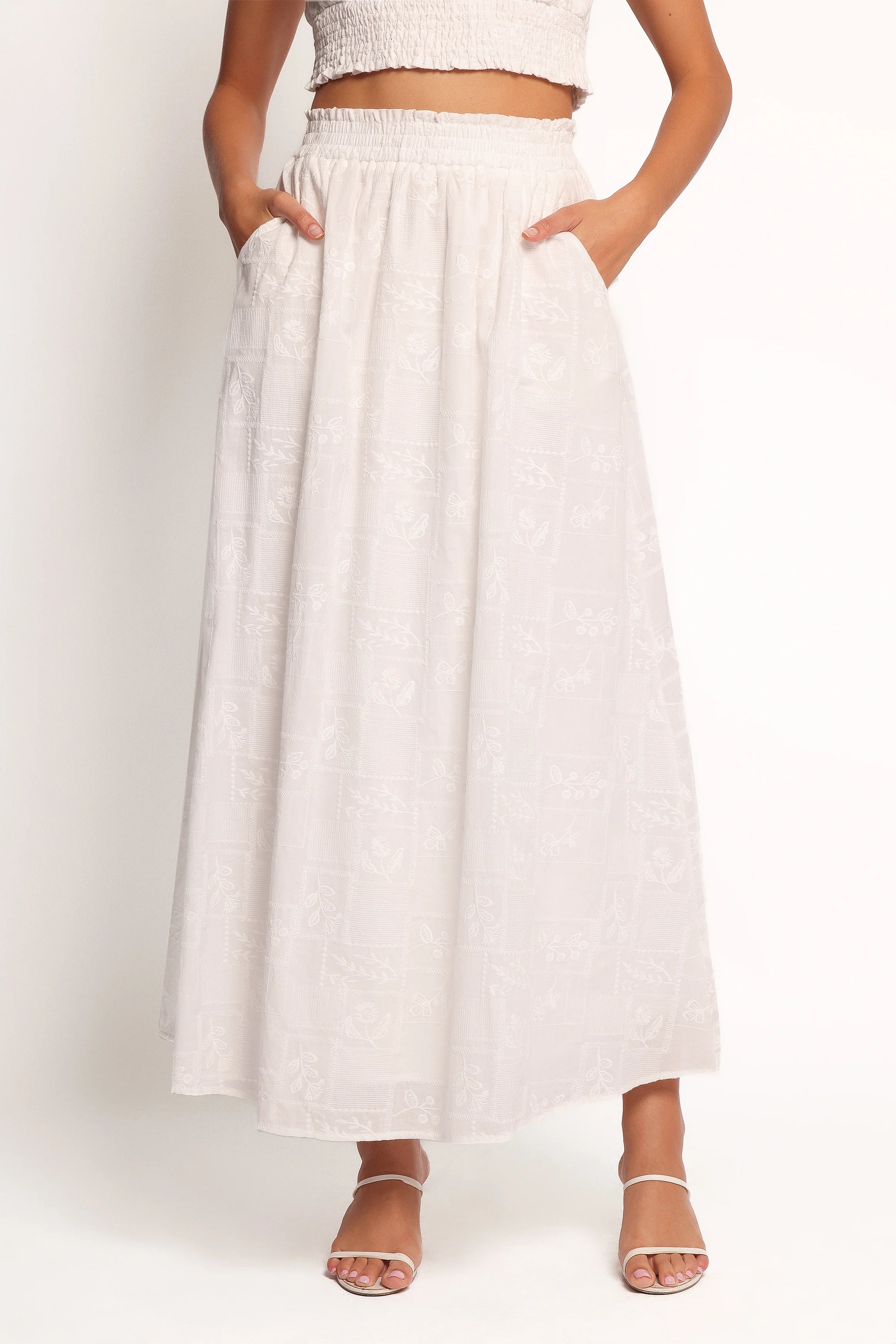 DETAILS Elevate your wardrobe with the effortlessly chic Kimora Maxi Skirt in crisp white. Designed to combine style with comfort, this maxi-length skirt features an elasticized waistband that offers a flawless fit for every shape, making it perfect for all-day wear.