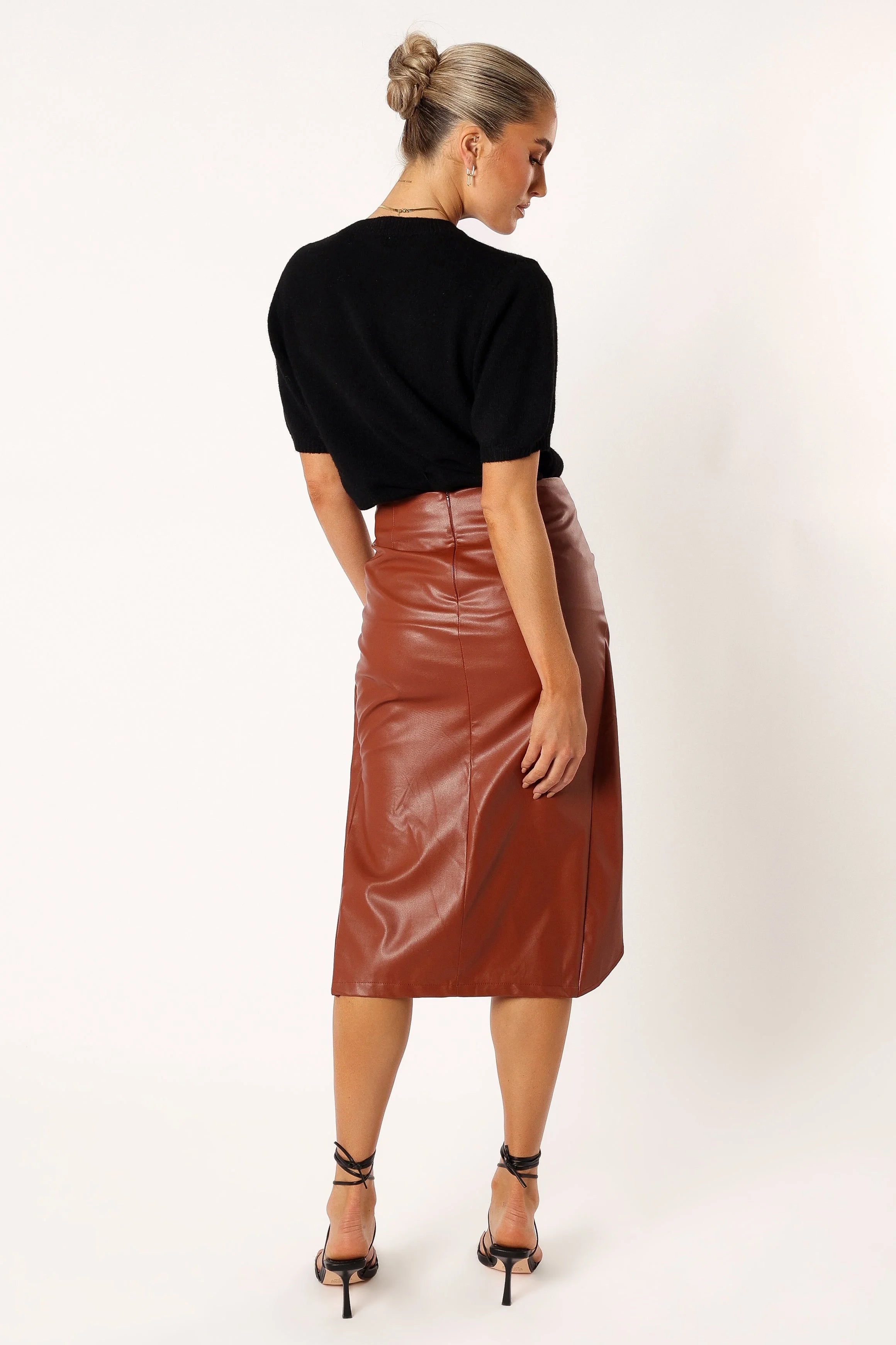 DETAILS Introducing our amazing midi length skirt. Perfect for a night out, this skirt is made from faux leather. It's finished with an invisible back zip so you can look effortlessly chic without any fuss!