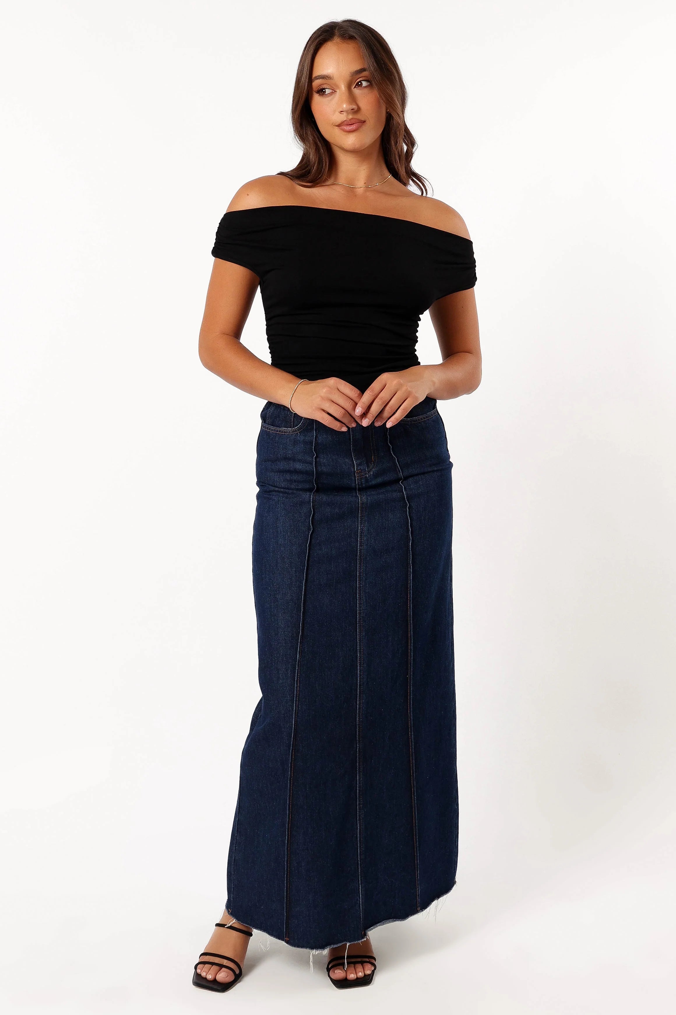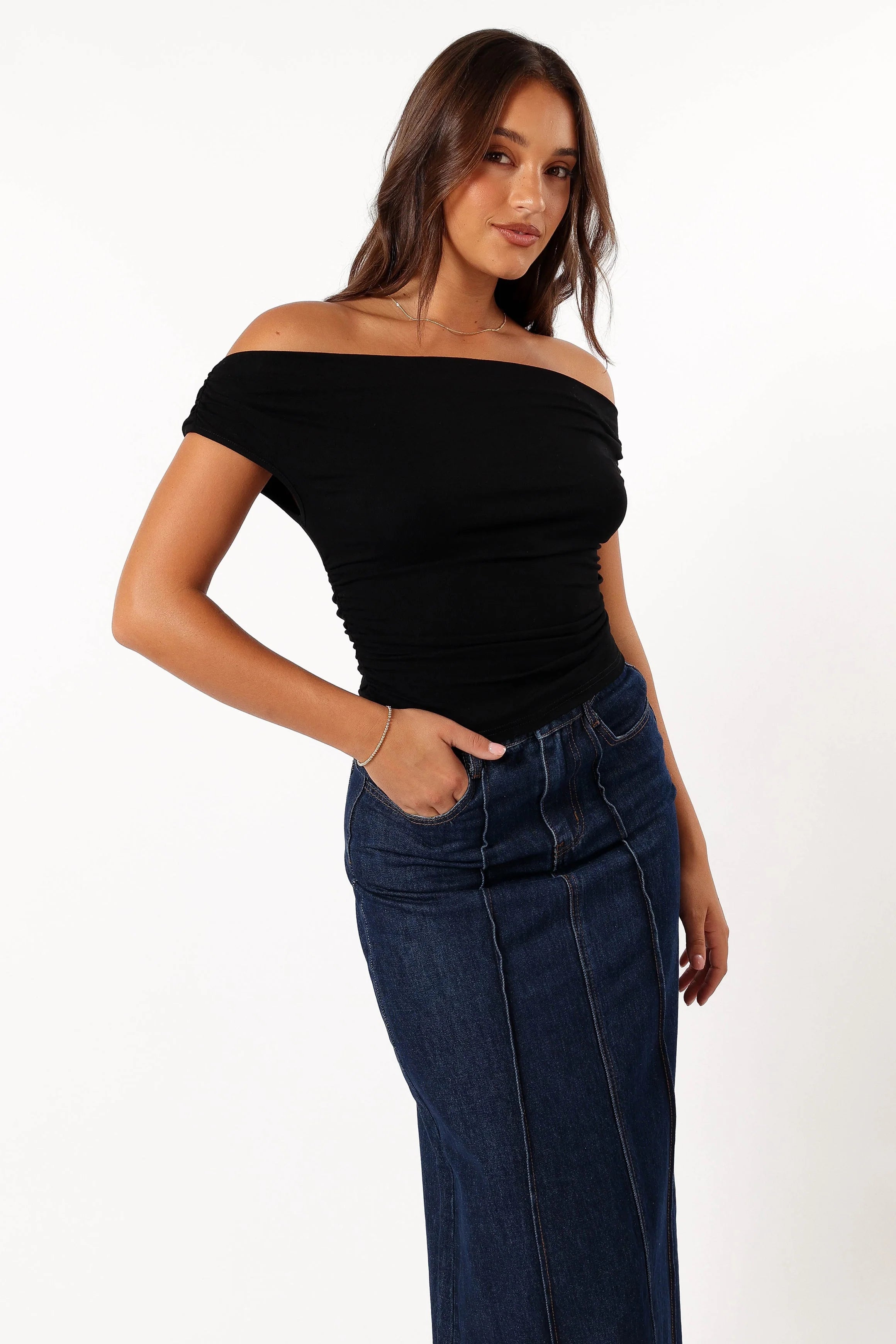 DETAILS This off the shoulder top has a straight neckline, ruched shoulder strap detail, and side ruched feature for a truly stand-out look. You'll love the stretch fabric that keeps you comfortable day or night.