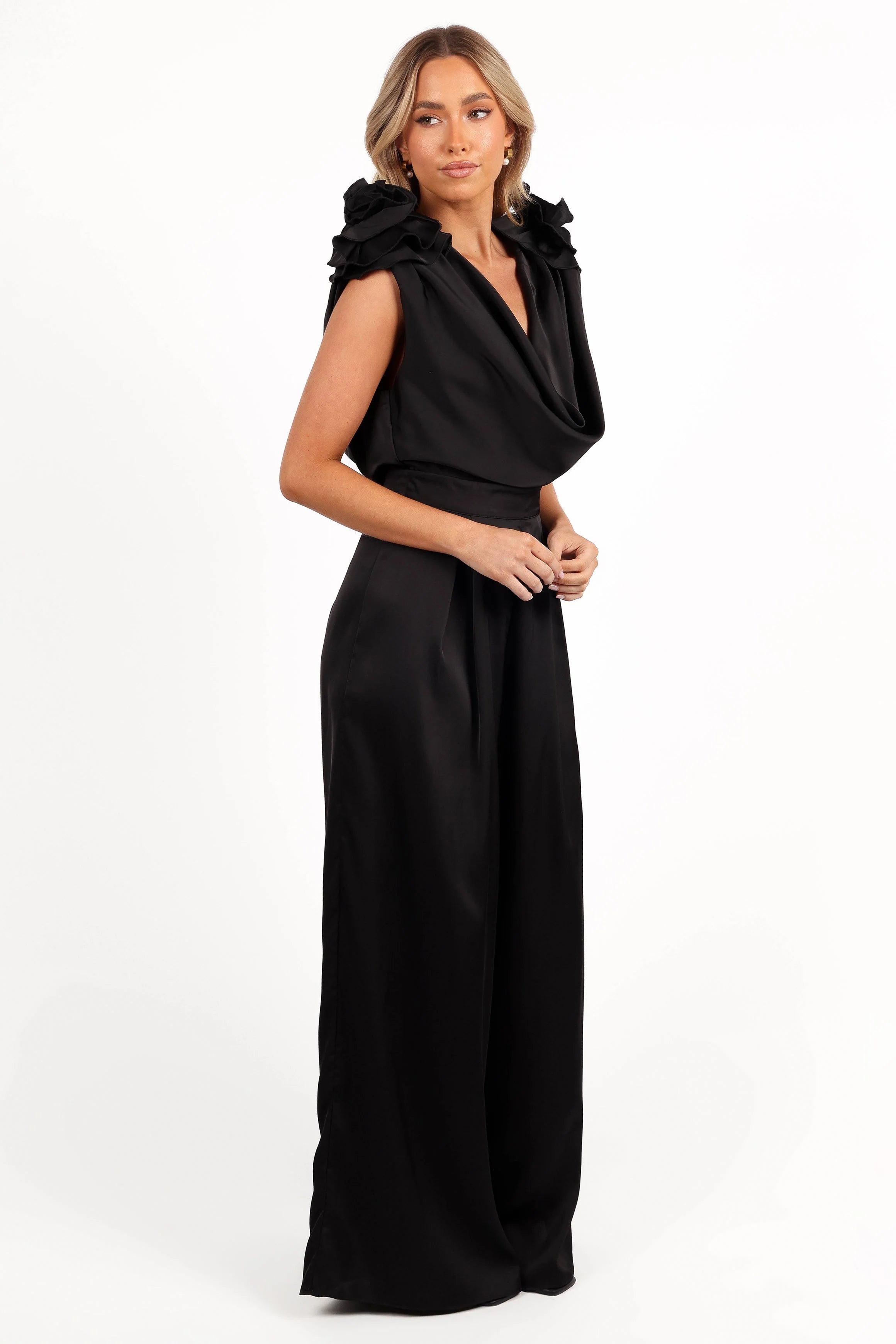 | DETAILS Introducing the perfect addition to your wardrobe - our full length jumpsuit is sure to turn heads! With its unique cowl neckline and eye-catching flower shoulder feature, it'll be a showstopper wherever you go.