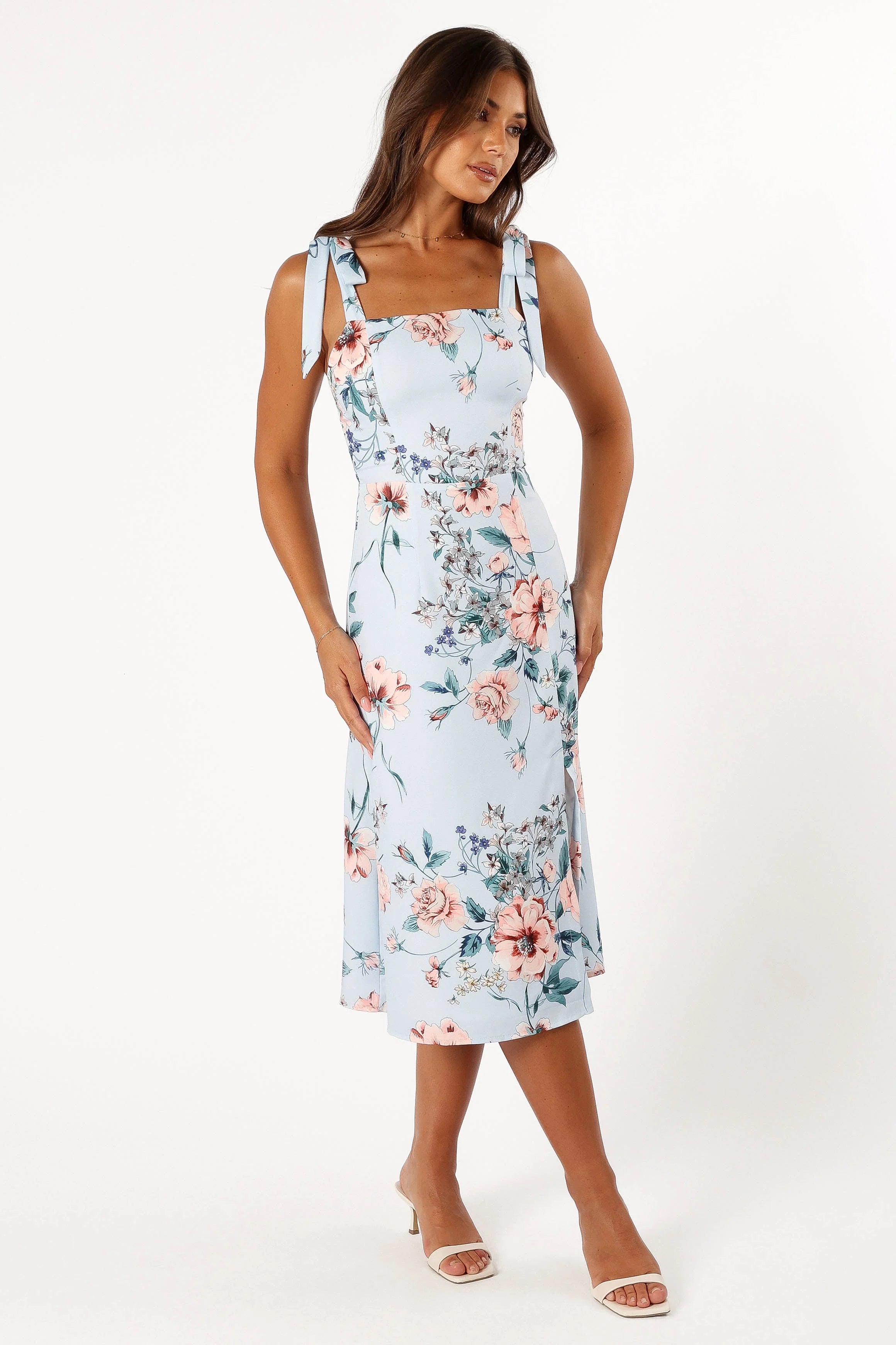 DETAILS Say hello to your new go-to dress: the elegant and dressy blue floral print midi dress. It features an elegant square neckline, tie close shoulder straps, elasticised shirred back panel for extra comfort and a back invisible zip for easy wear.
