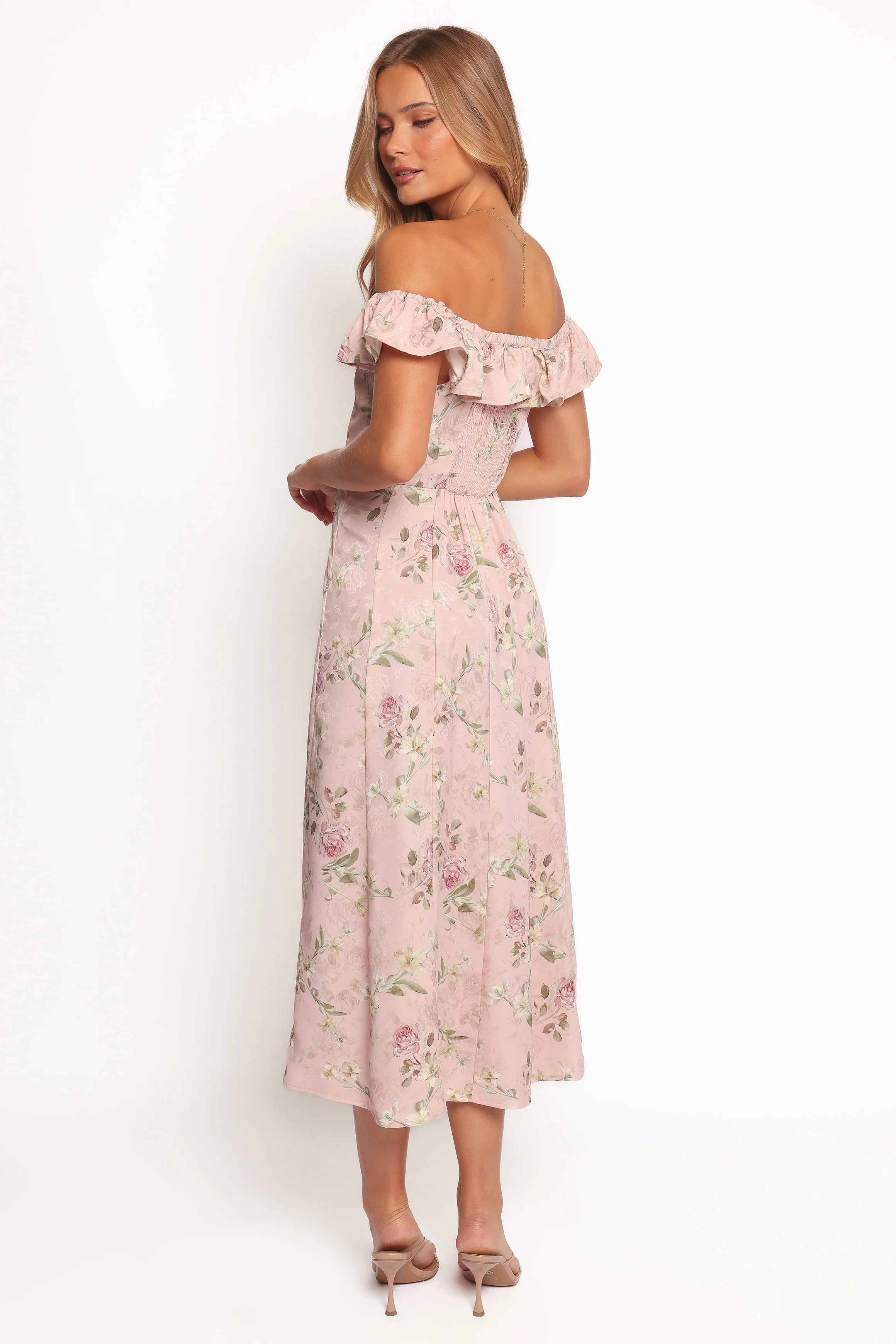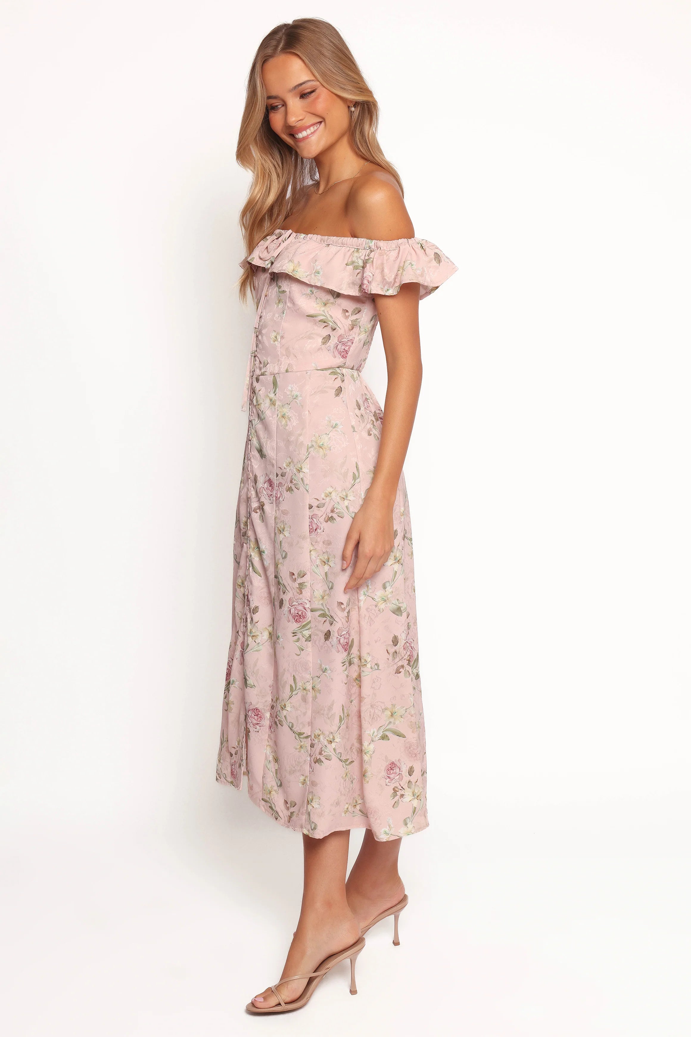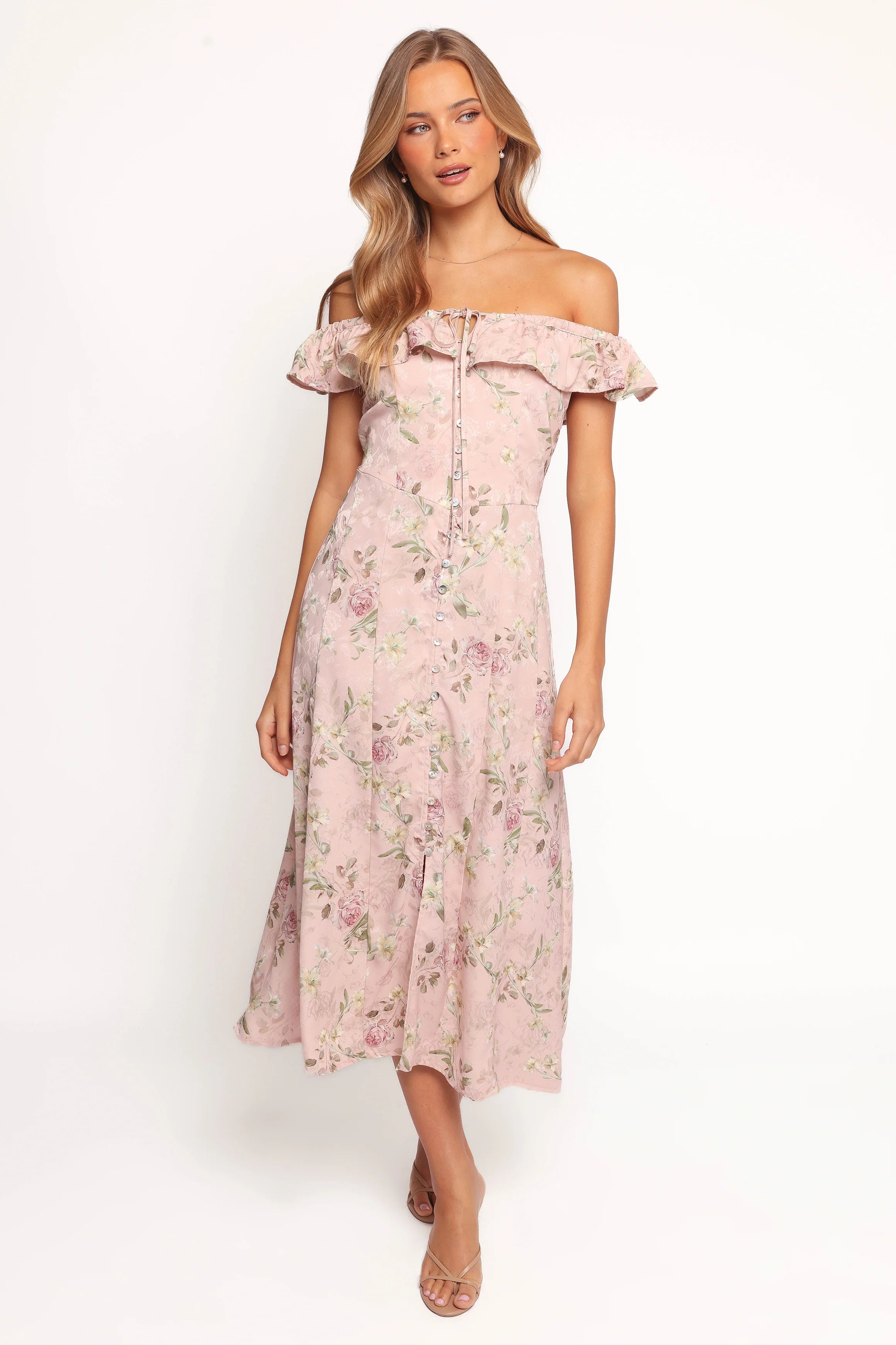 DETAILS This fashion-forward piece features a flattering off the shoulder style and straight neckline adorned with ruffle detail. The functional buttons down front add a classic touch to this modern silhouette. It's partially lined, ensuring comfort without compromising style.