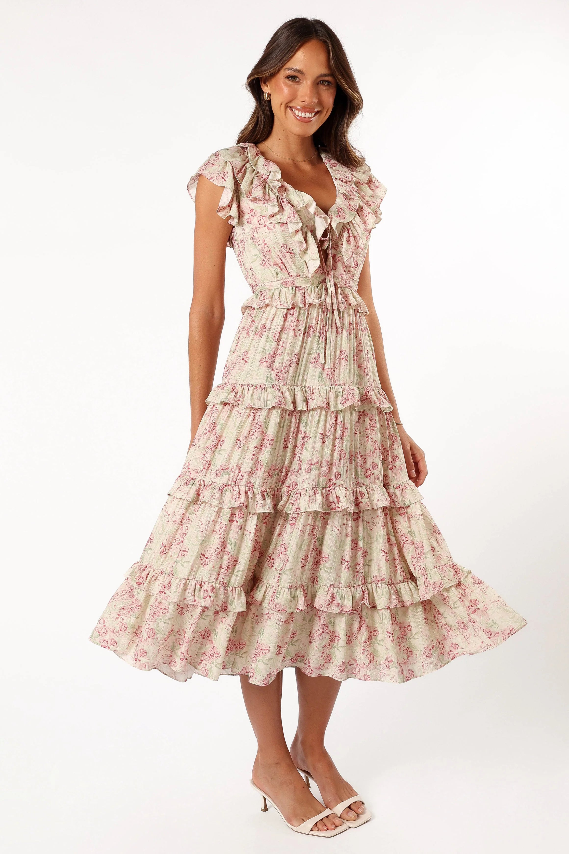 | DETAILS Step into a world of timeless elegance with our stunning midi-length dress, thoughtfully designed for those who appreciate the finer details in life. This exquisite piece is defined by a graceful V-neckline adorned with delicate ruffle detailing, adding a touch of romantic charm.