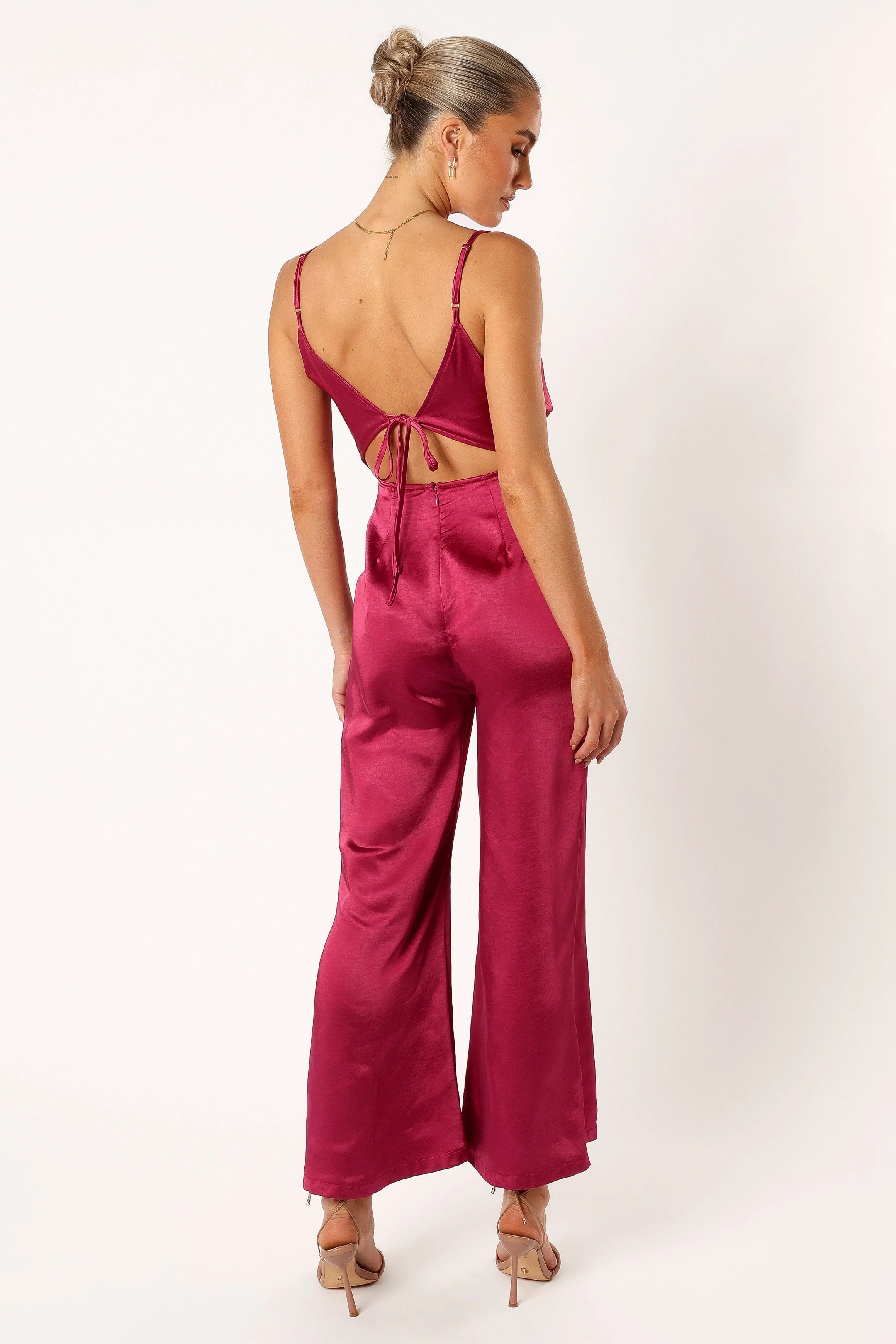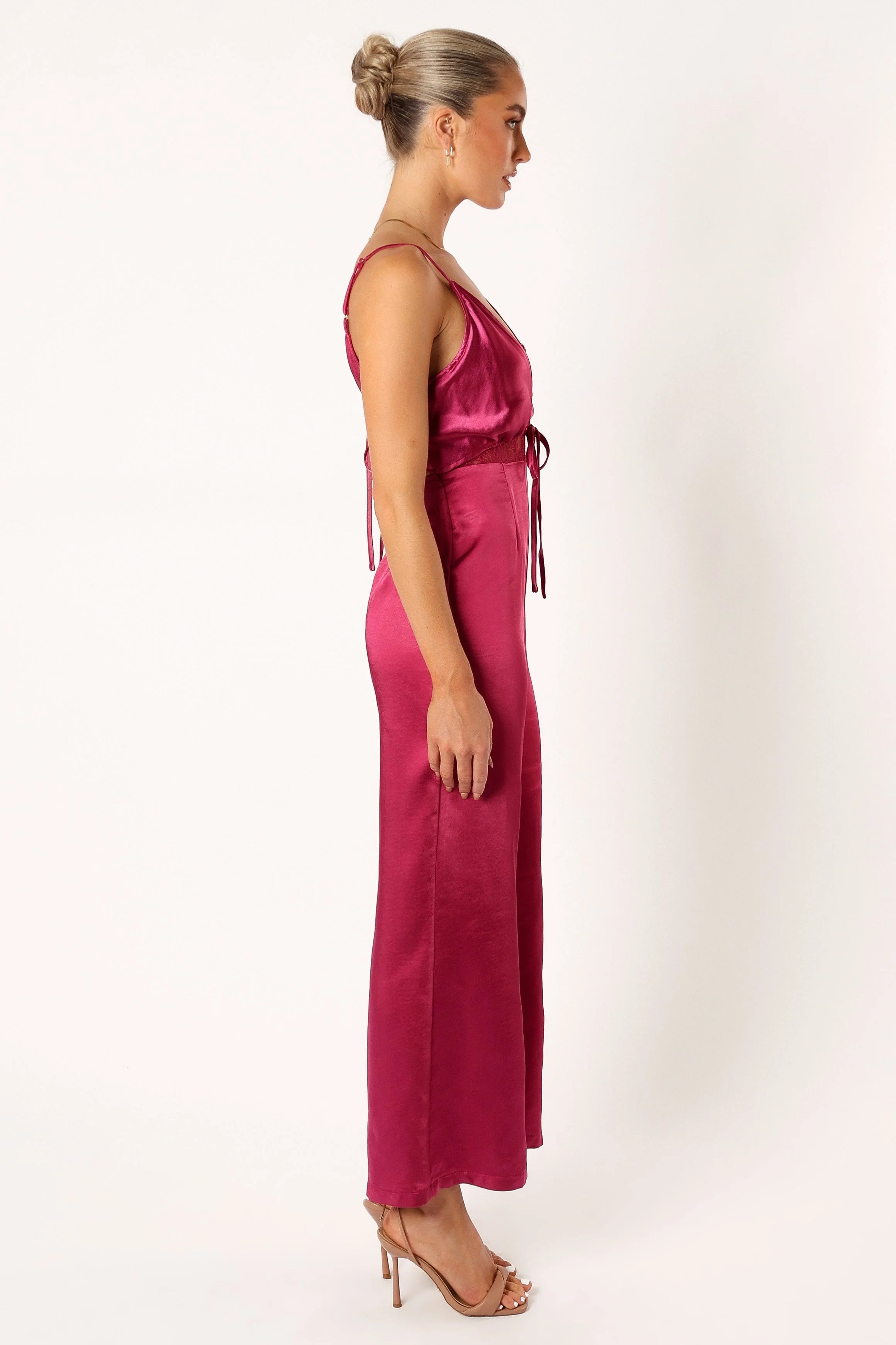 DETAILS The Lilian Jumpsuit in Berry is the perfect addition to your wardrobe this season. This playful, trendy piece is designed with a fashion-forward mindset, ensuring you will turn heads wherever you go. Featuring a flattering v-neckline and thin adjustable straps, this jumpsuit accentuates your figure while keeping you comfortable.