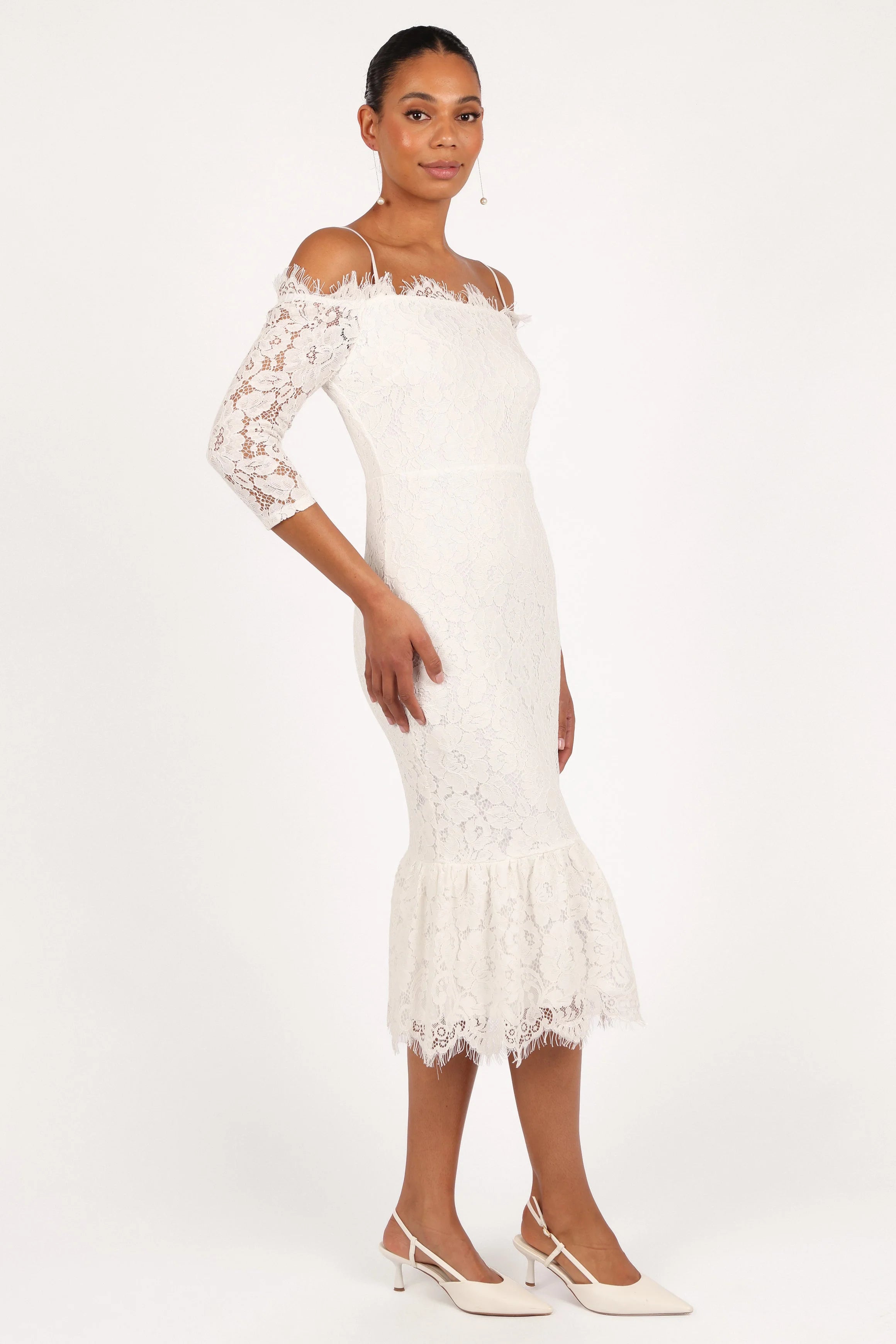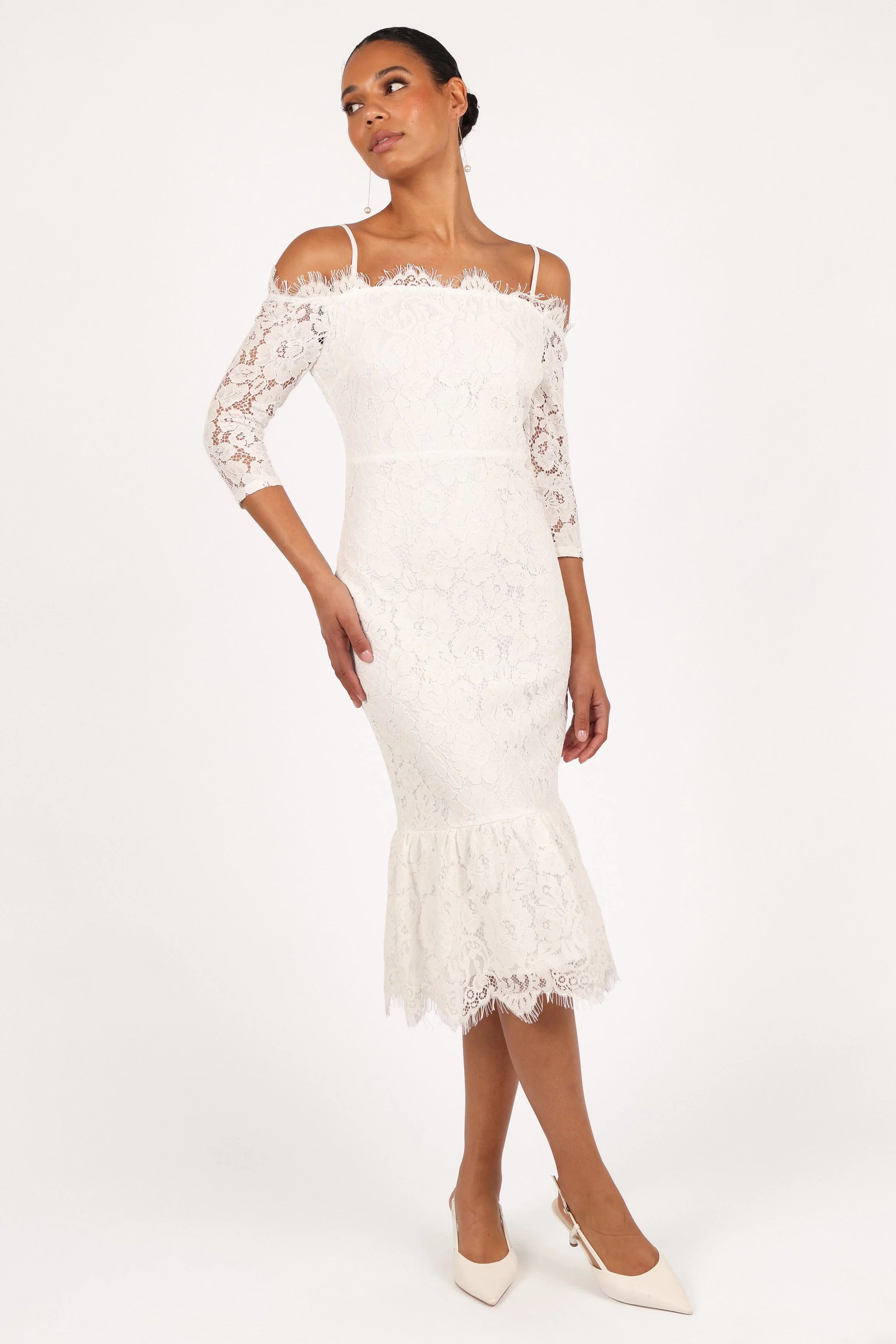| DETAILS This midi-length dress is designed to enhance your wardrobe with its timeless, yet trendy silhouette. The straight neckline frames your shoulders beautifully, offering a flattering off-shoulder look that exudes sophistication.