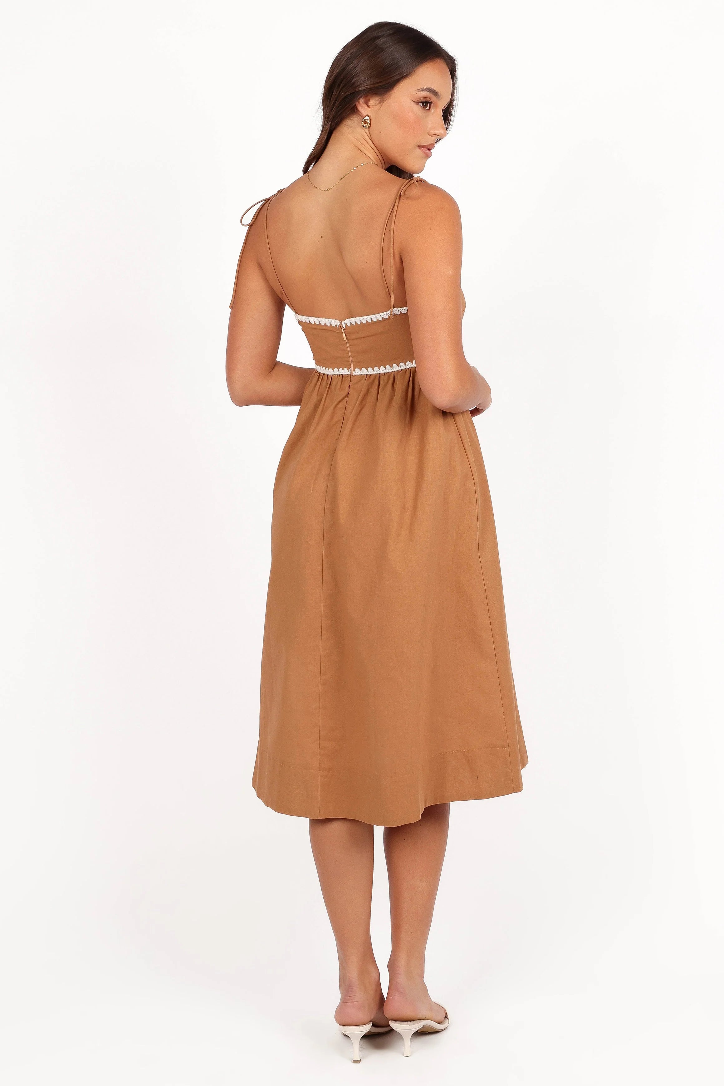 DETAILS Meet our darling Lino Contrast Trim Midi Dress in Tan White! This baby doll style frock features thin tie-close straps that fall over the shoulders to meet a chic square neckline. With a concealed back zip and a handy hook and eye clasp, you're assured a perfect fit.