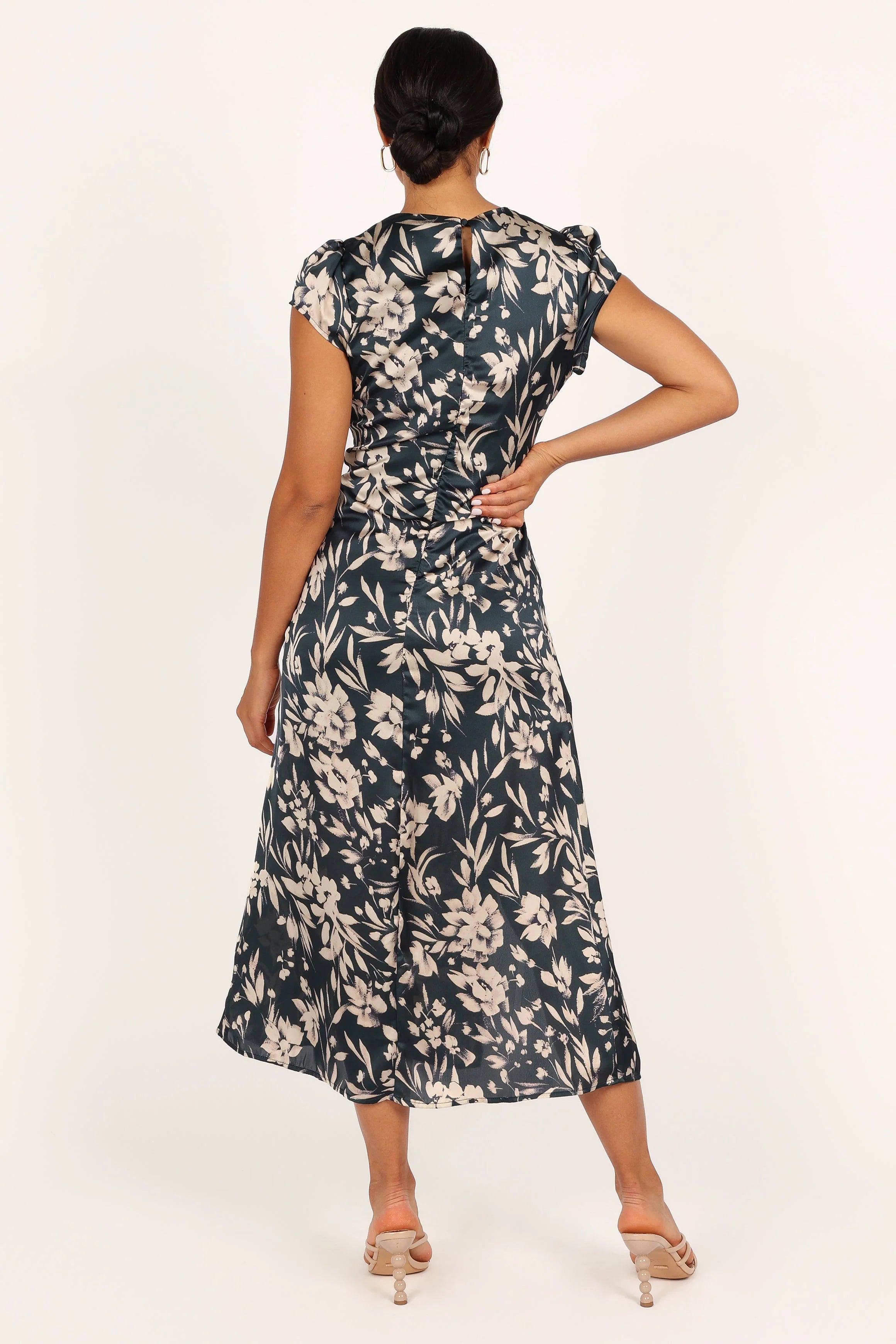 DETAILS Welcome to dress heaven! This dress is a must-have for any special occasion. Crafted with a midi length, round neckline and short sleeves, this dress will flatter your figure in all the right places. A back neck opening with button close and invisible zip makes it easy to slip on and off, while non functional buttons provide a fun, flirty detail.