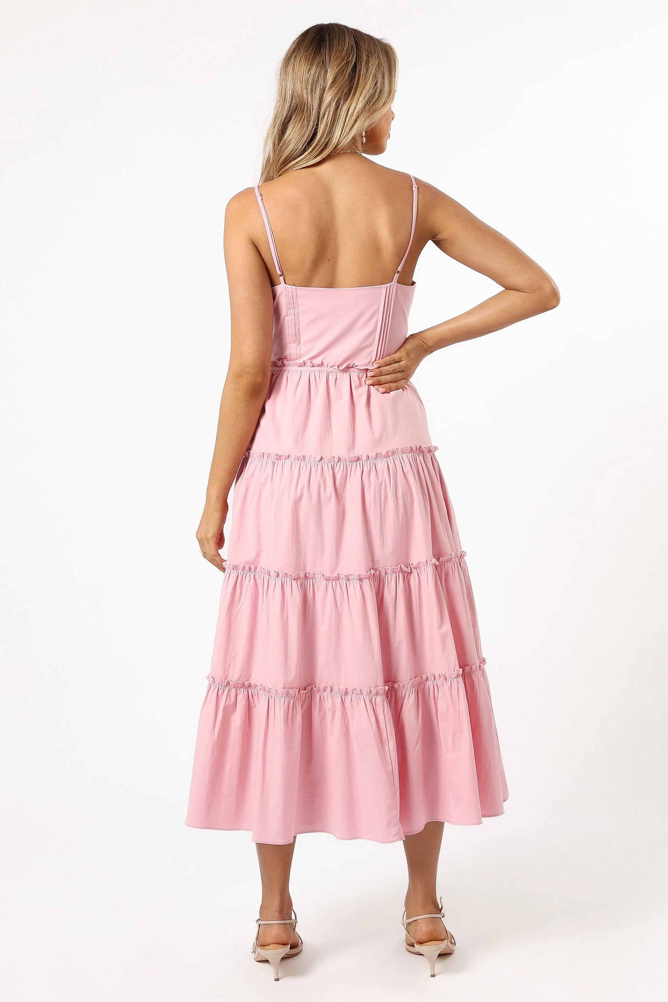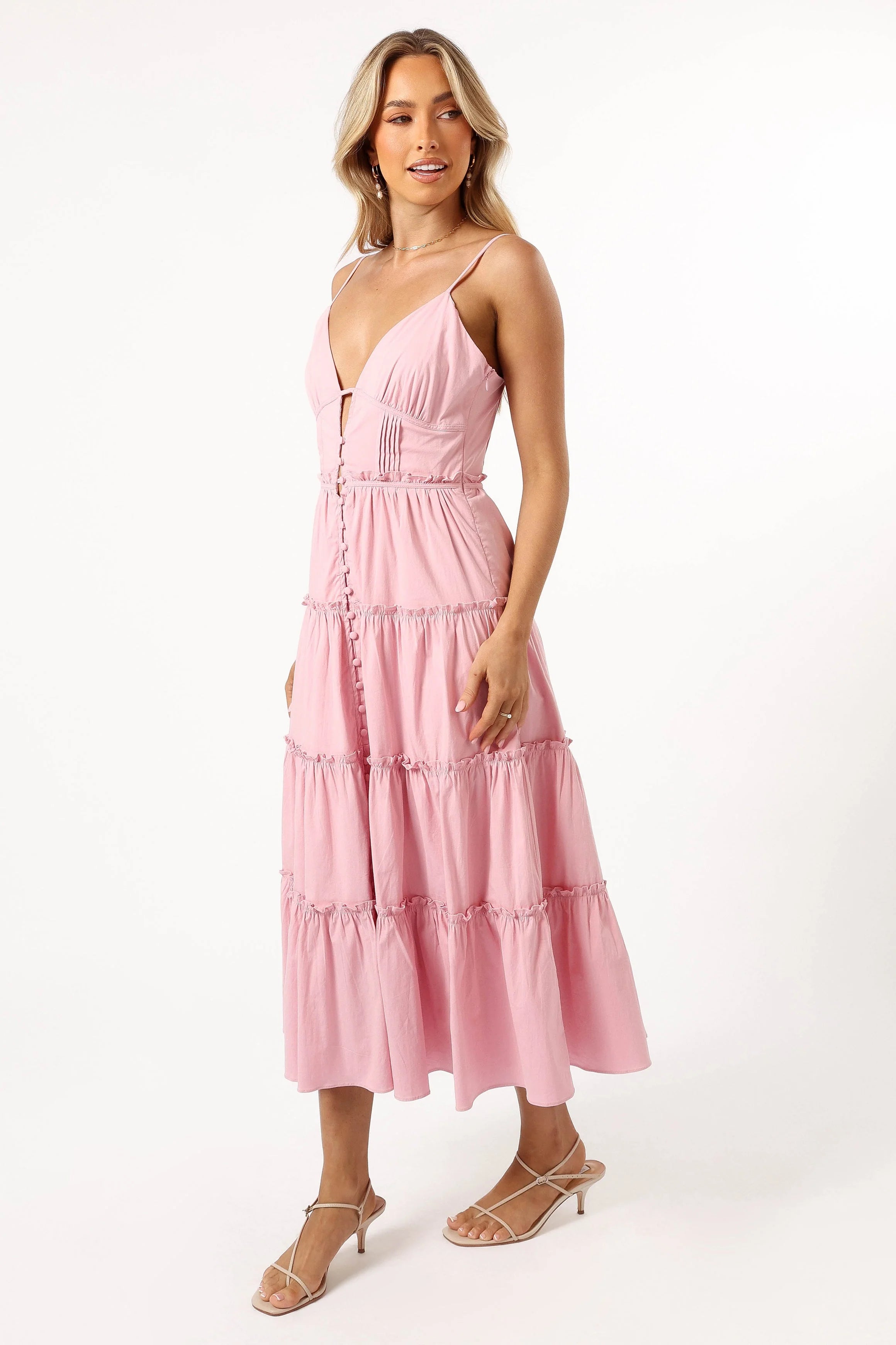 | DETAILS Step into the season with grace and flair with our Lizza Midi Dress in a delightful Pink shade. Tailored with a tasteful V neckline and delicate adjustable straps, it presents a perfect frame for both day and evening accessorising. Detail is not spared with the addition of intricate ruffles that gently cascade along the trim, leading to a drop tiered A-line skirt that sways with every step you take.