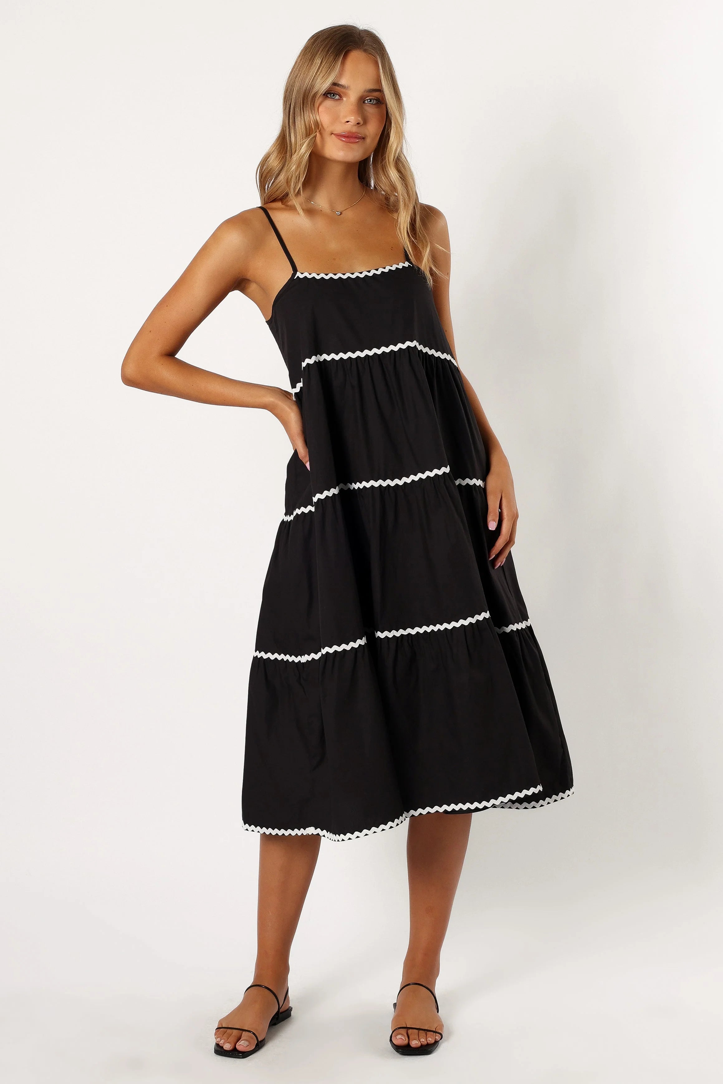 DETAILS This summer, you're sure to make a statement in our Loella Tiered Midi Dress! Featuring a straight neckline with thin adjustable shoulder straps, ric rac trim and a relaxed fit pull-on style is perfect for days spent outdoors.