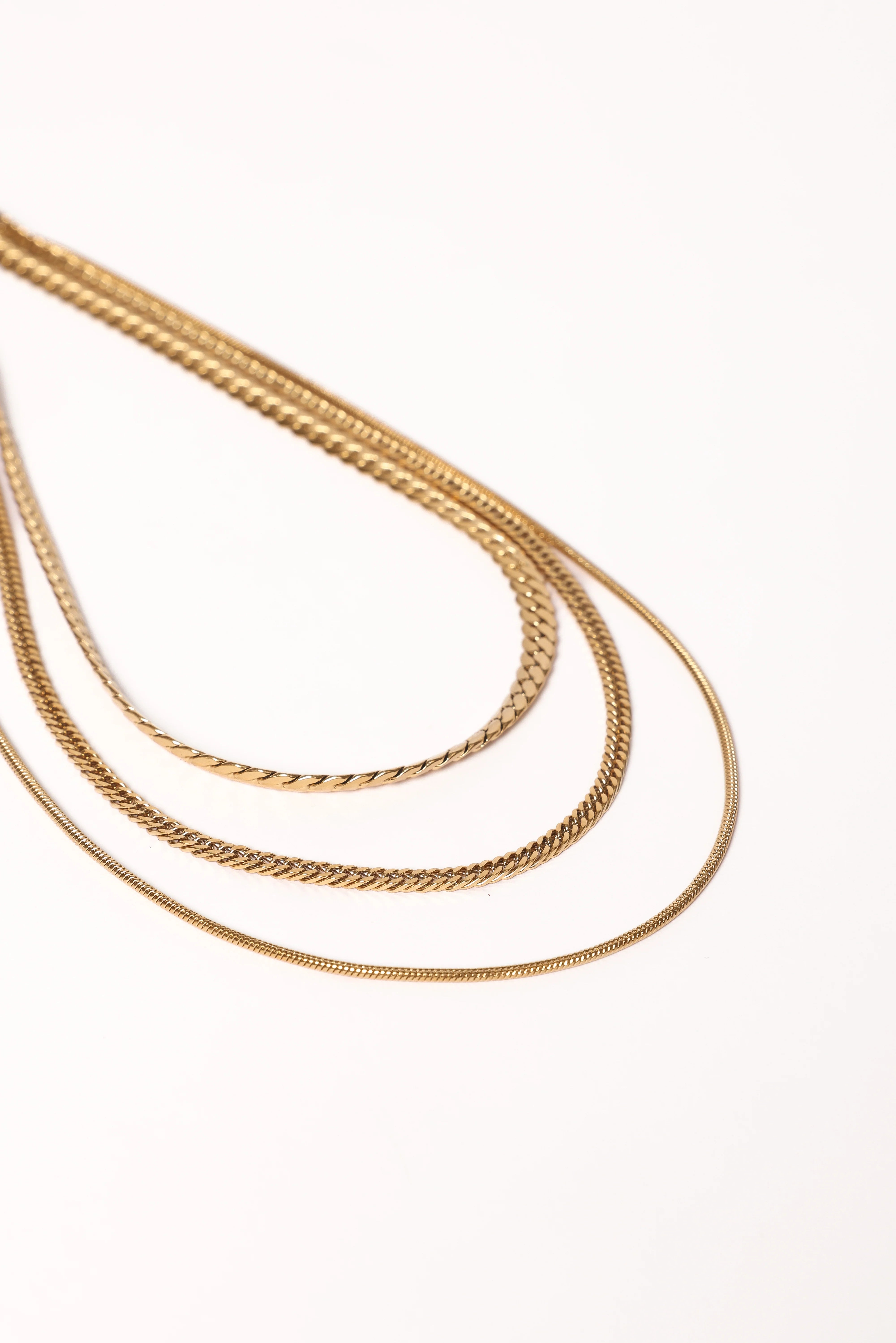 DETAILS Elevate your look effortlessly with the Logan Necklace in Gold, the ultimate statement piece for your accessory collection. This set of three layered chains brings a bold, multi-dimensional vibe with its intricate gold hardware and modern design.