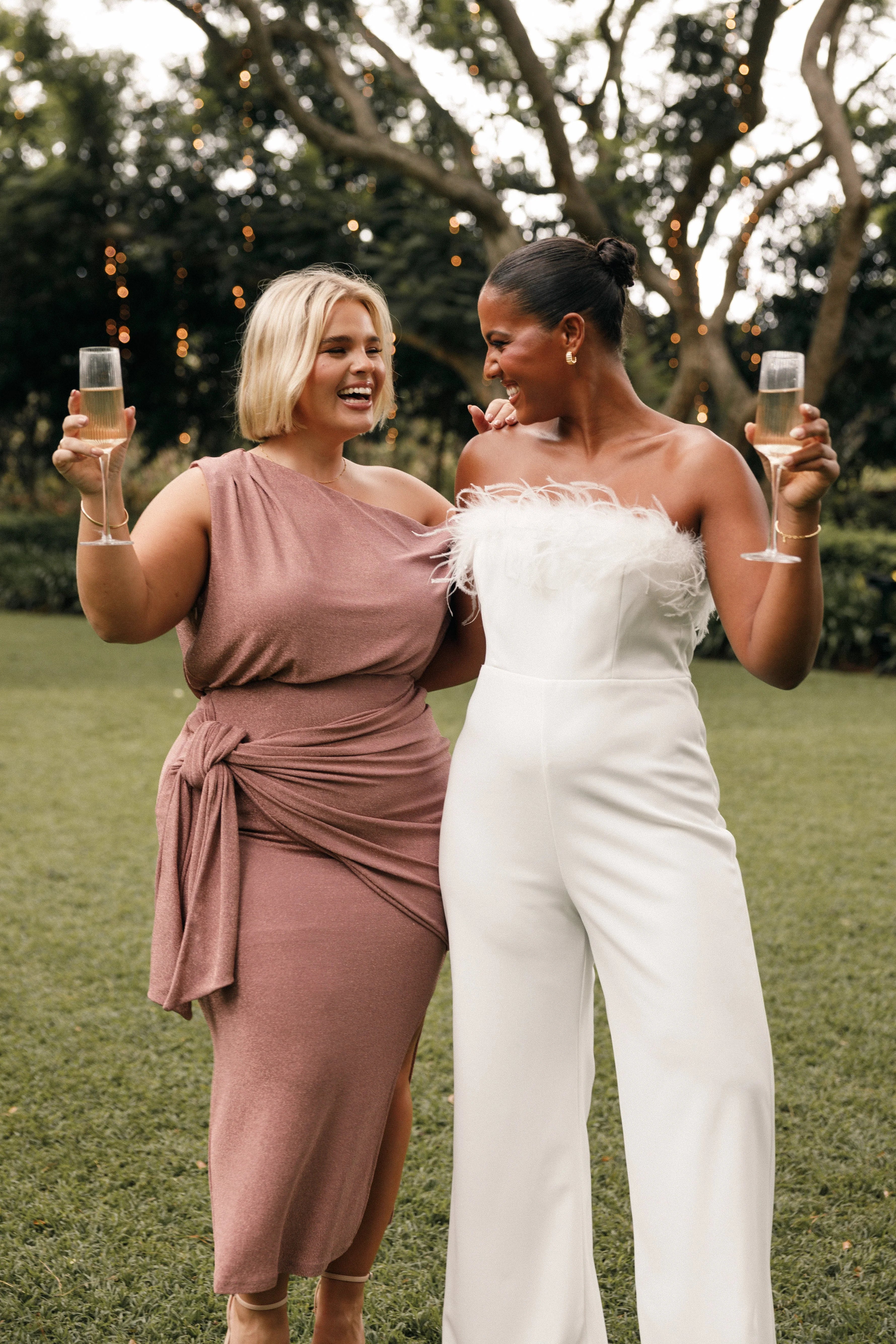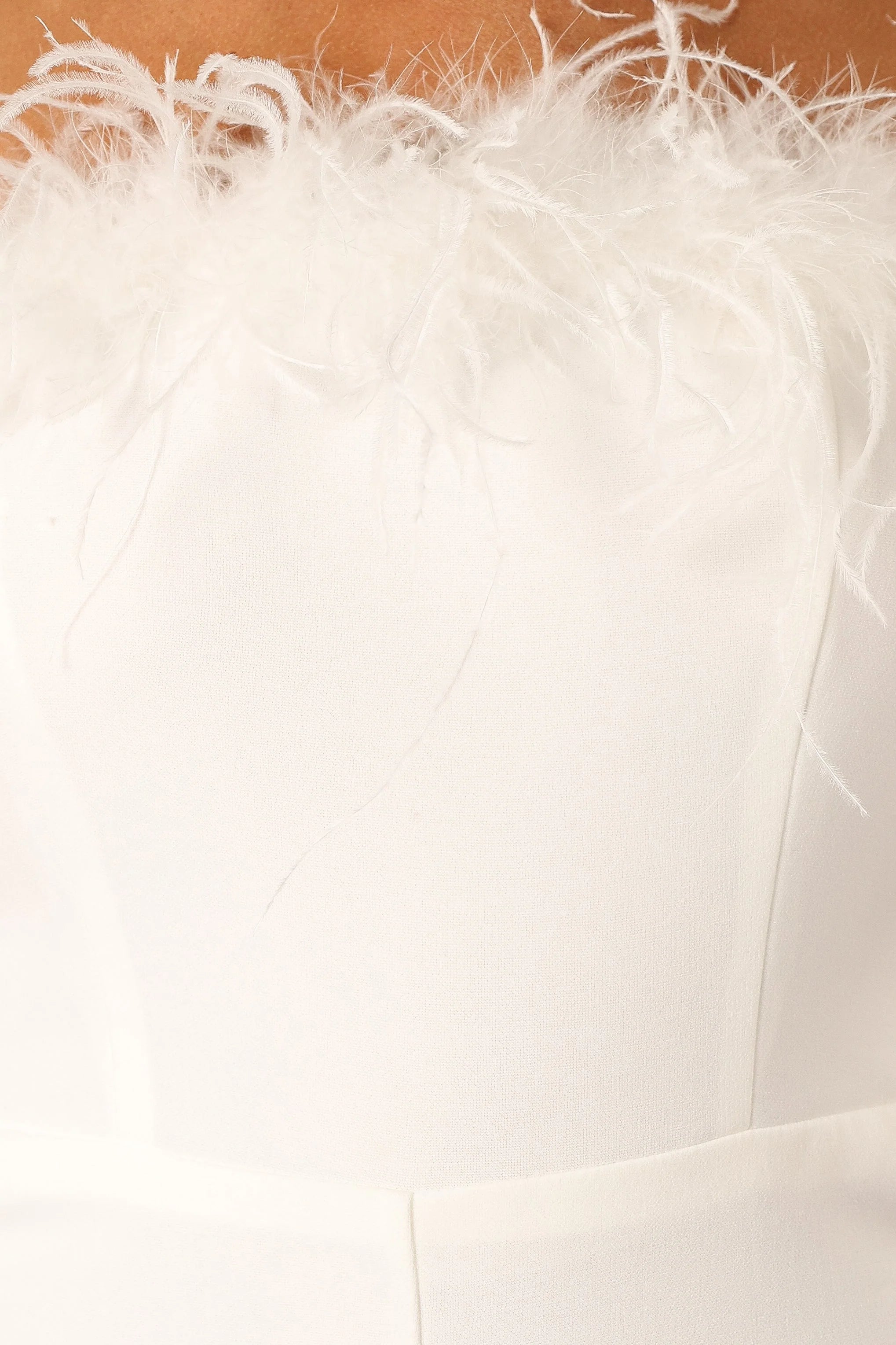 DETAILS Steal the scene with our feathered finesse! This strapless design exudes a playful vibe with a straight neckline adorned in plush feather trim. The invisible zip at the back secures the outfit and a hook and eye clasp adds a trendy touch, ensuring you're always in vogue.