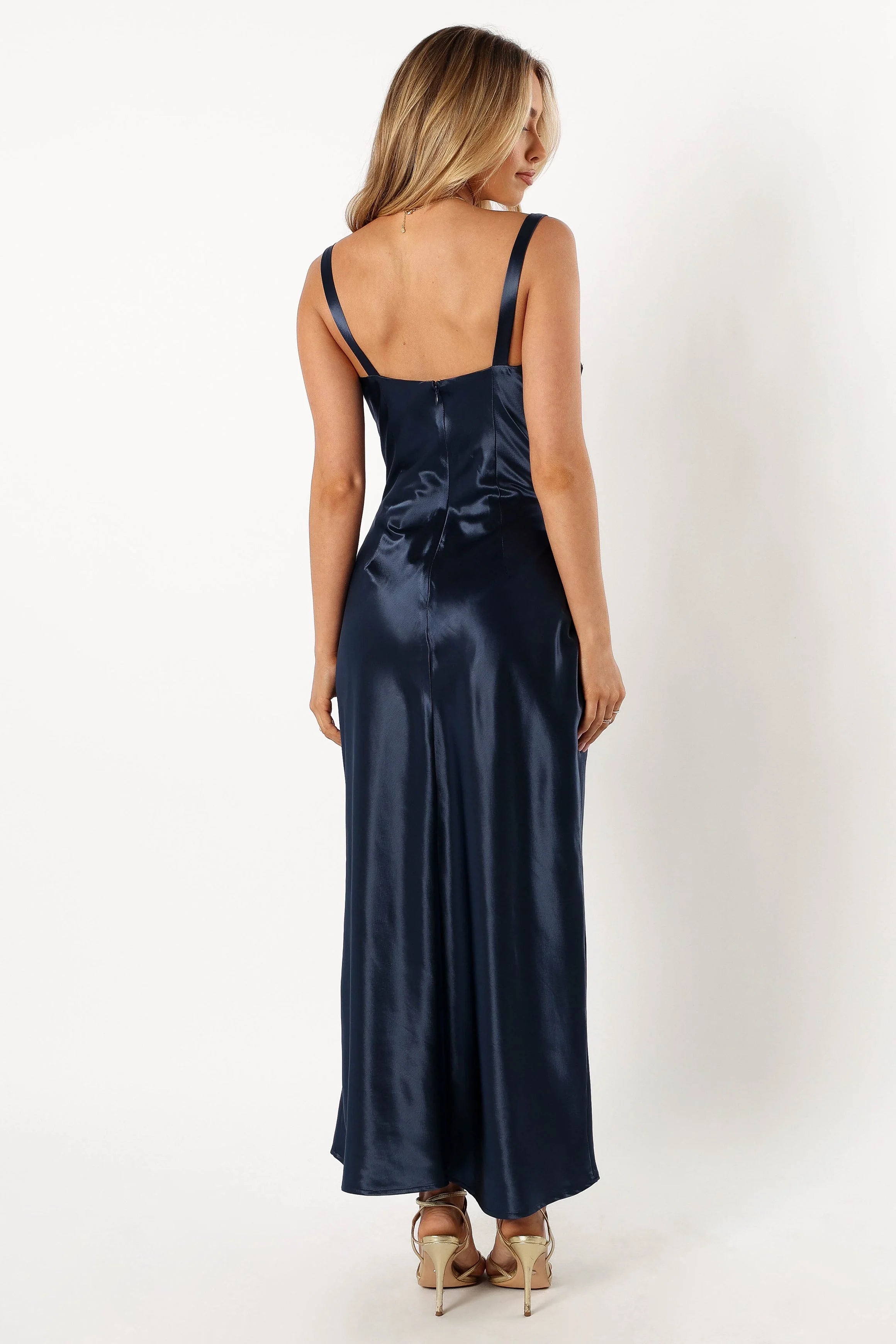 DETAILS Introducing the perfect head-turning maxi dress for any special occasion. The midi length, cowl neckline and thin buckle close straps give you an elegant look that will make a statement at your next event.