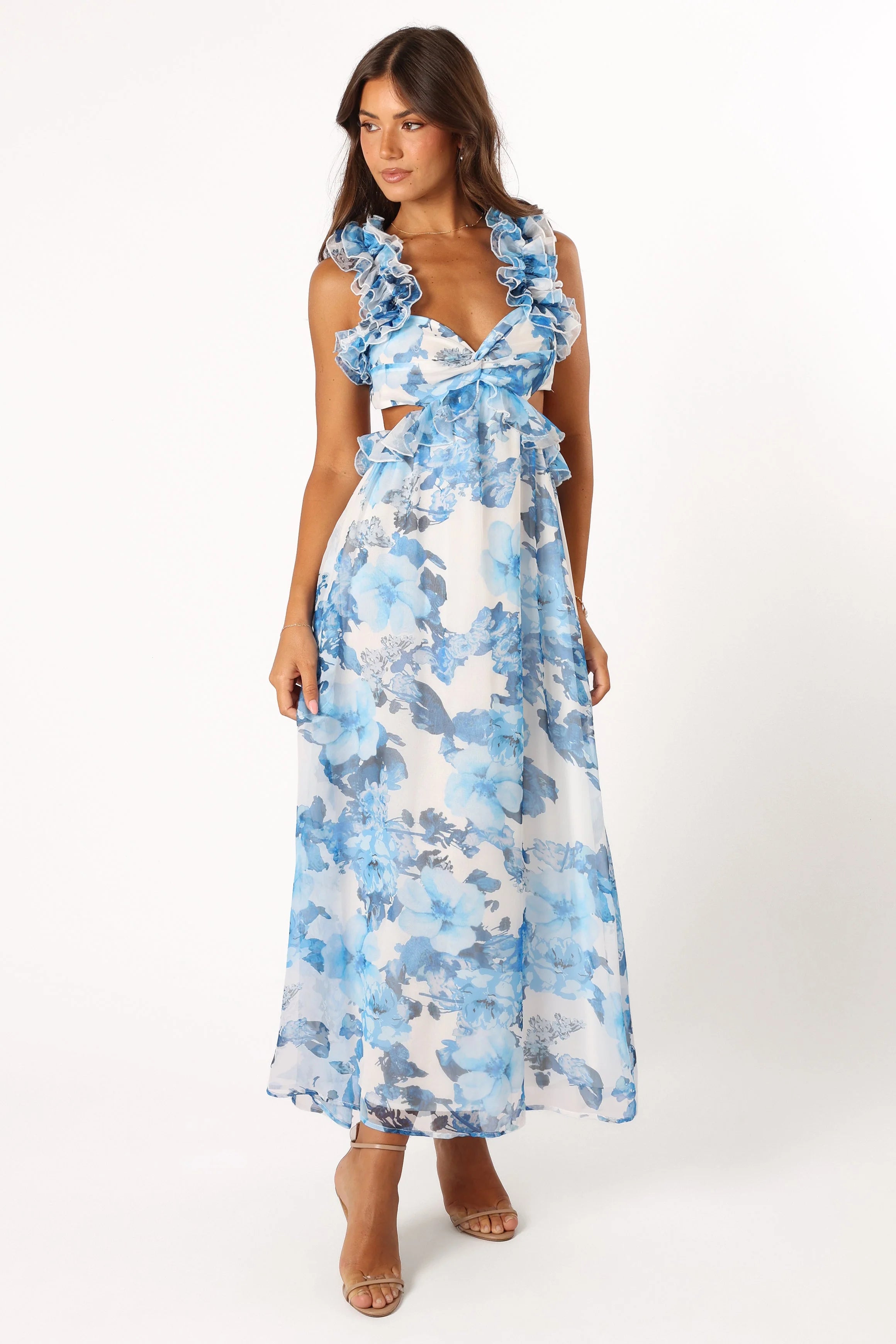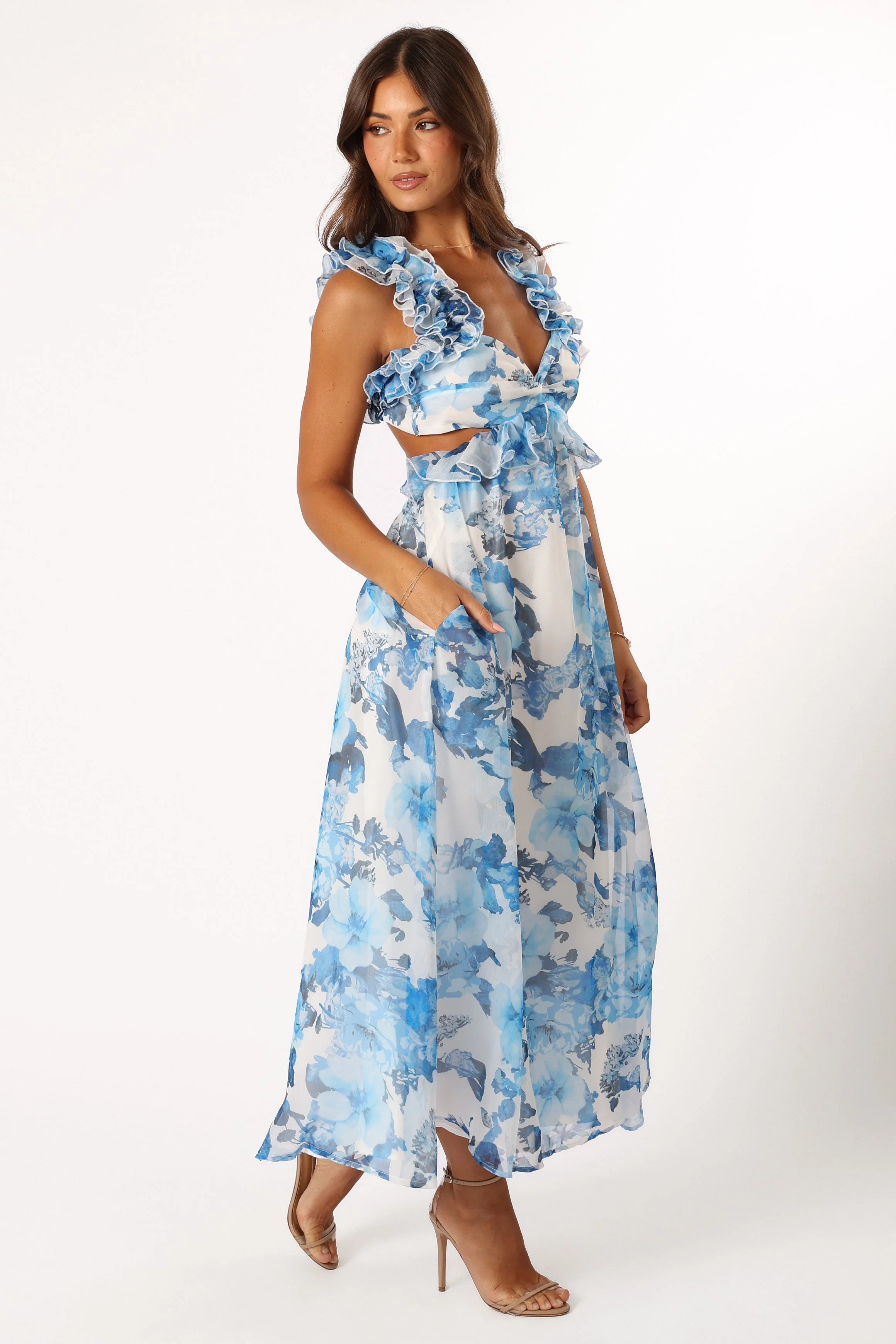 DETAILS Playfully chic with a dash of fun flair, this maxi length dress is a fashion-forward statement for any event. It features a v-neckline, perfectly complemented by a sleeveless design adorned with ruffle edging, for a look that screams trendy.