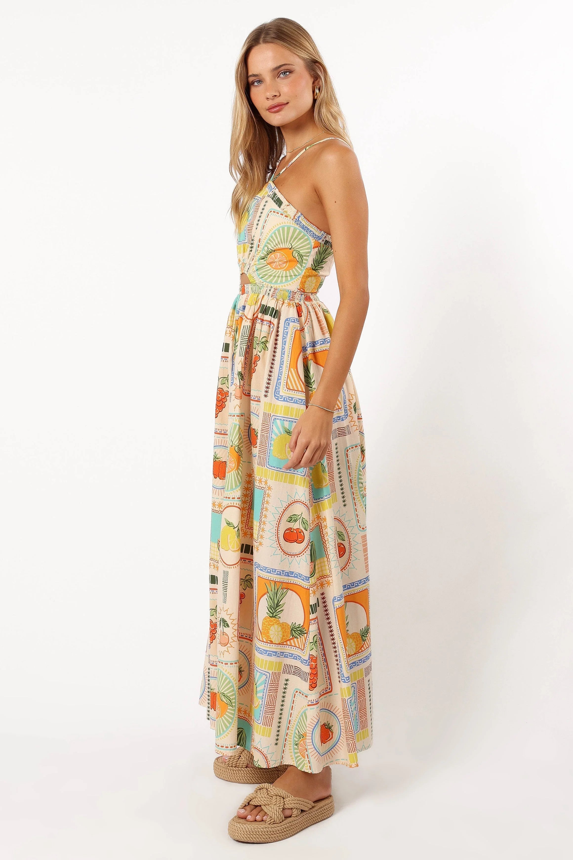 | DETAILS Meet our playful yet trendy Madeira Dress! With its captivating large fruit print, halterneck neckline, and cute cut-out detail under the bust, you're in for a trendy twist. Its shirred elasticised waistband and handy pockets add a dash of practicality to this fashion-forward piece.