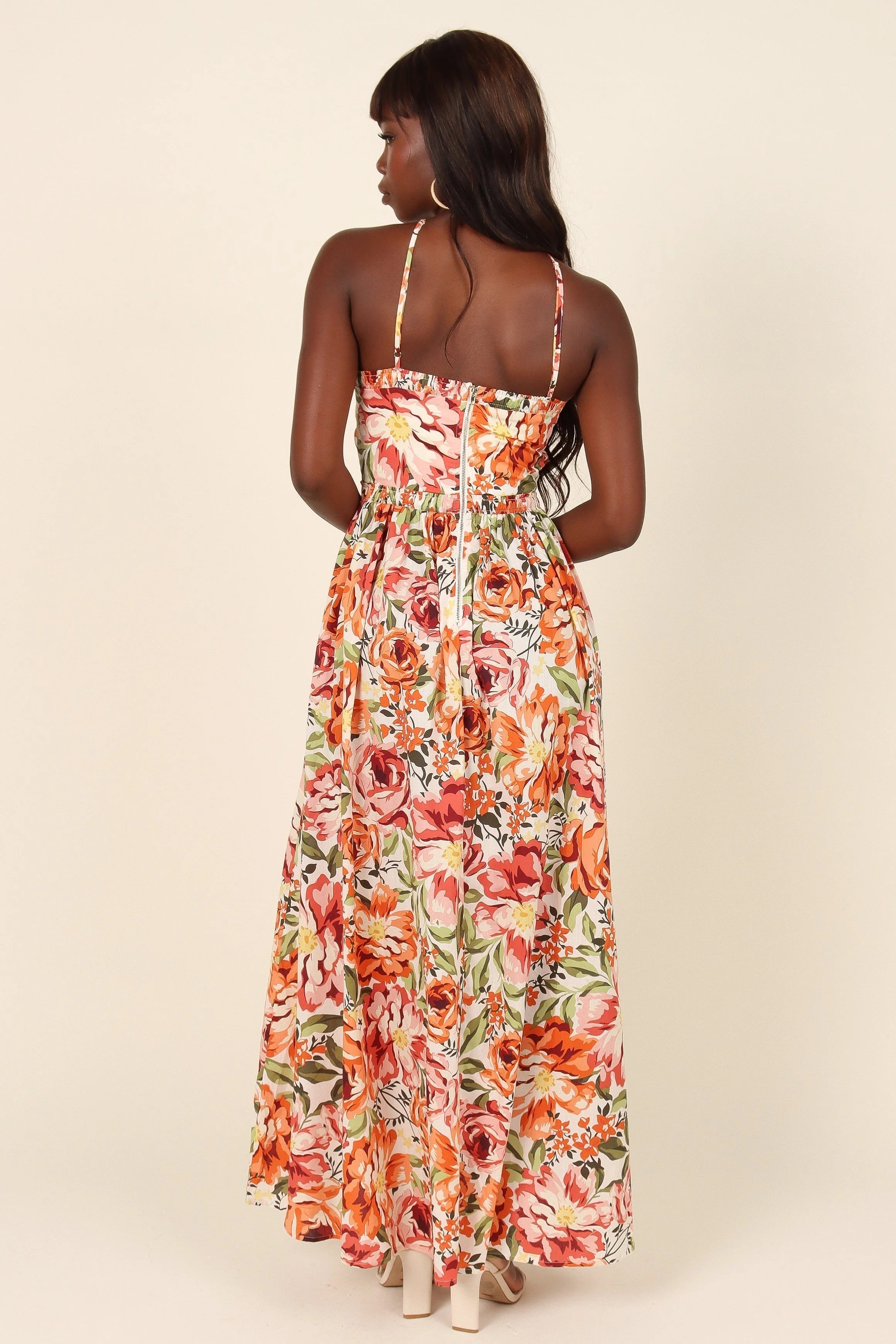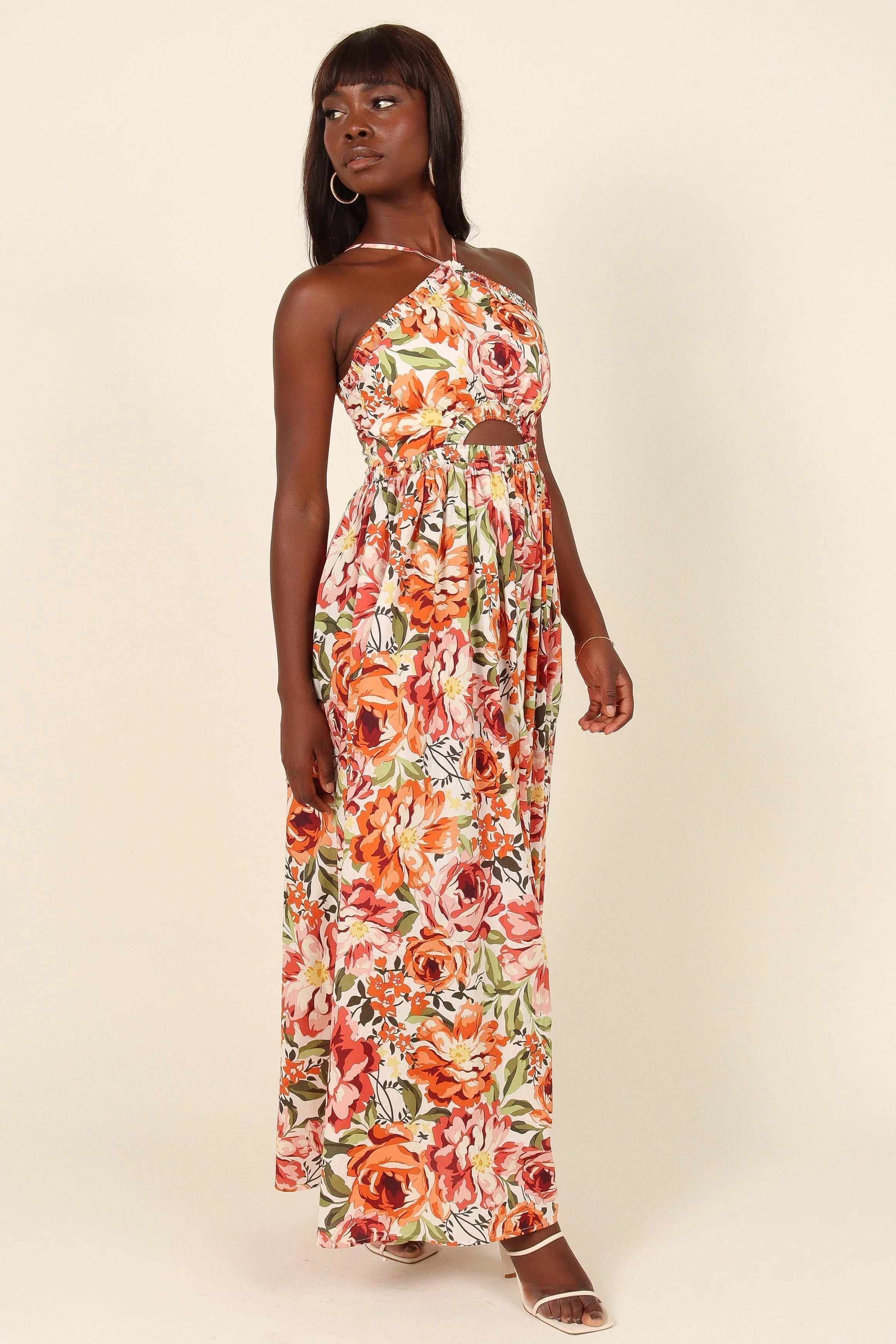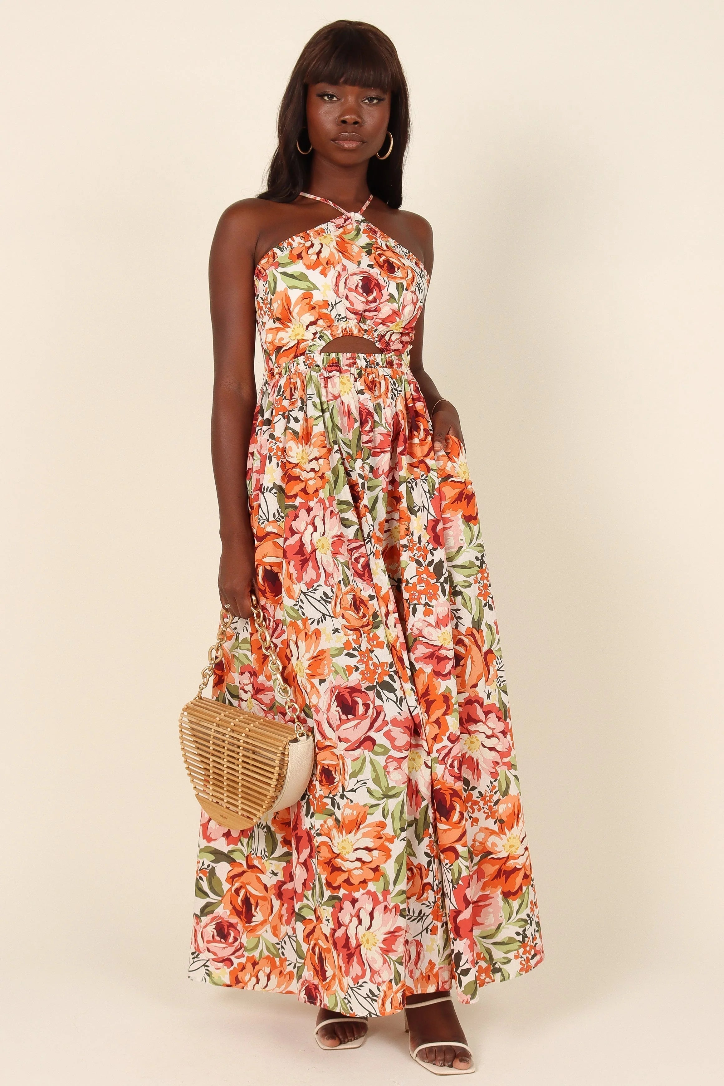 DETAILS Meet our playful yet trendy Madeira Dress! With its captivating orange floral print, flirty halterneck, and cute cut-out detail under the bust, you're in for a trendy twist. Its shirred elasticised waistband and handy pockets add a dash of practicality to this fashion-forward piece.