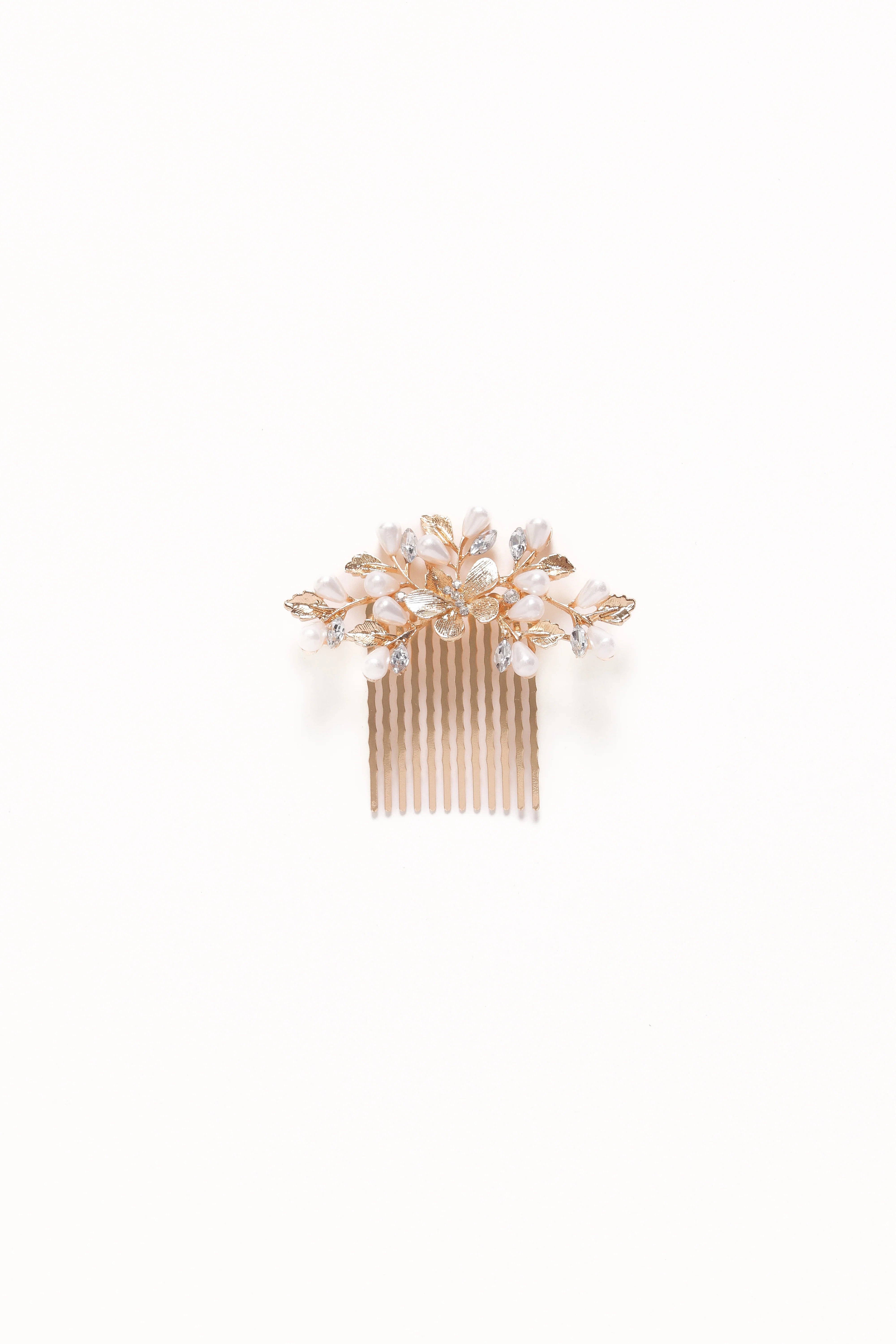 | DETAILS Add a touch of elegance to any look with the Madelaine Hair Comb in Gold and Pearl. Featuring a delicate floral design accented with shimmering rhinestones and soft faux pearls, this piece instantly elevates your hairstyle.