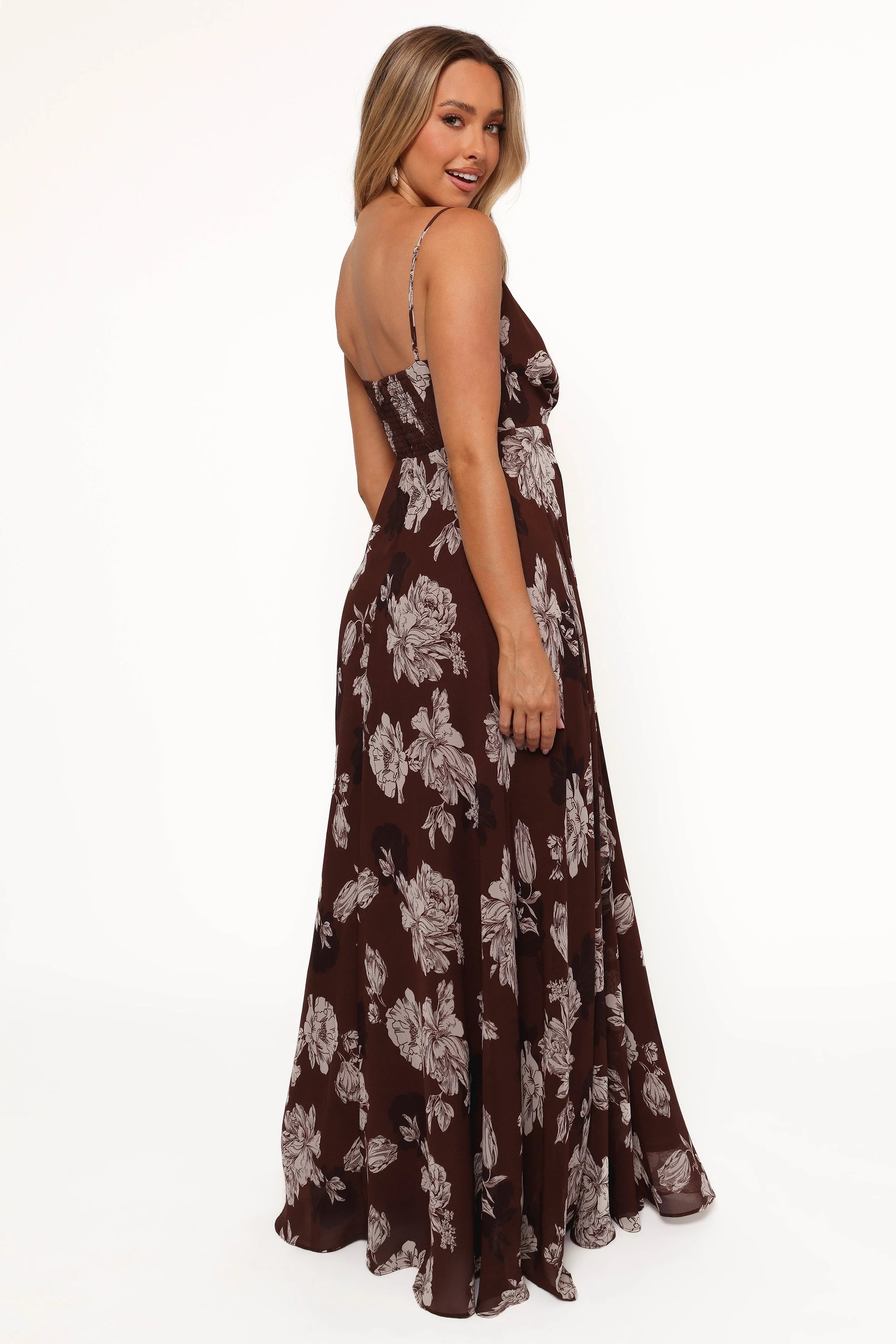 | DETAILS This maxi dress is a must have for your next event. It features an overlay neckline with hook and eye clasp, thin adjustable straps, shirred back panel and an invisible zip up the back with a hook and eye closure. The drop a-line skirt adds movement to the dress while the floral print gives it a fun, yet elegant touch.