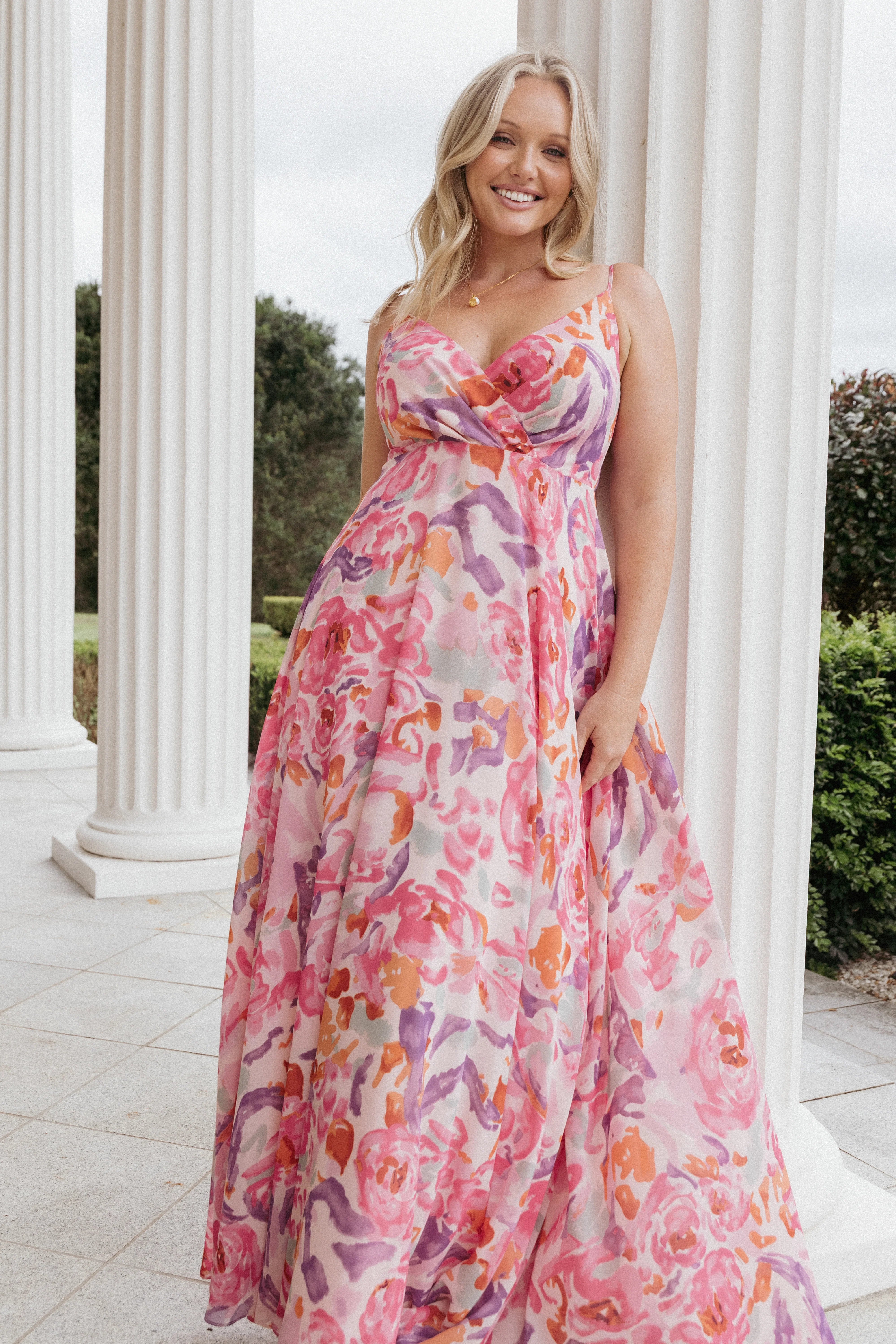 DETAILS This maxi dress is a must have for your next event. It features an overlay neckline with hook and eye clasp, thin adjustable straps, shirred back panel and an invisible zip up the back with a hook and eye closure. The drop a-line skirt adds movement to the dress while the floral print gives it a fun, yet elegant touch.
