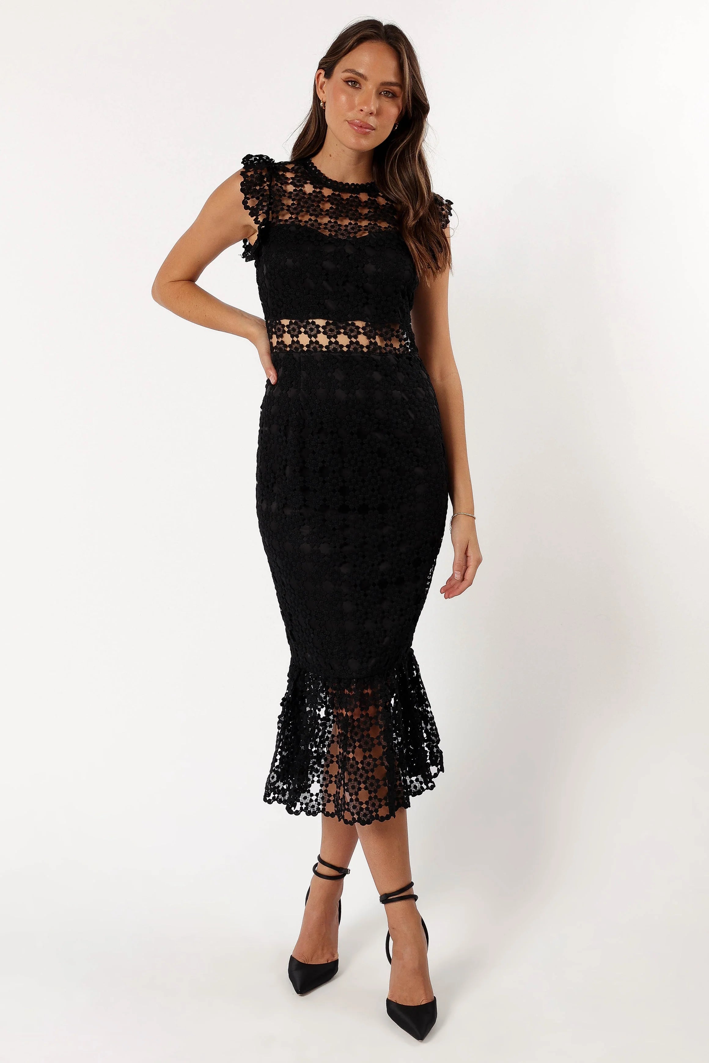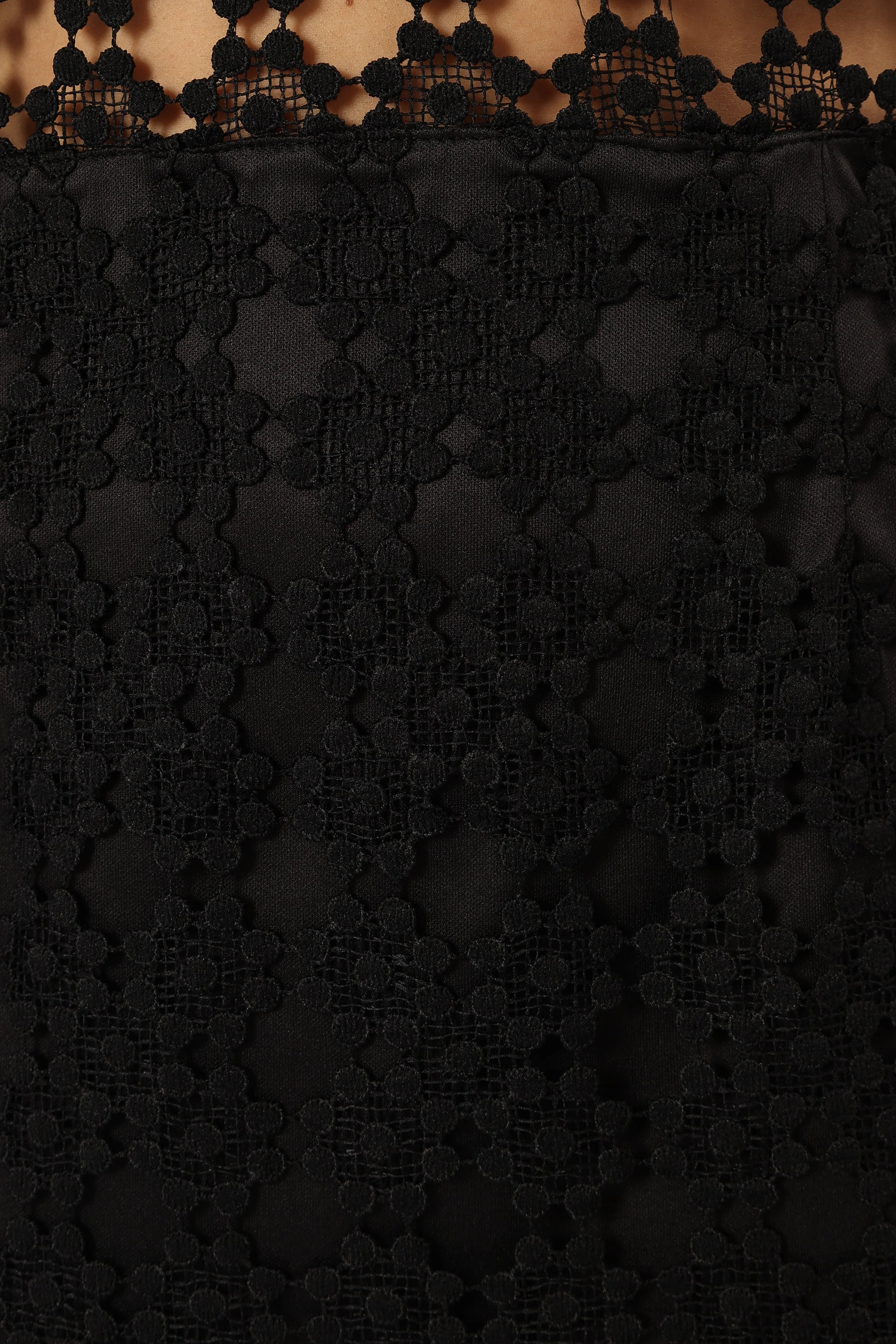 DETAILS This midi length dress is perfect for special occasions and events. The high round neckline and back invisible zip will keep you comfortable while dancing the night away. And with a lace overlay, it's sure to add a touch of glamour to any event.