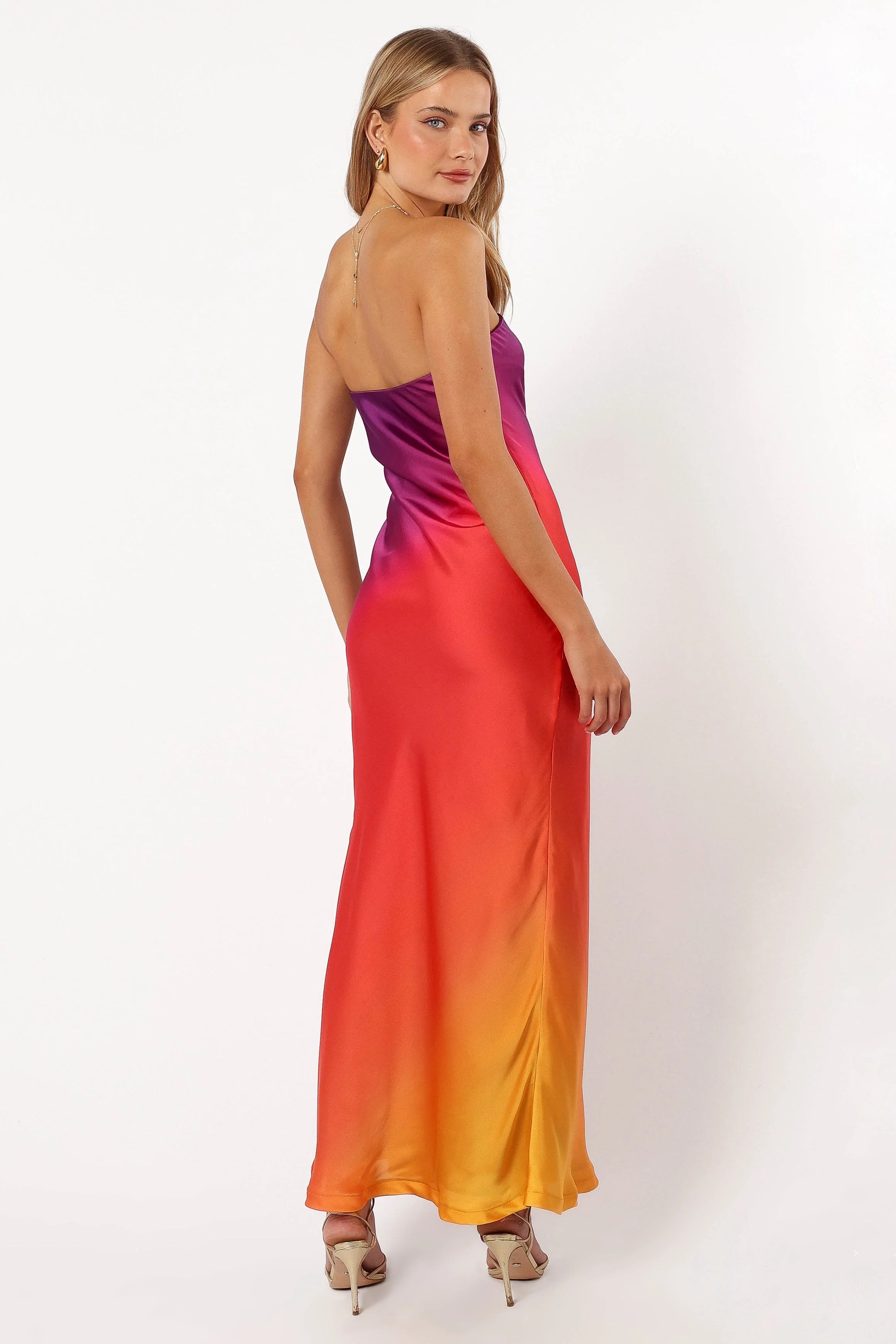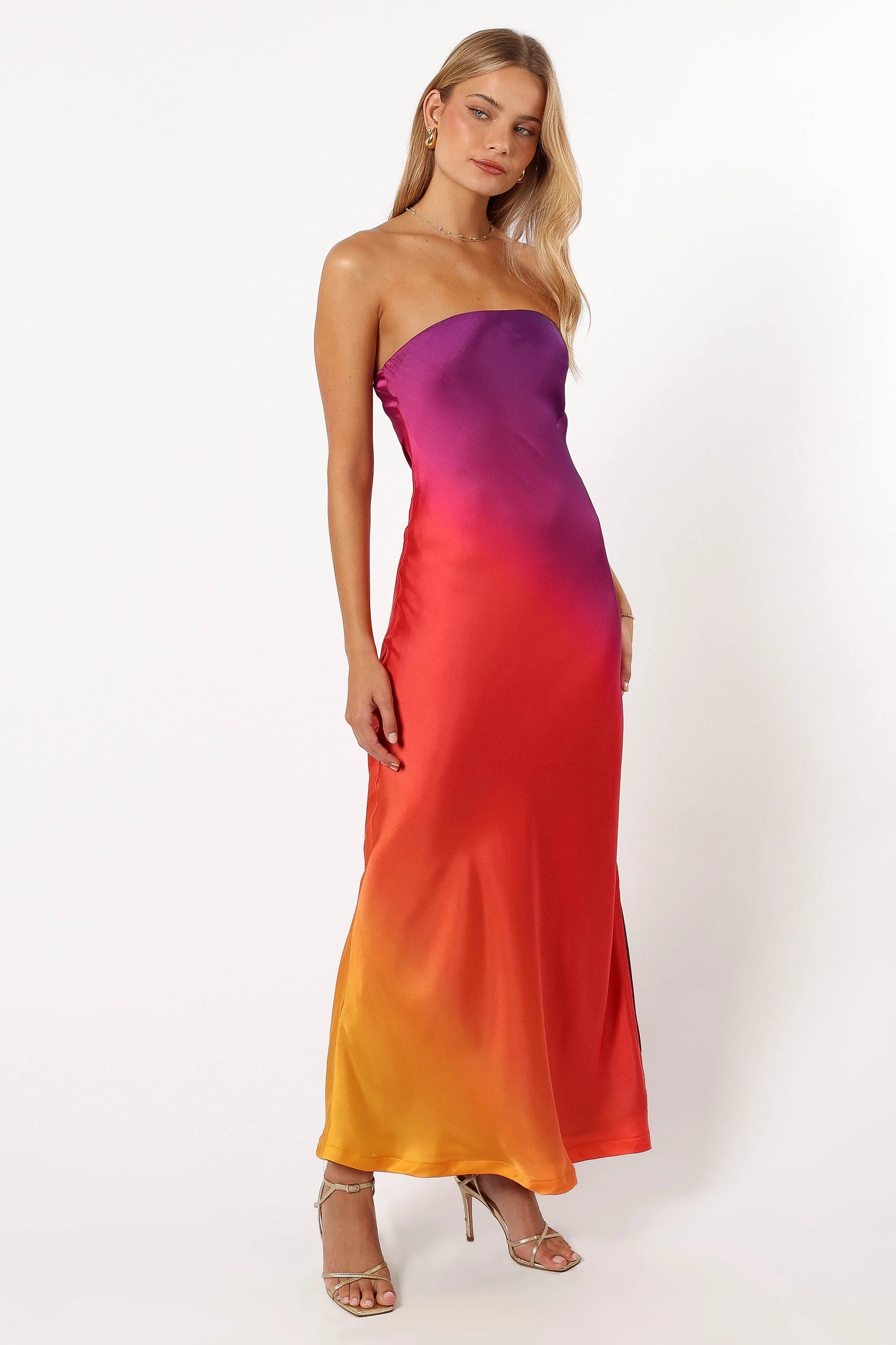 DETAILS This maxi length strapless dress is perfect for special occasions and events. Featuring a side split detail, pull on design, and satin sheen finish, this look will be sure to turn heads at any event.