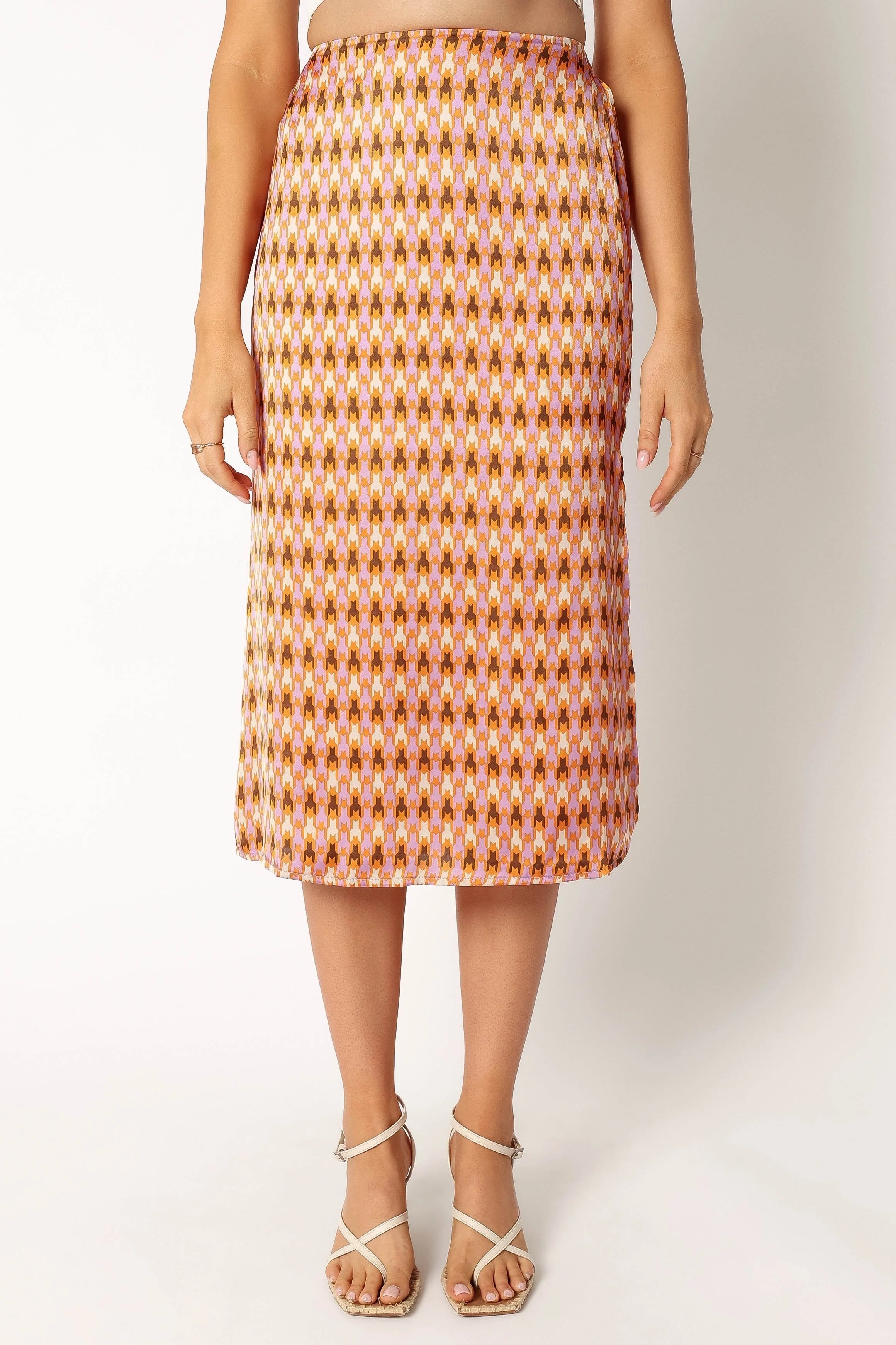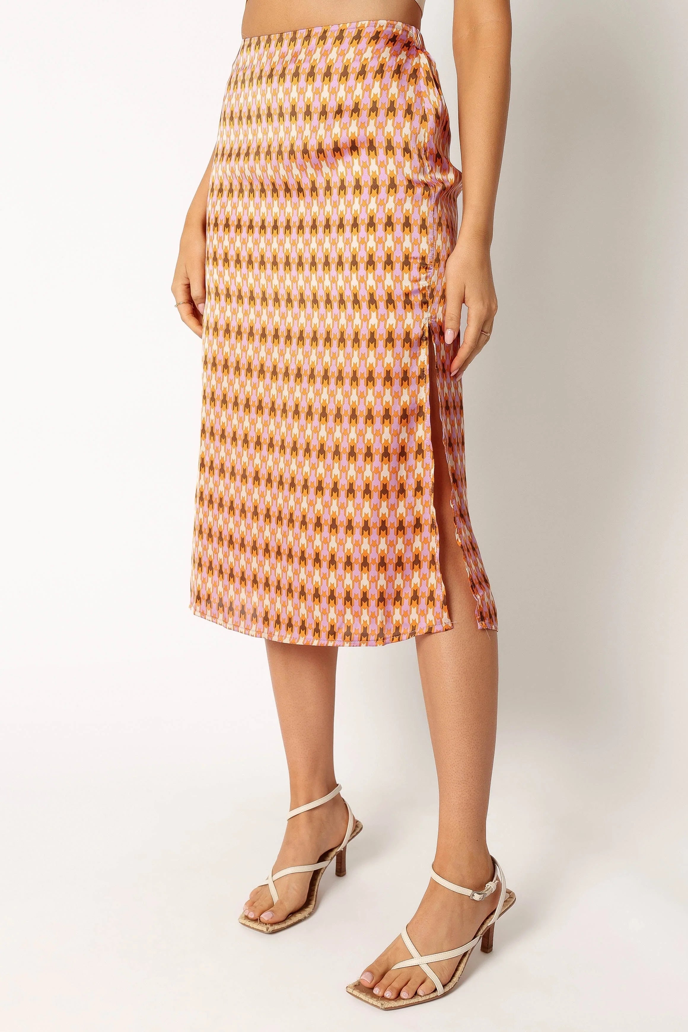 DETAILS This geometric print design A-line skirt made from a soft satin fabric is truly an eye catcher. It features a midi length, back invisible zip with hook and eye clasp and a statement side split detail for added drama.