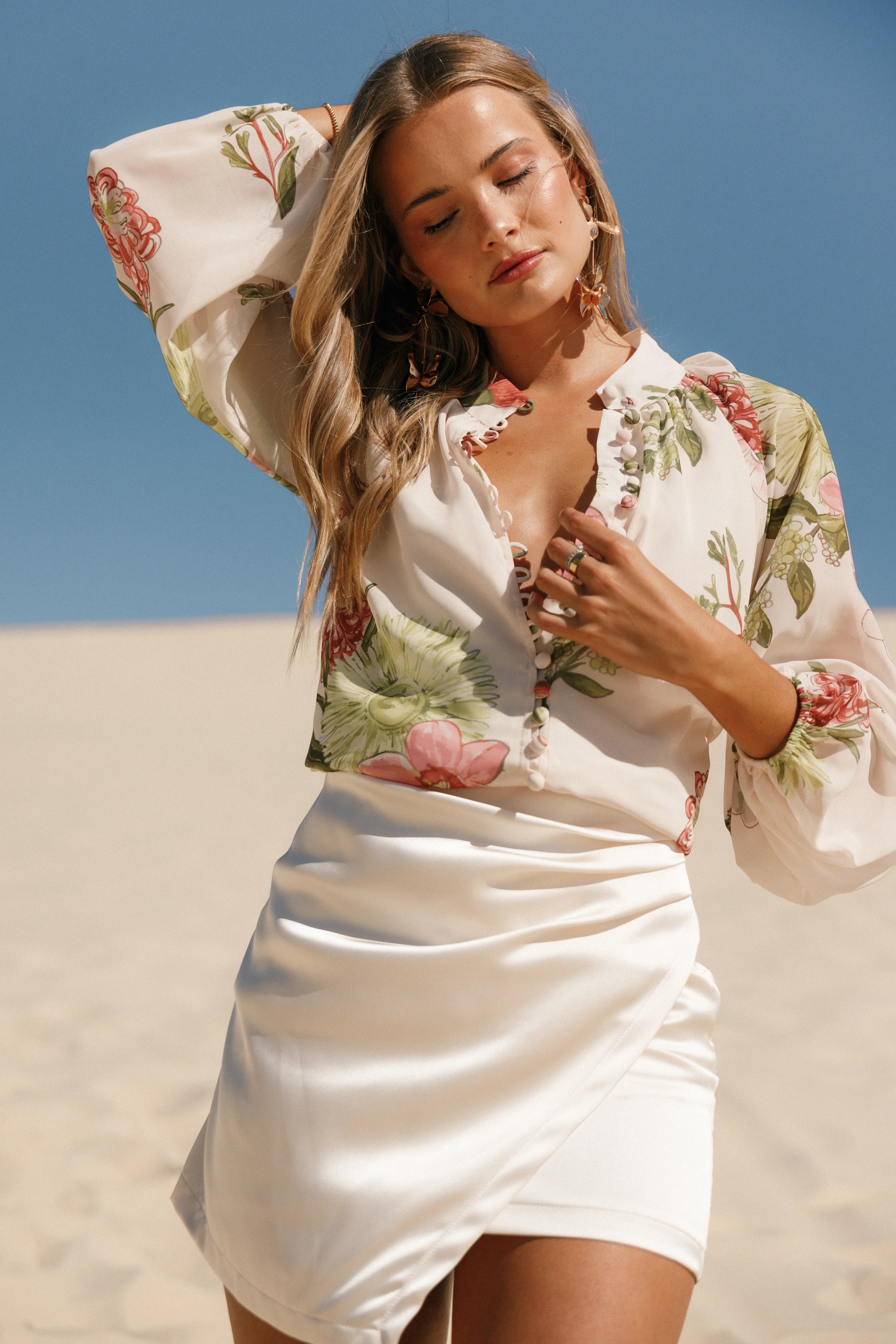 DETAILS This blouse-style top is a wardrobe must-have! It features a high round neckline, functional buttons down the front and long sleeves with elasticised cuff. The beautiful floral print adds a fun chic look.